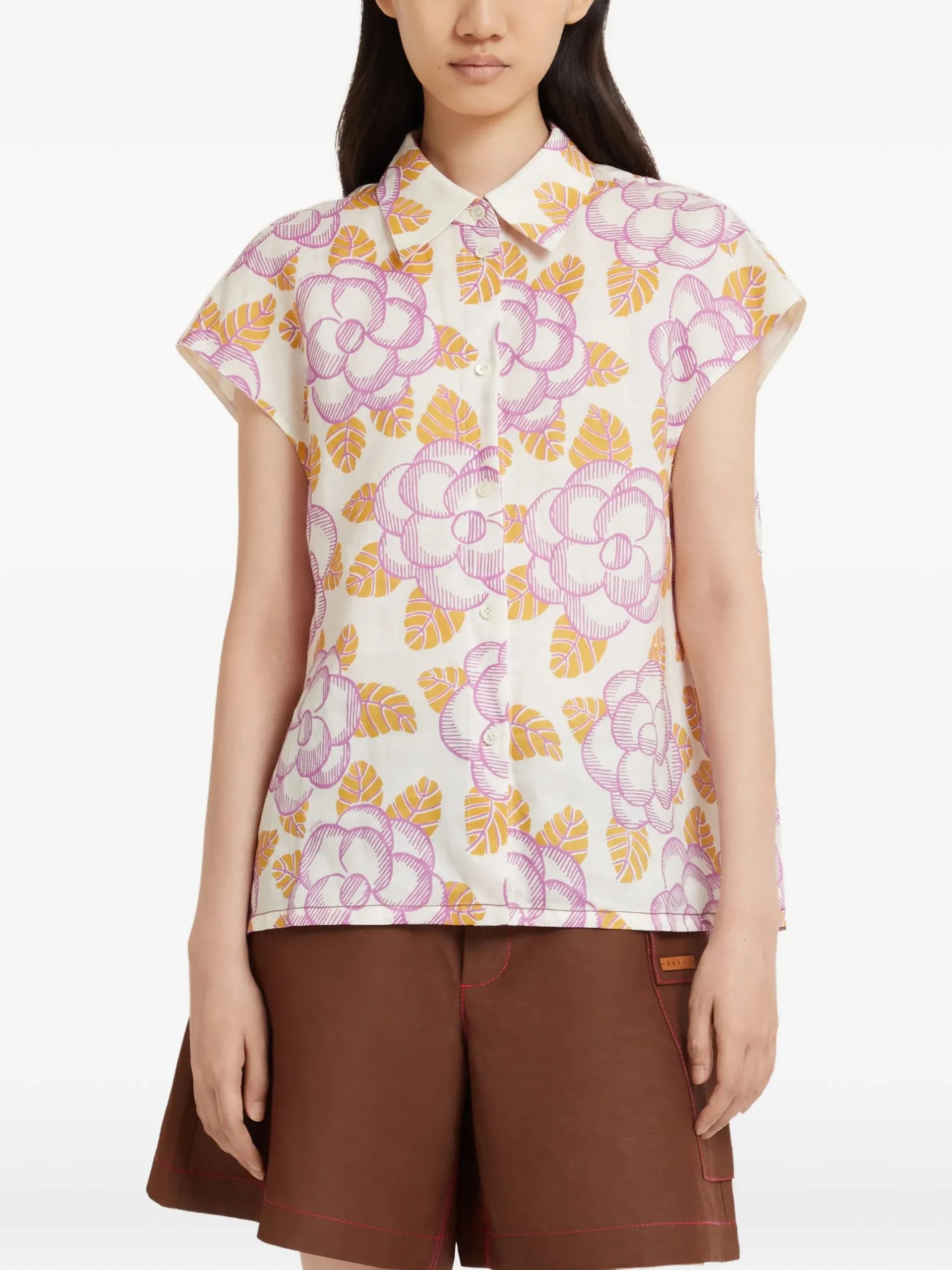 Camasa Marni Floral cap-sleeved, din linia Prints Iconic, cu imprimeu floral, inchidere cu nasturi, maneci tip cap sleeve, logo brodat si detaliu incretit la spate. 100% in