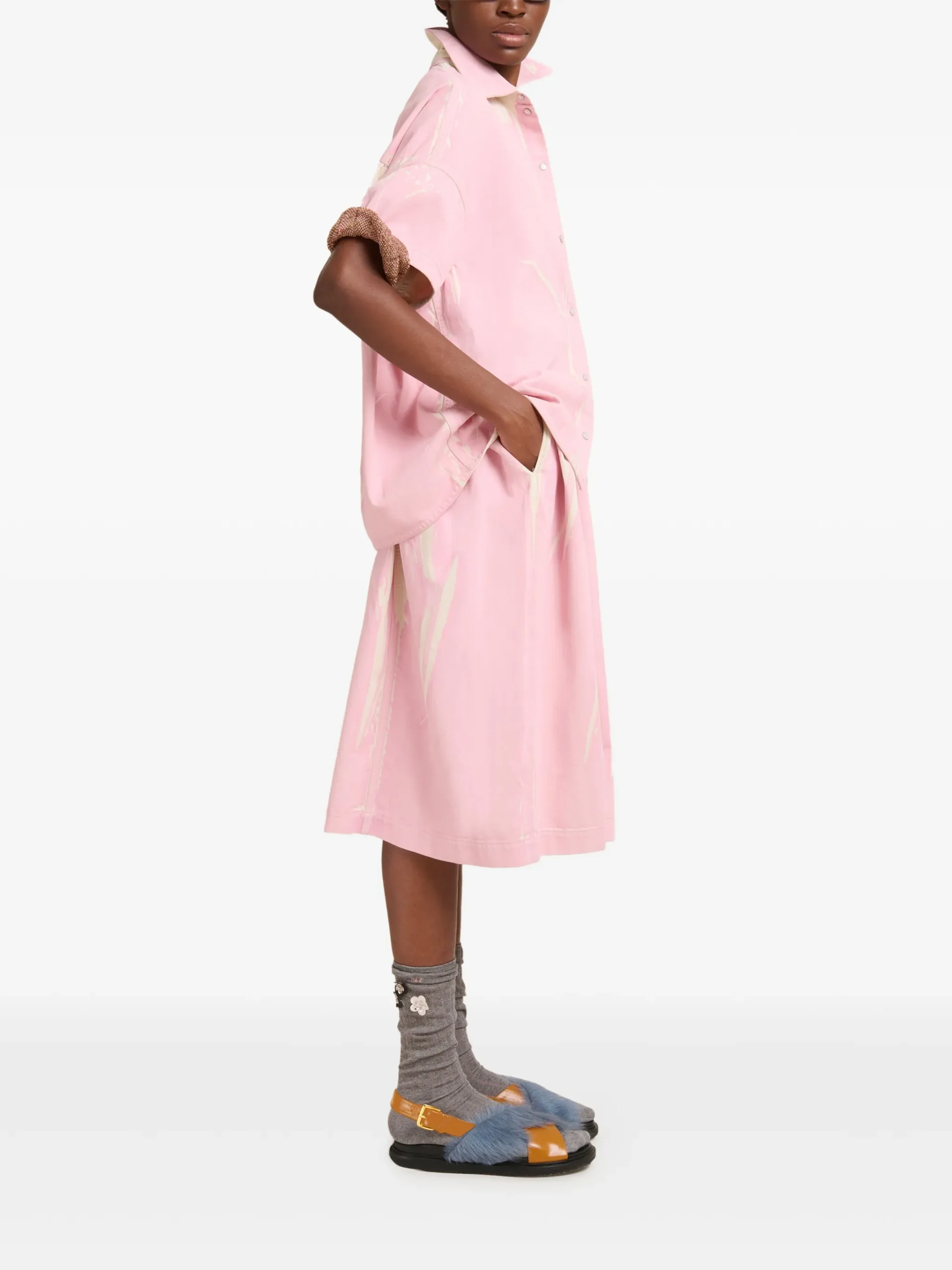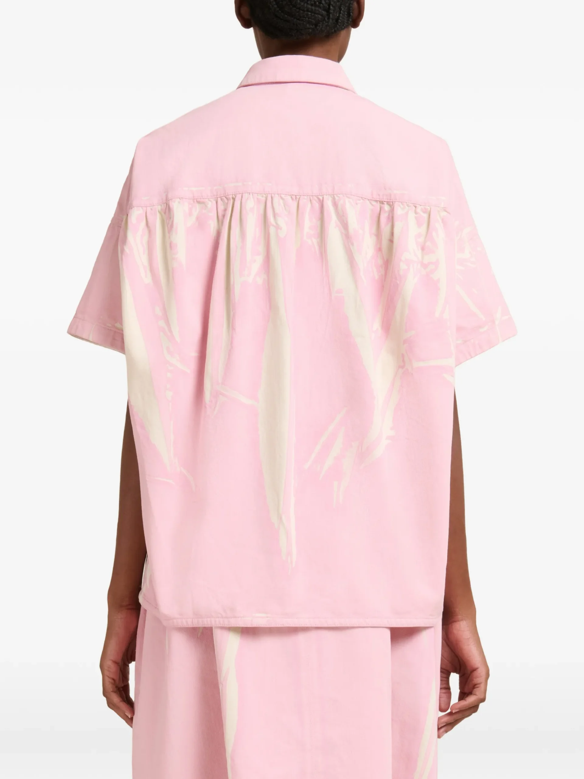 Camasa Marni cu maneci scurte roz, cu imprimeu tip „irregular strokes”, inchidere cu capse, logo aplicat pe piept si spate cu platca usor incretita. 100% bumbac