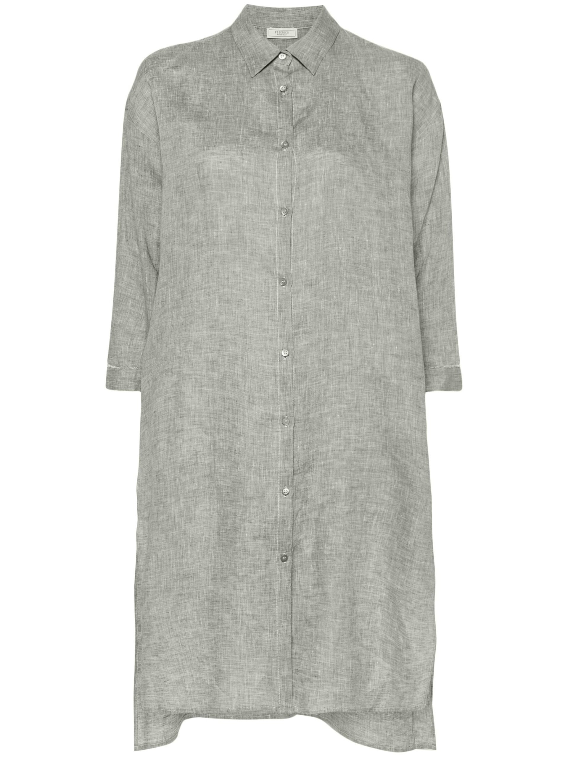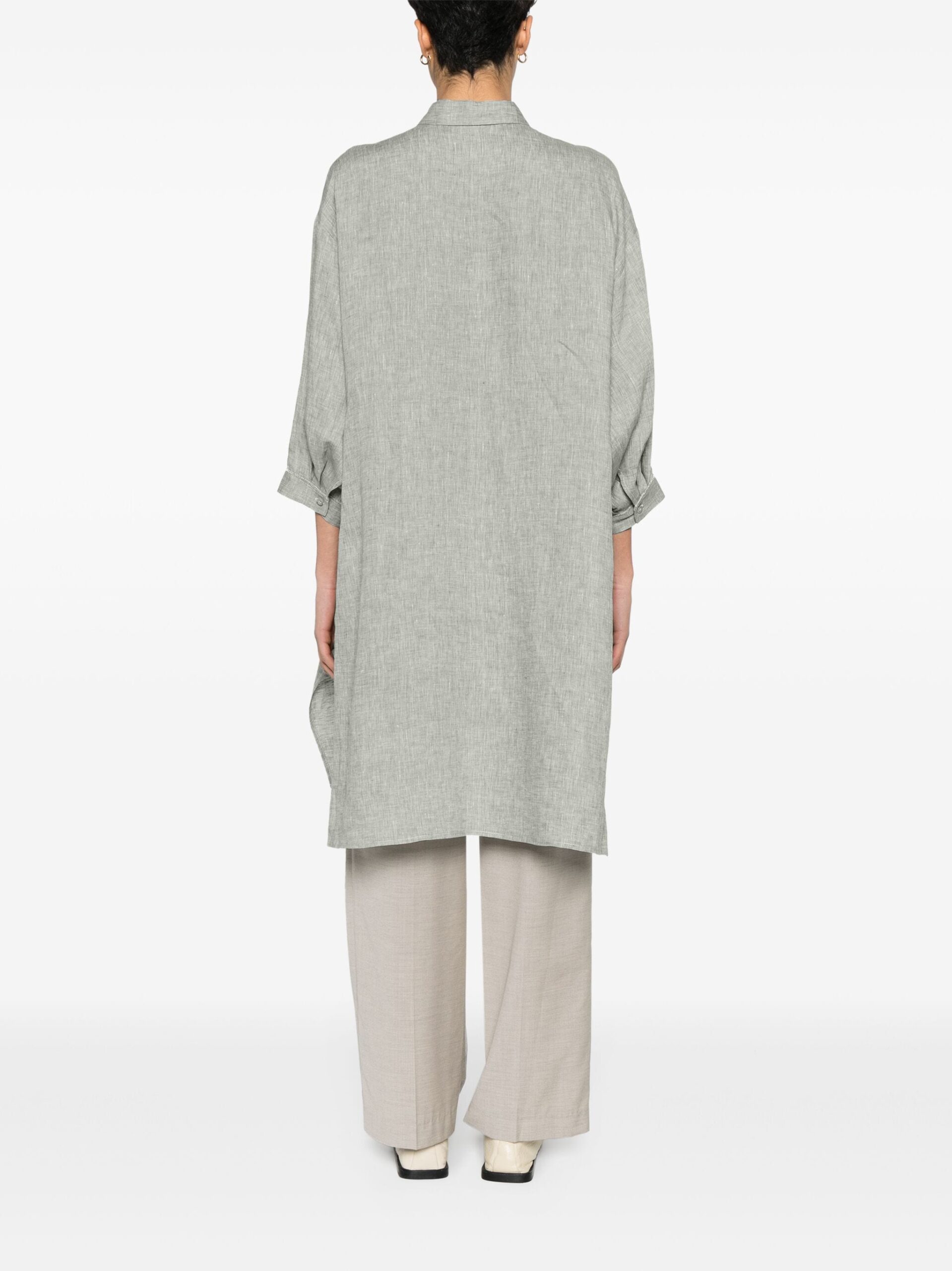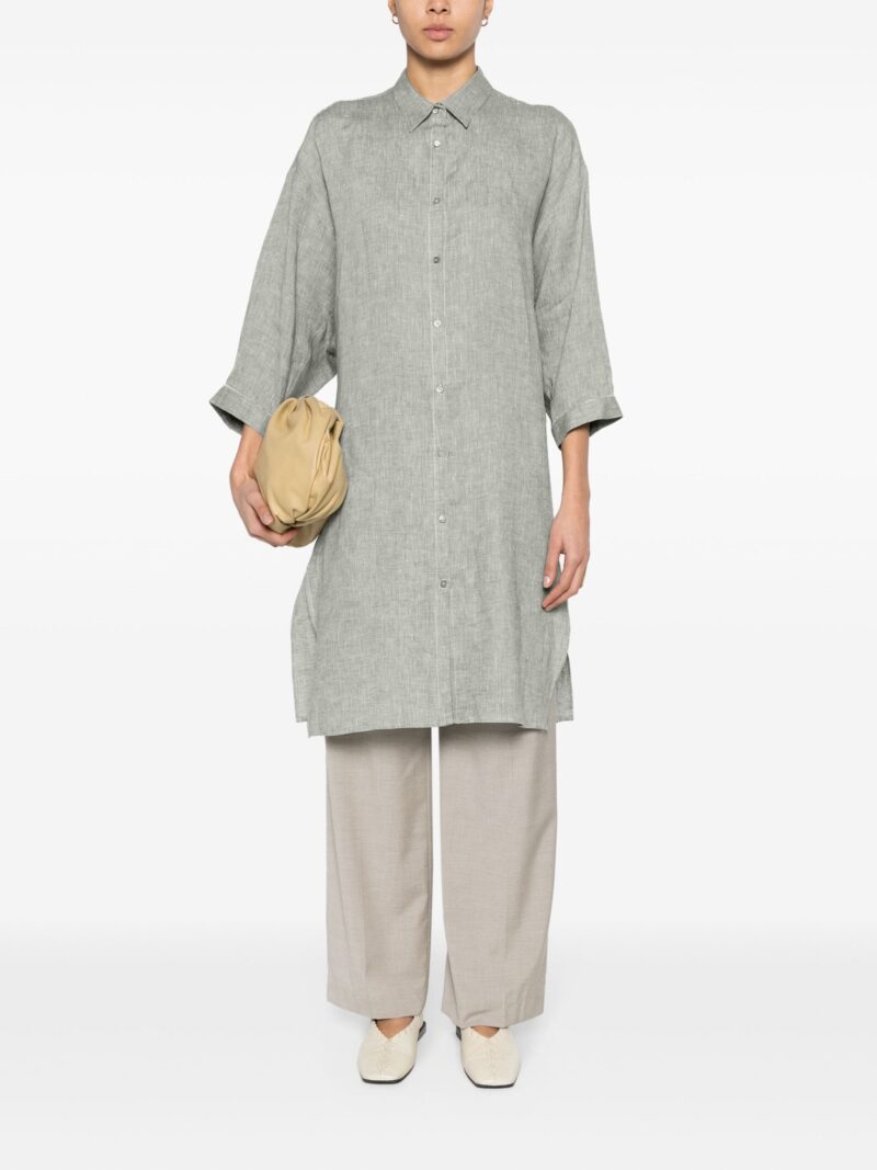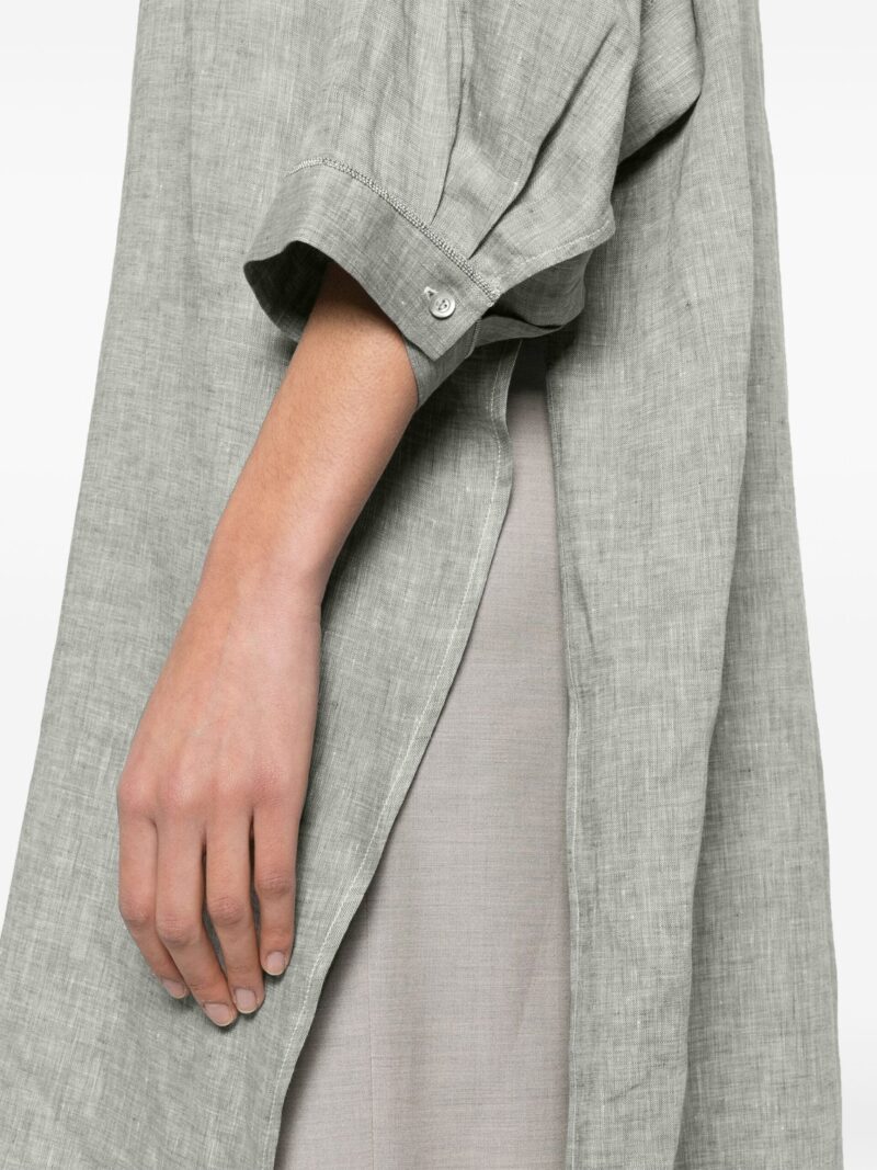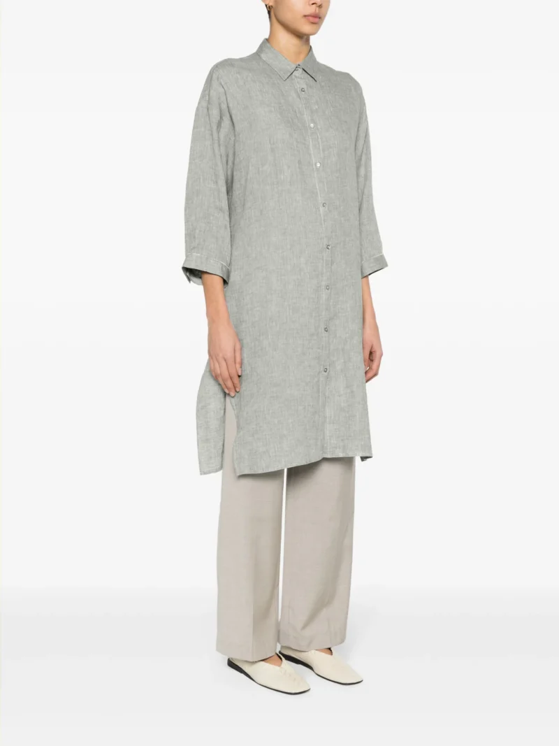 Camasa verde din in, cu guler clasic, inchidere cu nasturi, umeri cazuti, maneci medii, mansete cu nasturi, slit lateral si tiv drept. Potrivita pentru sezonul primavara/vara. 100% in.