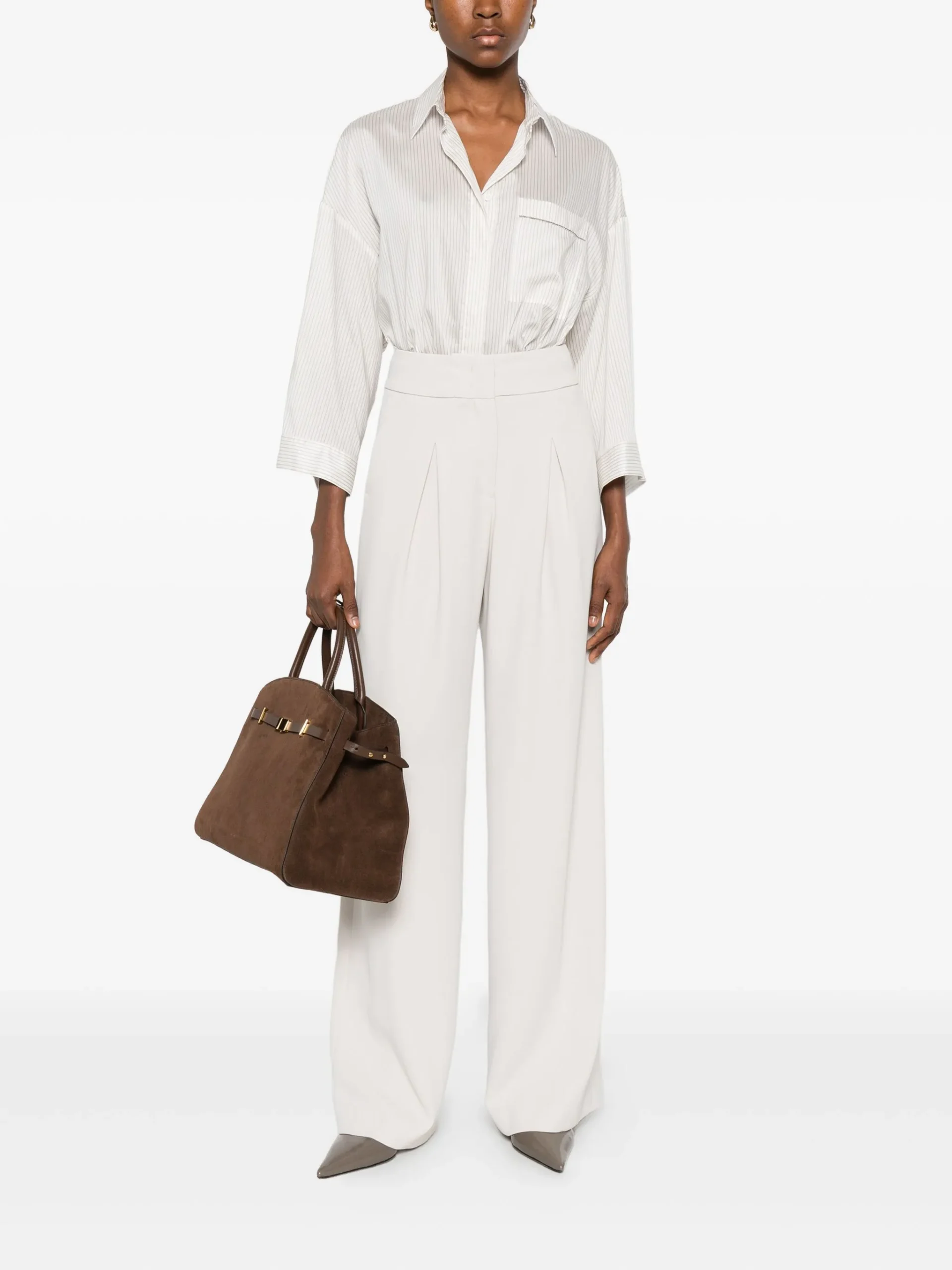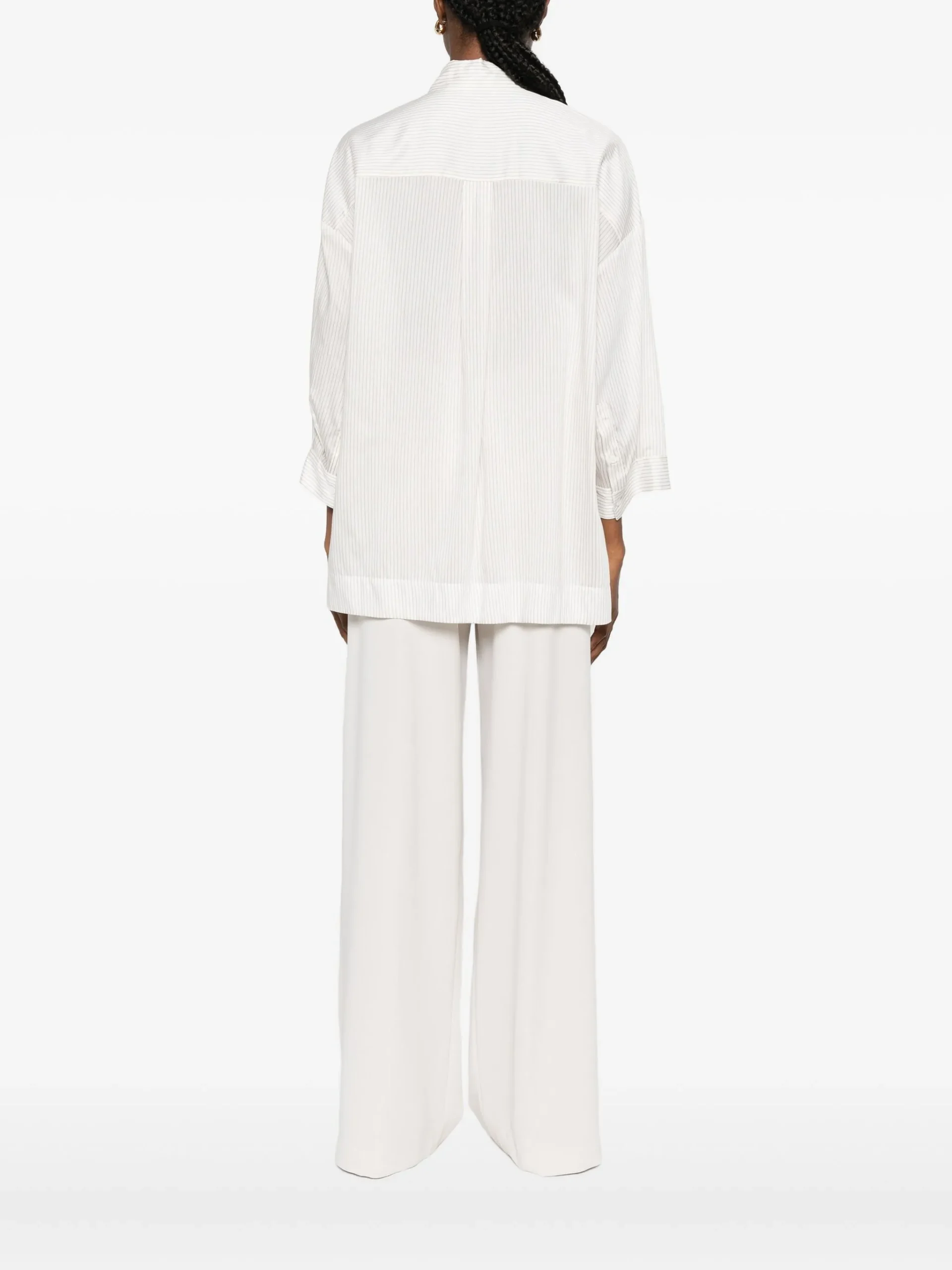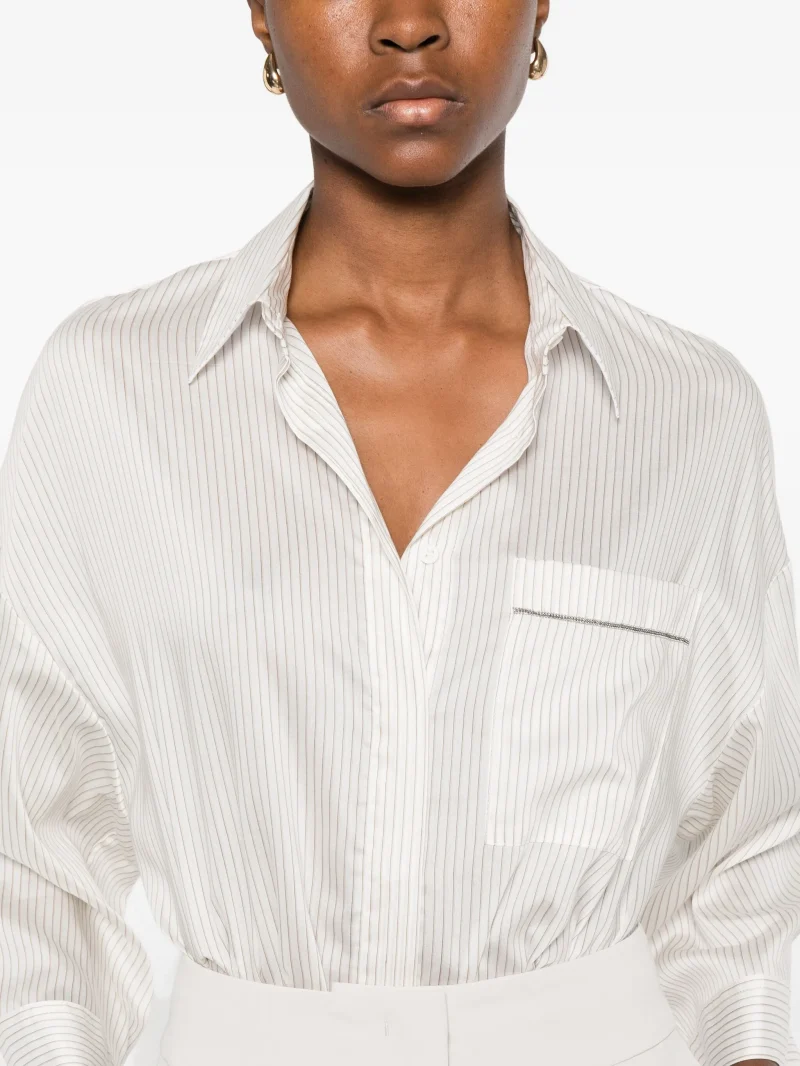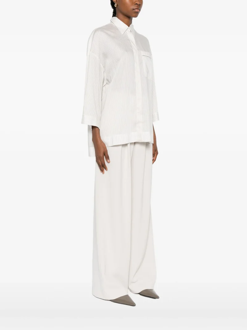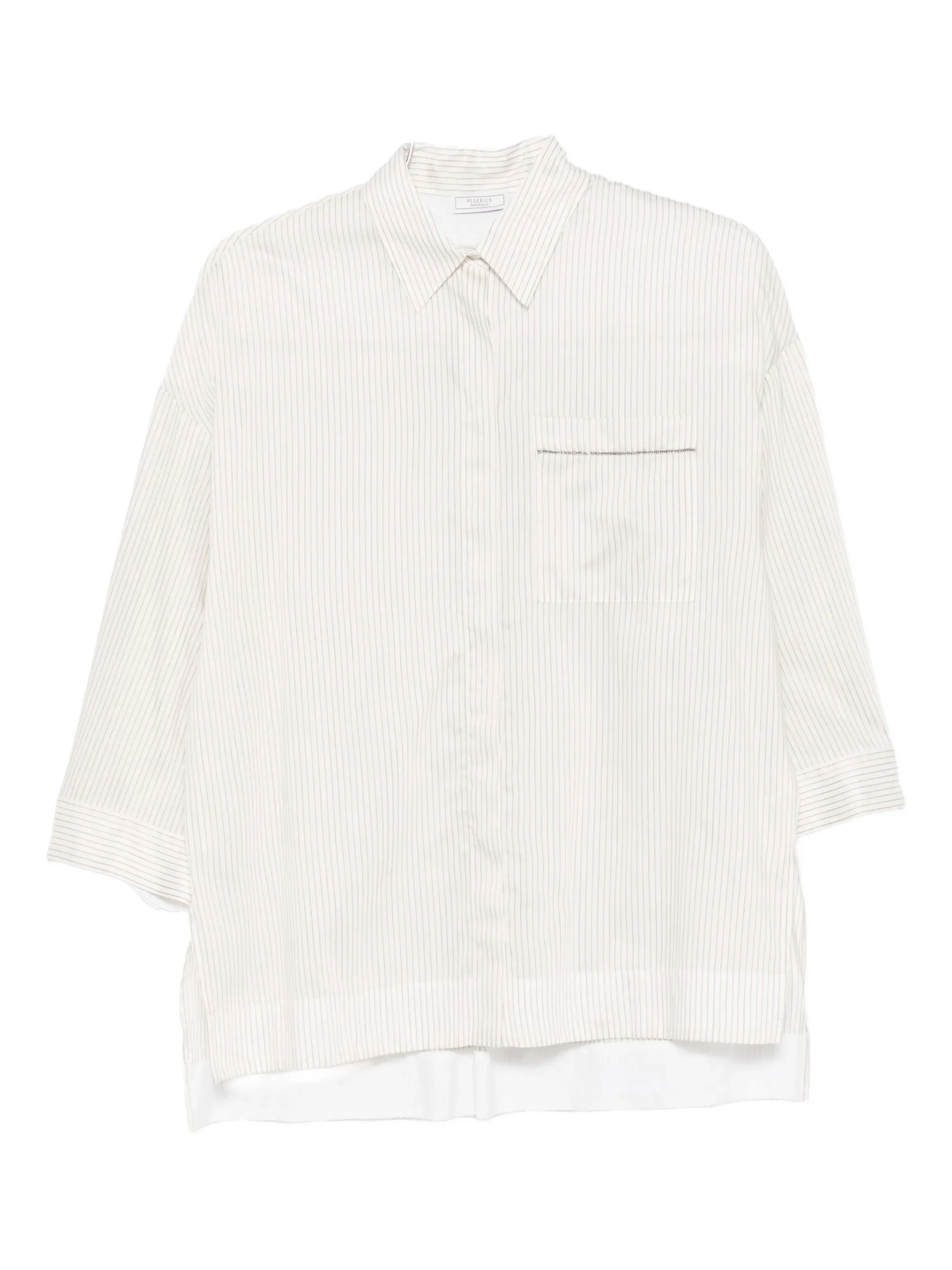 Camasa Peserico ecru cu dungi fine, cu buzunar aplicat la piept, inchidere frontala cu nasturi si maneci trei sferturi. 88% lyocell12% matase