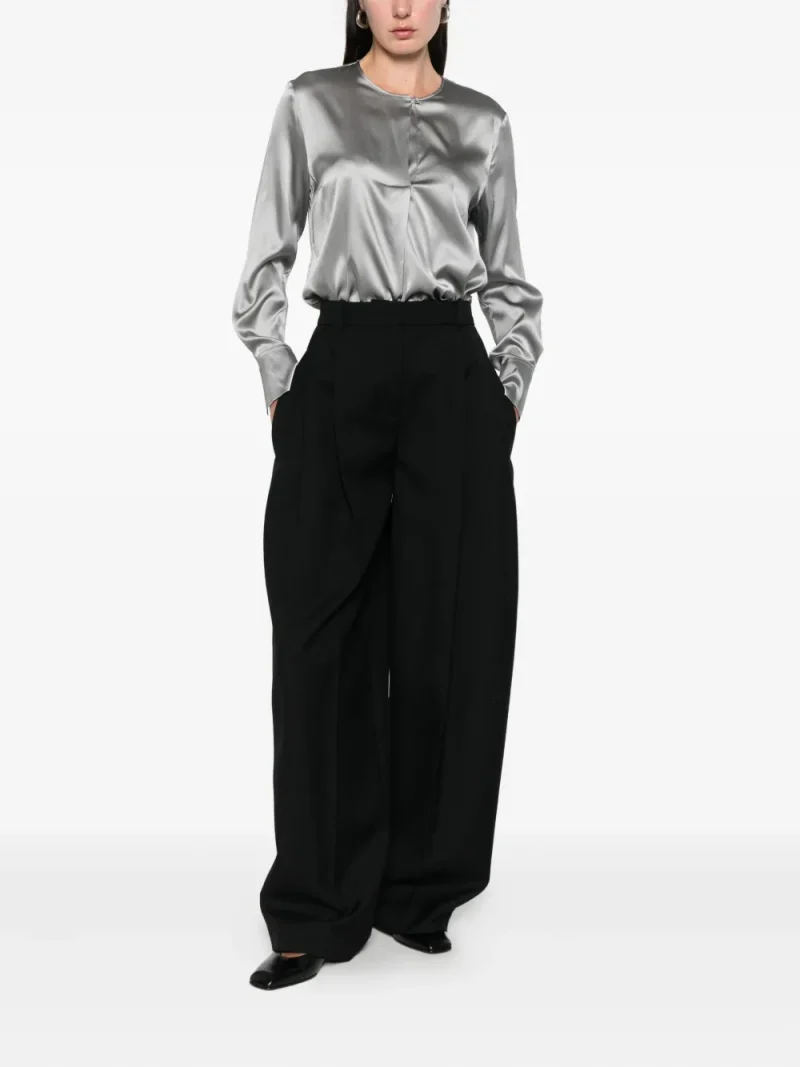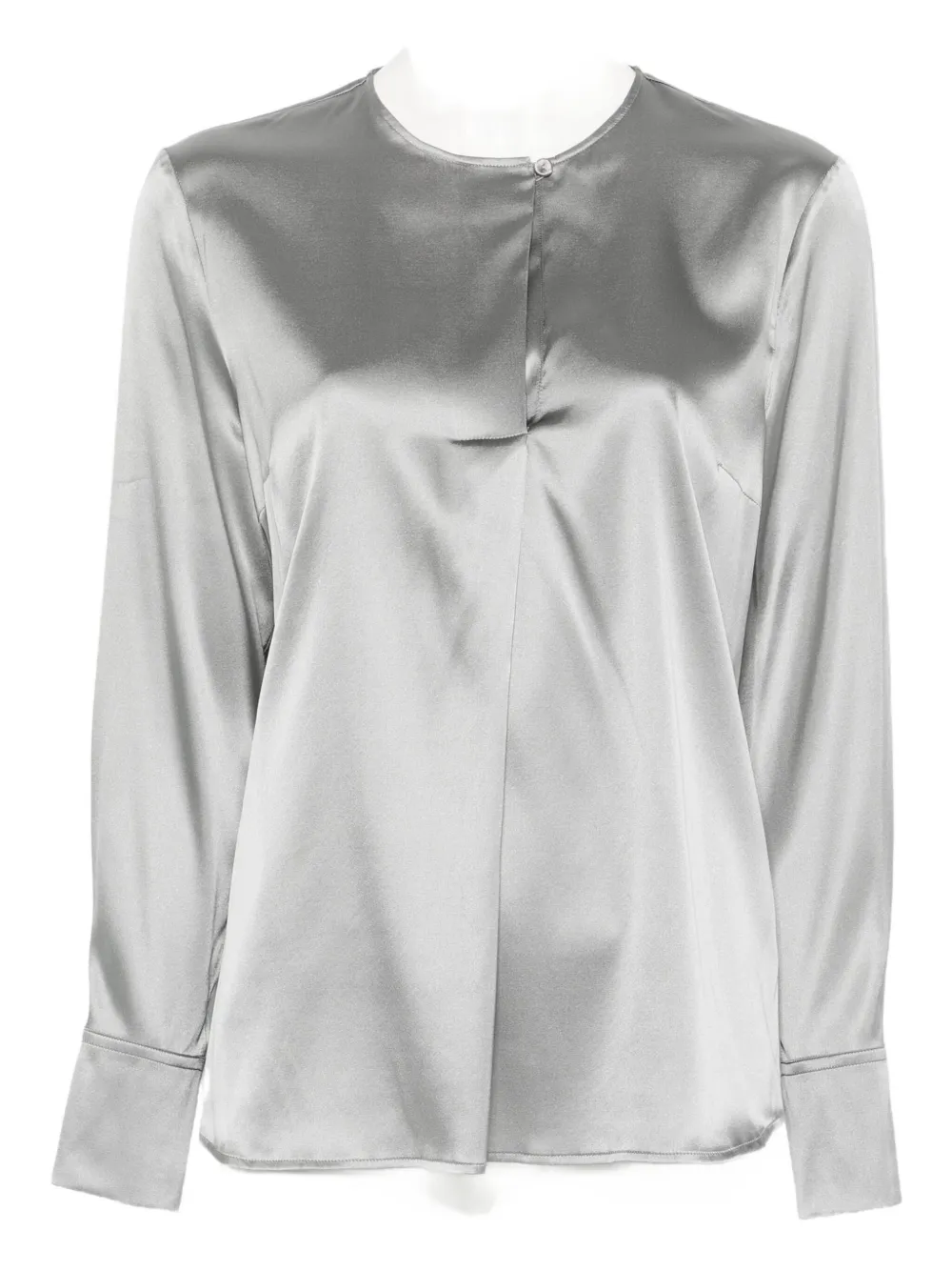 Camasa Peserico Silk Long-Sleeve gri, din matase satinata, cu guler rotund, inchidere cu nasture, maneci lungi, mansete cu nasturi si tiv drept. Potrivita pentru sezonul toamna/iarna. 97% matase; 3% elastan.