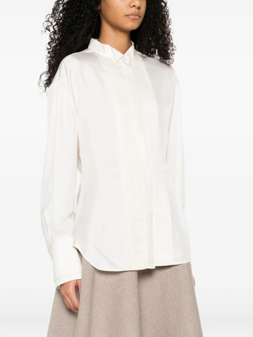 Camasa Rohe Long-Sleeve ecru, din matase satinata, cu inchidere nasturi, guler minimalist cu proportii fine, maneci lungi si mansete cu nasturi, pliuri decorative si tiv curbat. Potrivita pentru sezonul primavara/vara. 100% matase.