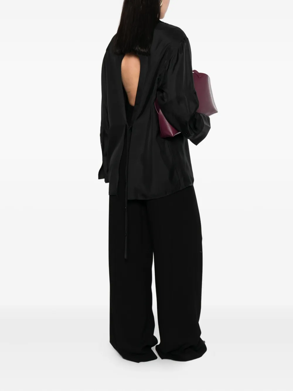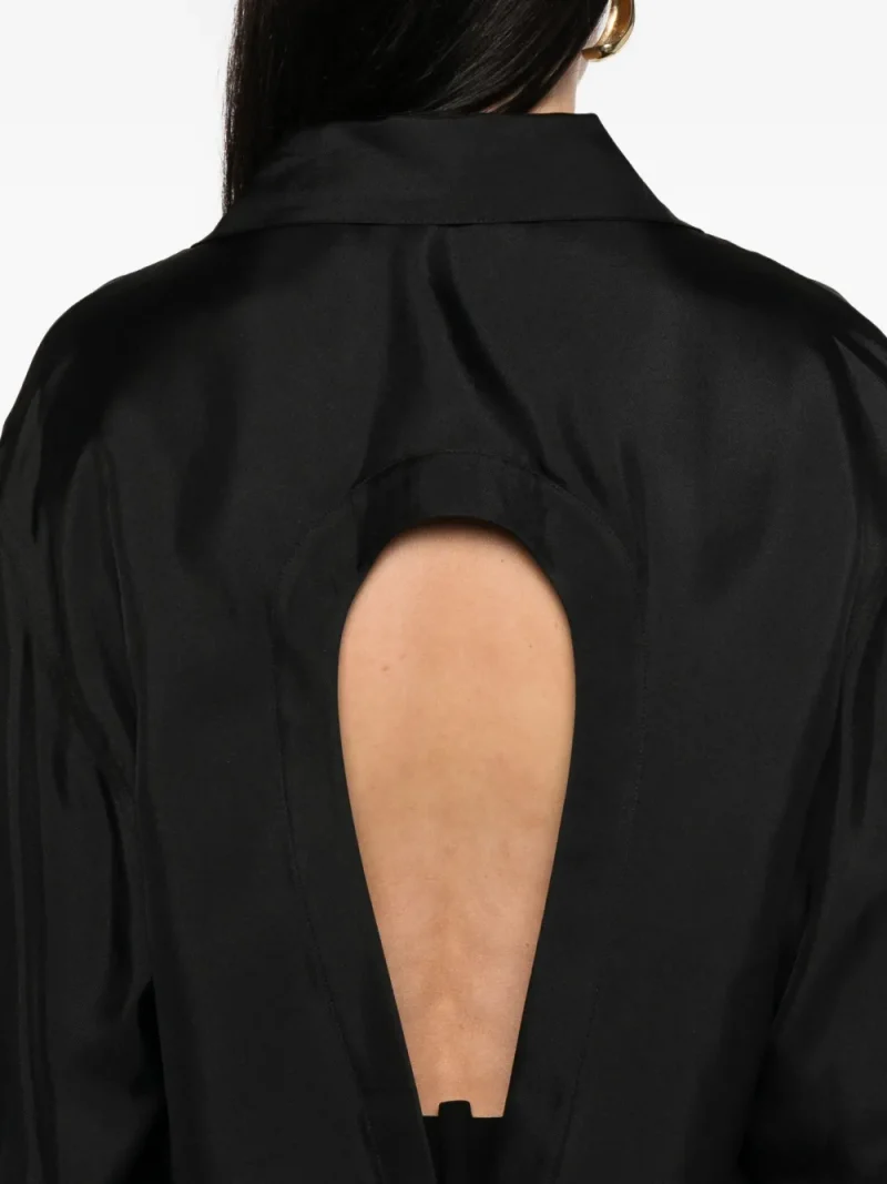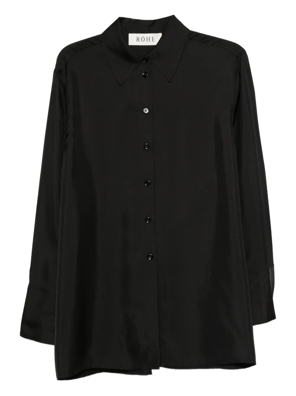 Camasa Rohe Open-Back Silk negru, din matase, cu guler clasic, inchidere cu nasturi, maneci lungi, mansete elastice, decupaj la spate si tiv drept. Potrivita pentru sezonul toamna/iarna. 100% matase.