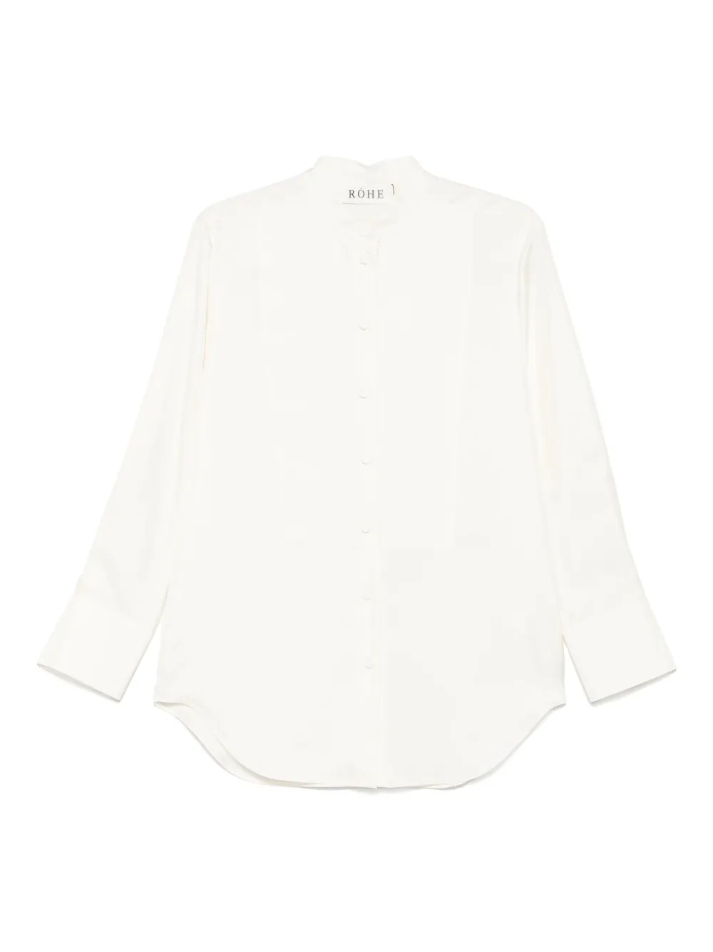 Camasa Rohe Silk bej, din matase, cu guler tunica, inchidere cu nasturi, maneci lungi, mansete cu nasturi si tiv curbat. Potrivita pentru sezonul primavara/vara. 100% matase.
