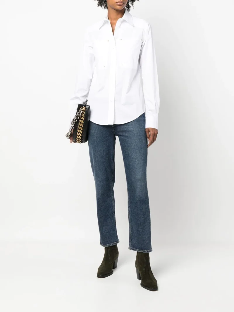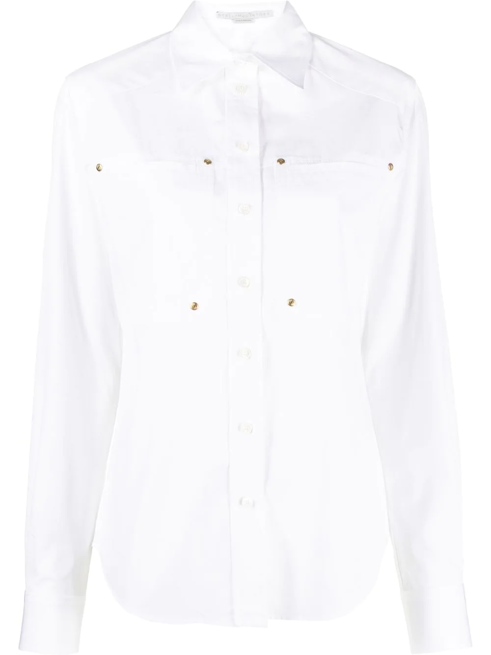 Camasa alba din bumbac, cu guler clasic si inchidere cu nasturi, maneci lungi, buzunare la piept, tinte metalice aplicate simetric si tiv curbat. Potrivita pentru sezonul toamna/iarna. 100% bumbac.