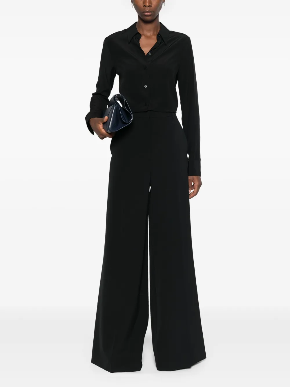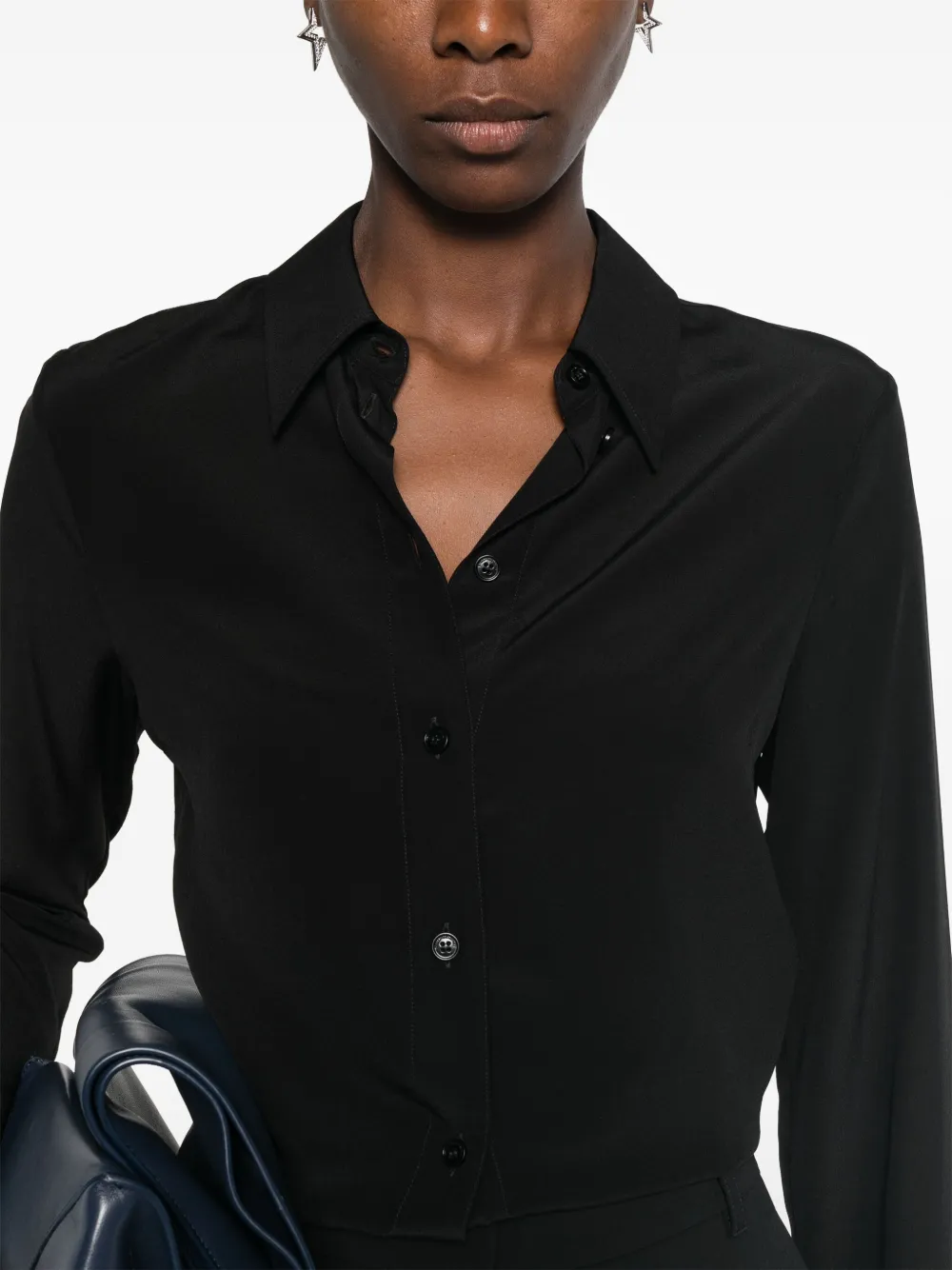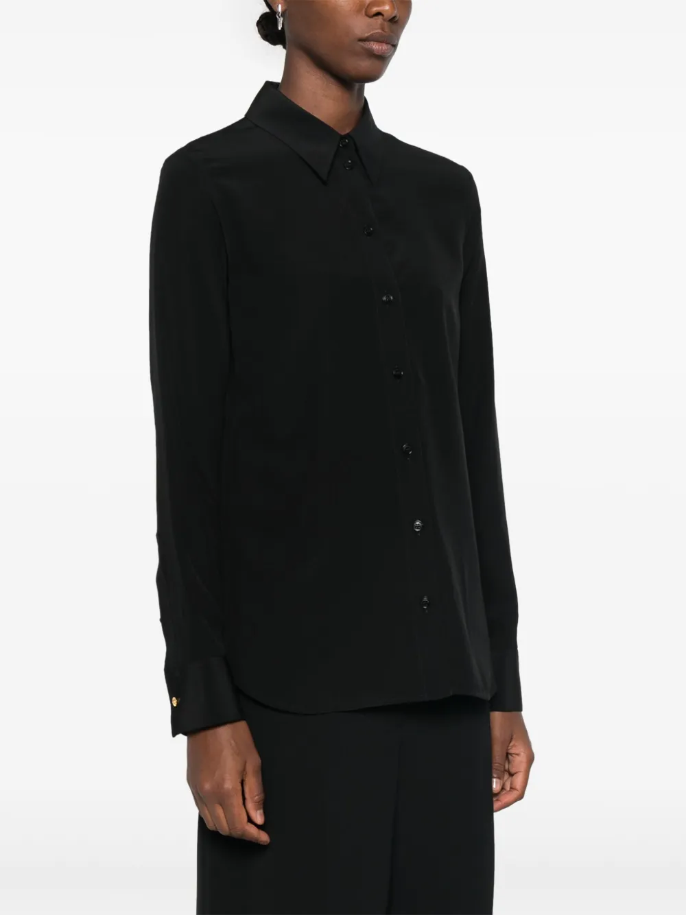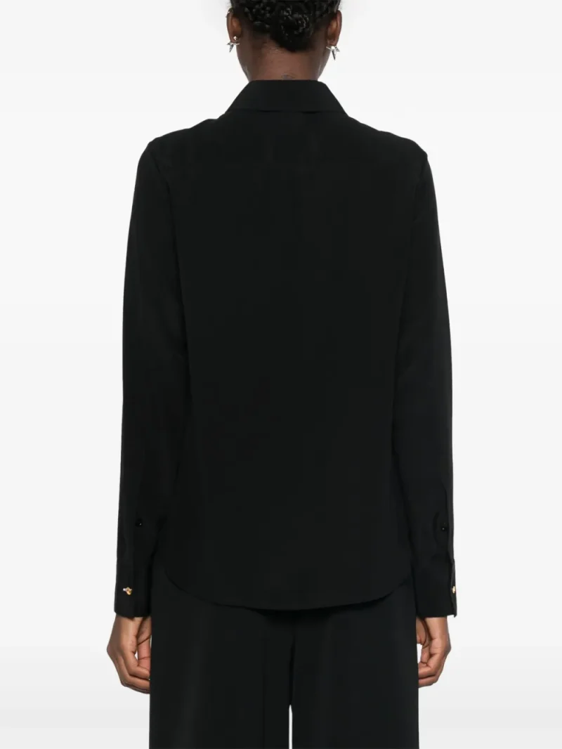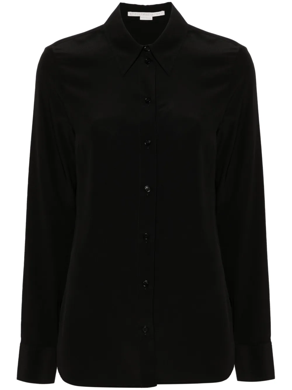 Camasa Stella McCartney din matase neagra, guler ascutit, maneci lungi, mansete cu nasturi, terminatie curbata, inchidere frontala cu nasturi. 100% matase