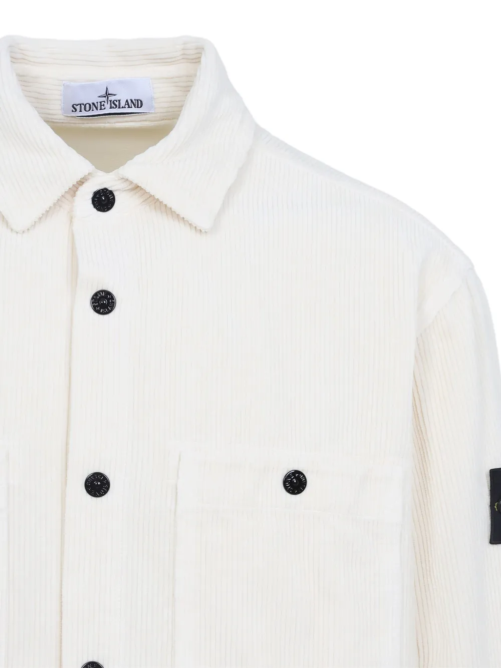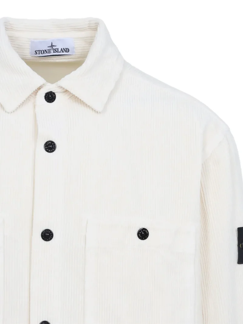 Camasa Stone Island buttoned corduroy ivoire, inchidere cu nasturi, textura din catifea reiata, doua buzunare la piept, maneci lungi si logo aplicat. 100% bumbac