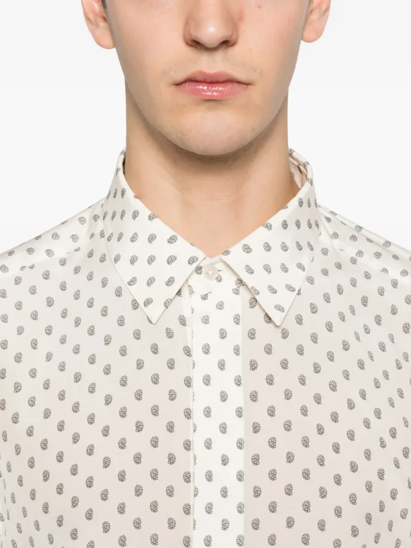 Camasa TOM FORD Paisley-Print alb, realizata din matase, cu guler clasic, inchidere cu nasturi ascunsi, maneci lungi, mansete cu nasturi, grafica Paisley imprimata pe toata suprafata si tiv drept. Potrivita pentru sezonul primavara/vara. 100% matase.