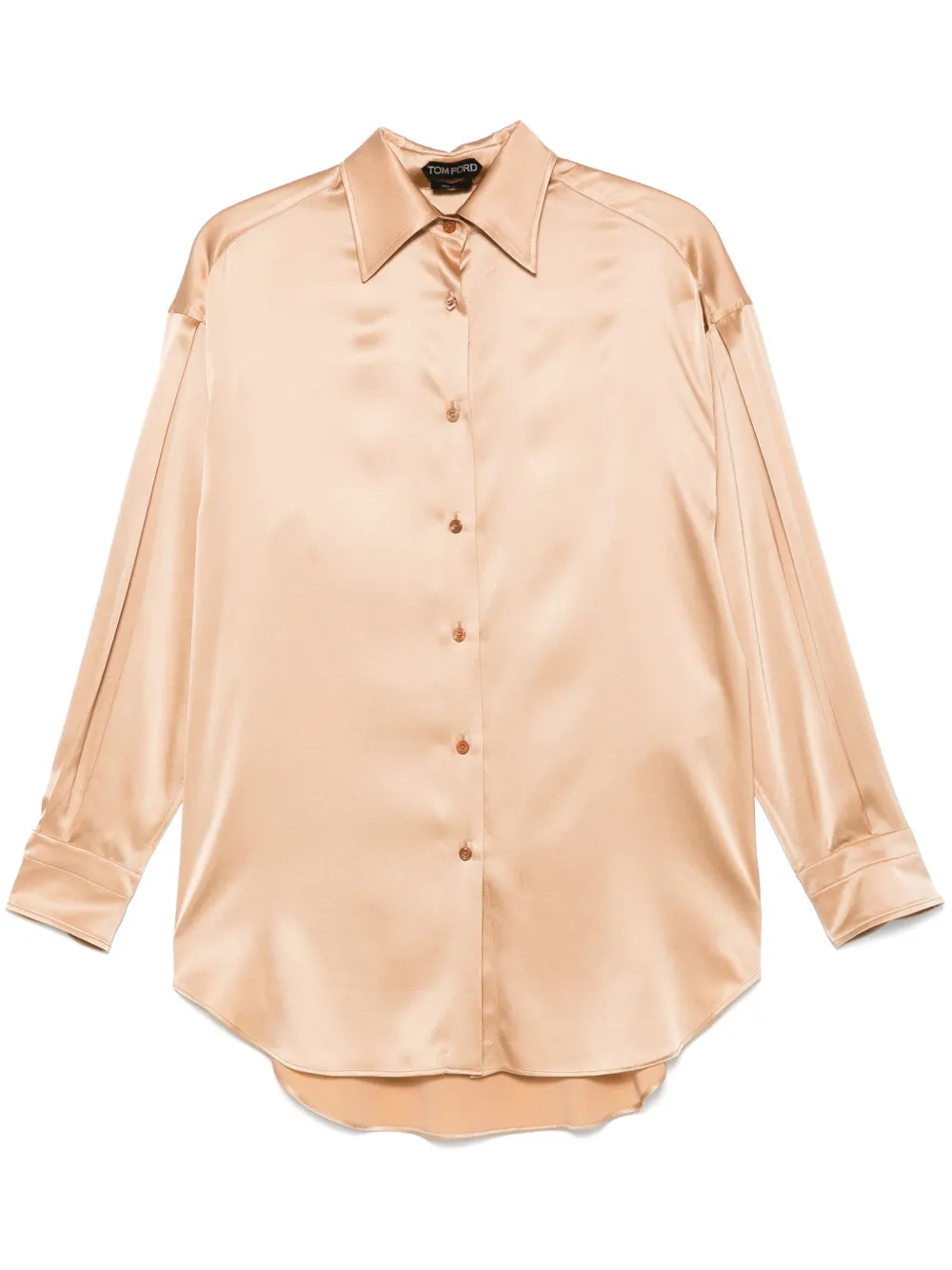 Camasa TOM FORD Satin bej, din matase satinata, cu guler clasic, inchidere cu nasturi, maneci lungi, mansete cu nasturi si tiv curbat. Potrivita pentru sezonul primavara/vara. 94% matase; 6% elastan.