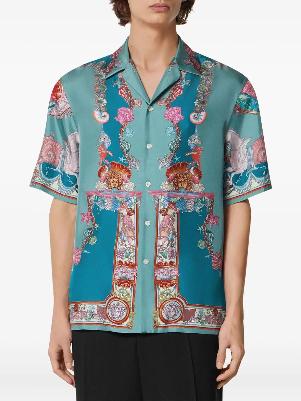 Camasa Versace Coral Theatre multicolor, din matase, cu guler camp, inchidere cu nasturi, umeri cazuti, maneci scurte, grafica Coral Theatre pe toata suprafata, buzunare aparente imprimate si tiv drept. Potrivita pentru sezonul primavara/vara. 100% matase.