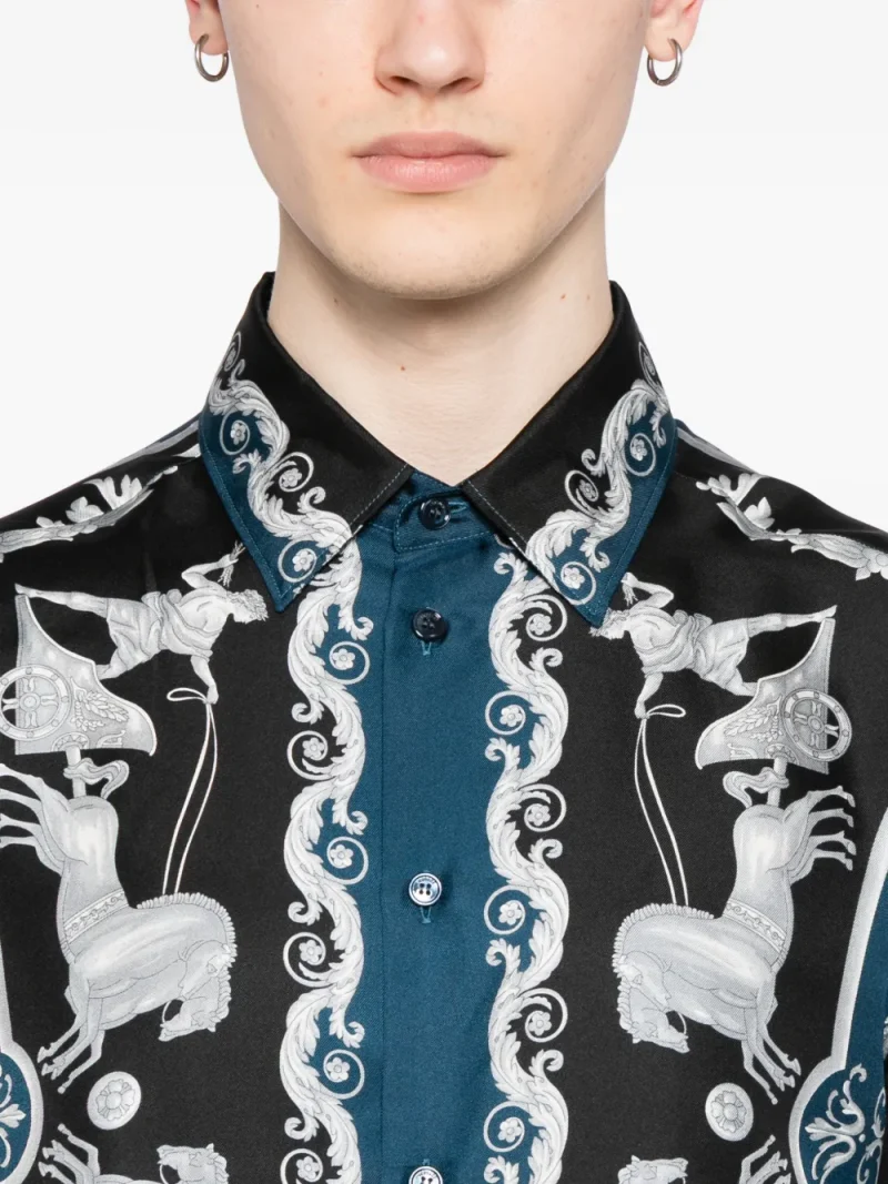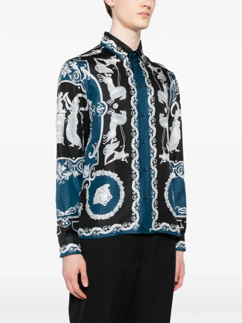 Camasa Versace Hall Of Heroes bleumarin, realizata din matase, cu guler camp, maneci lungi, grafica Hall of Heroes imprimata si tiv drept. Potrivita pentru sezonul toamna/iarna. 100% matase.