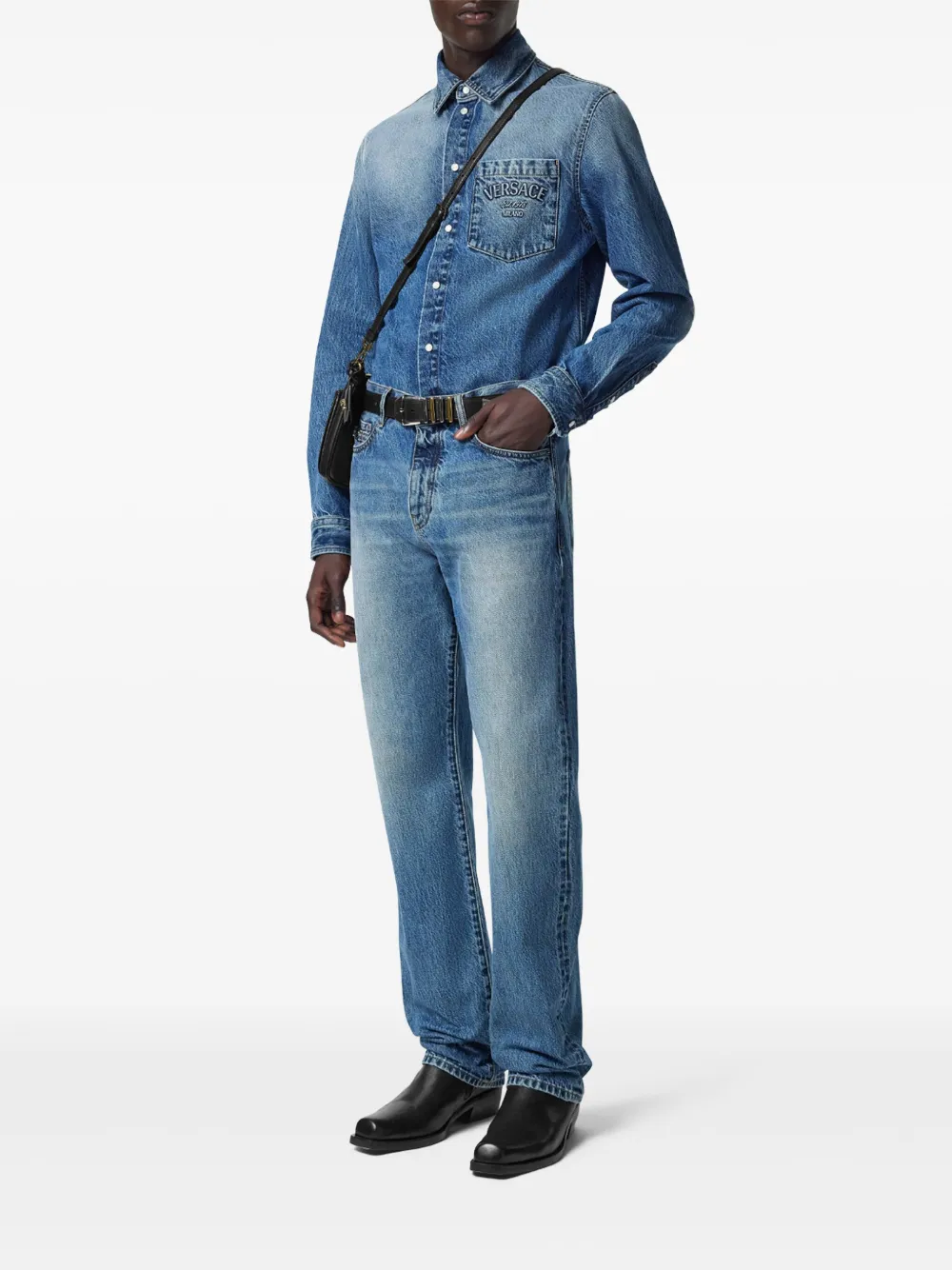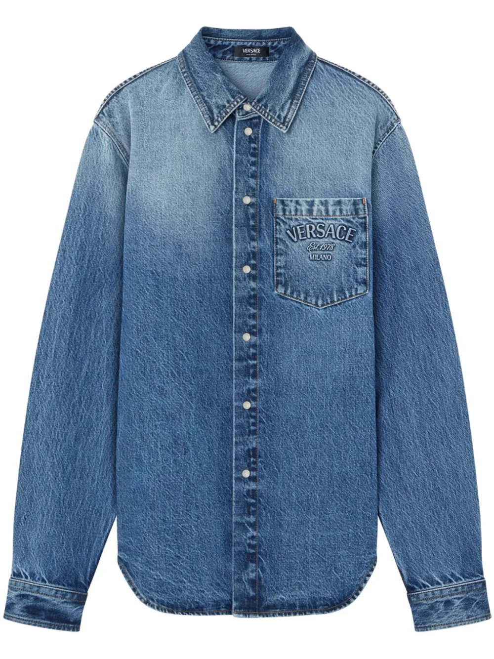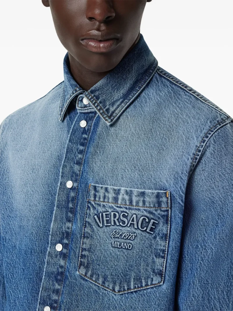 Camasa Versace Logo-Embossed Denim albastru, din denim, cu guler clasic, inchidere cu nasturi, maneci lungi, mansete cu nasturi, buzunar aplicat la piept cu logo Versace brodat si tiv curbat. Potrivita pentru sezonul primavara/vara. 100% textil.
