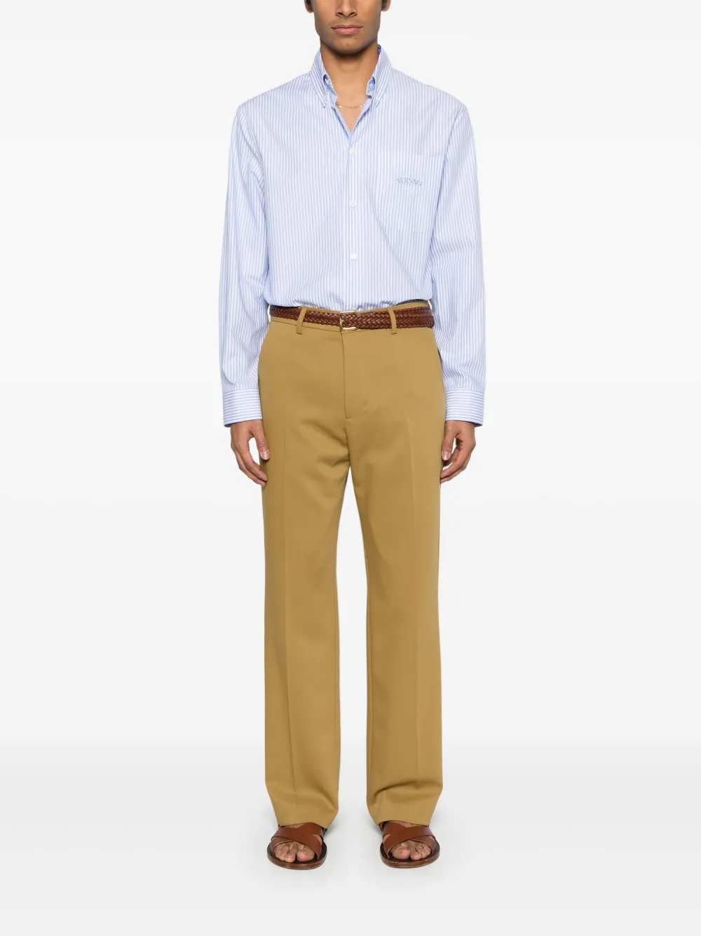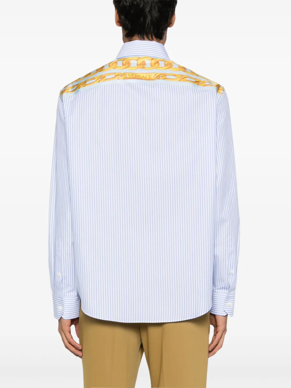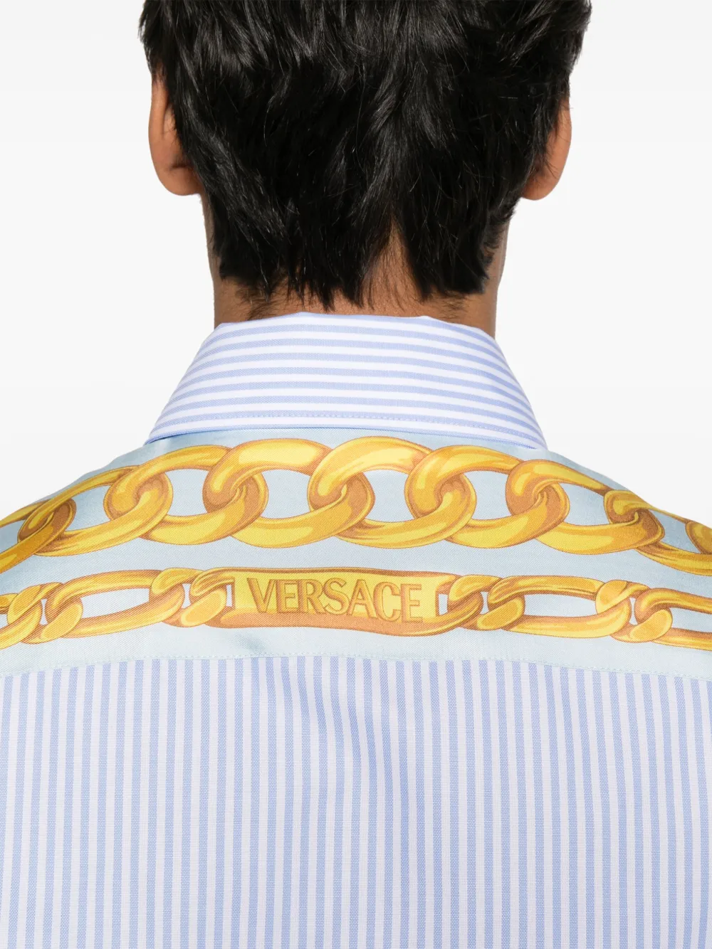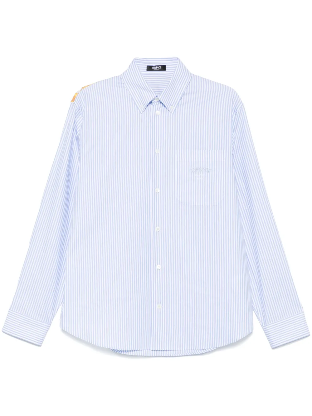 Camasa Versace Striped albastru, cu guler clasic, inchidere cu nasturi, maneci lungi, mansete cu nasturi, buzunar aplicat la piept cu logo Versace brodat, grafica in dungi in tesatura si grafica Medusa la spate si tiv curbat. Potrivit pentru seoznul primavara/vara. 100% viscoza; 100% matase; 100% bumbac; 100% poliester.