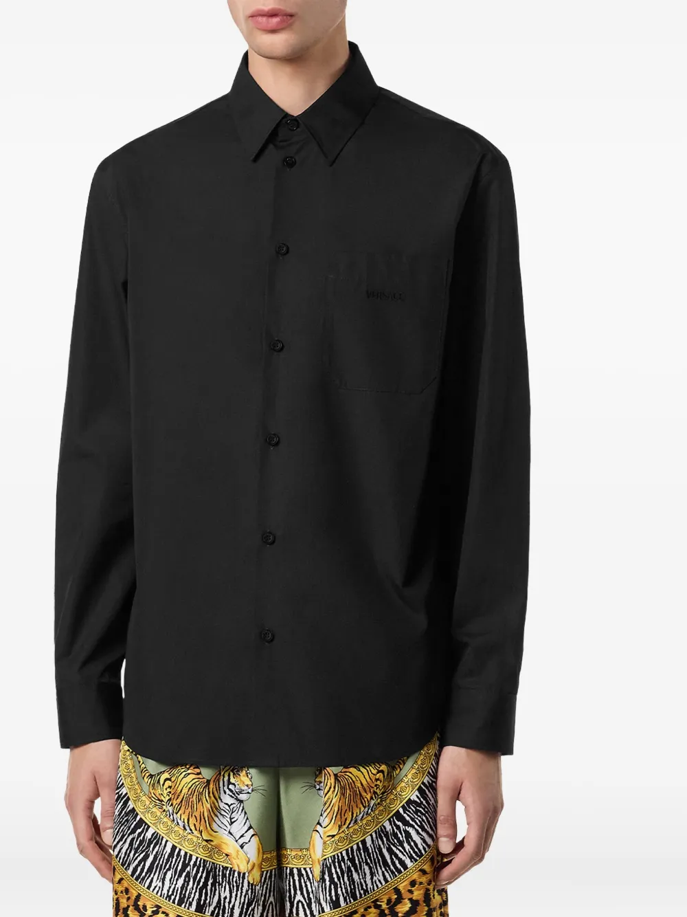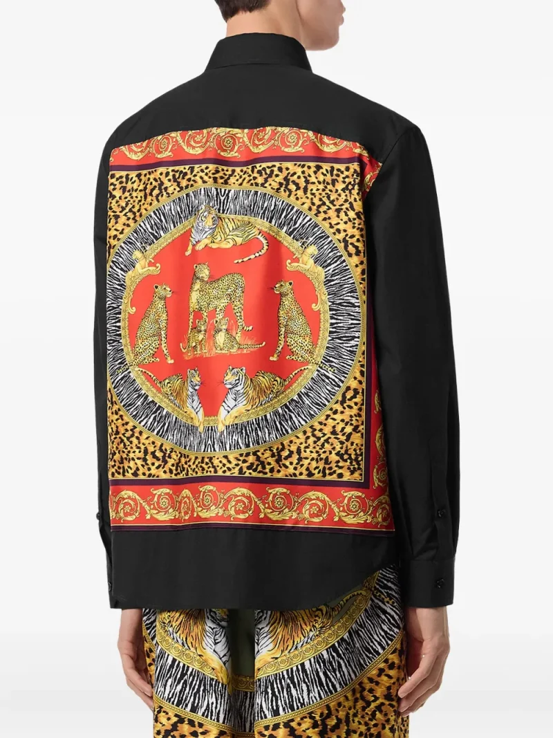 Camasa Versace wild cats-print negru, imprimeu pisici salbatice, maneci lungi, mansete cu nasturi.100% bumbac