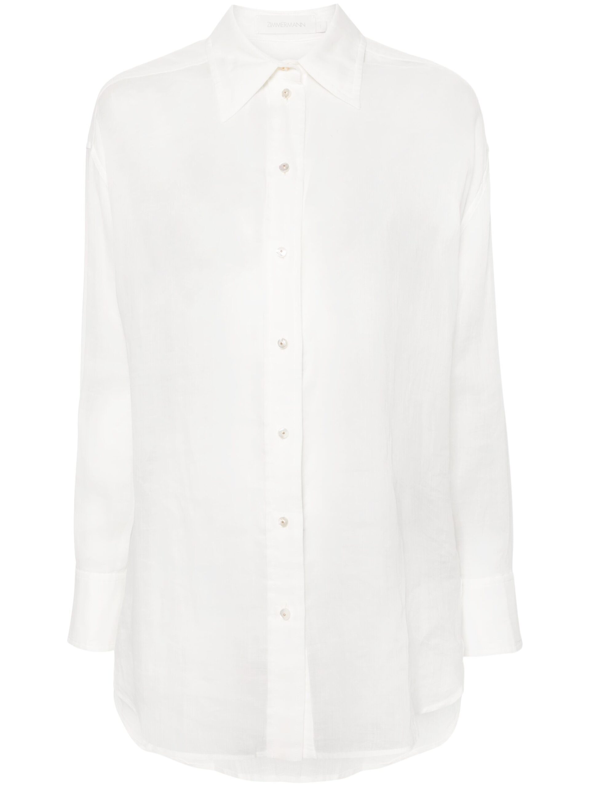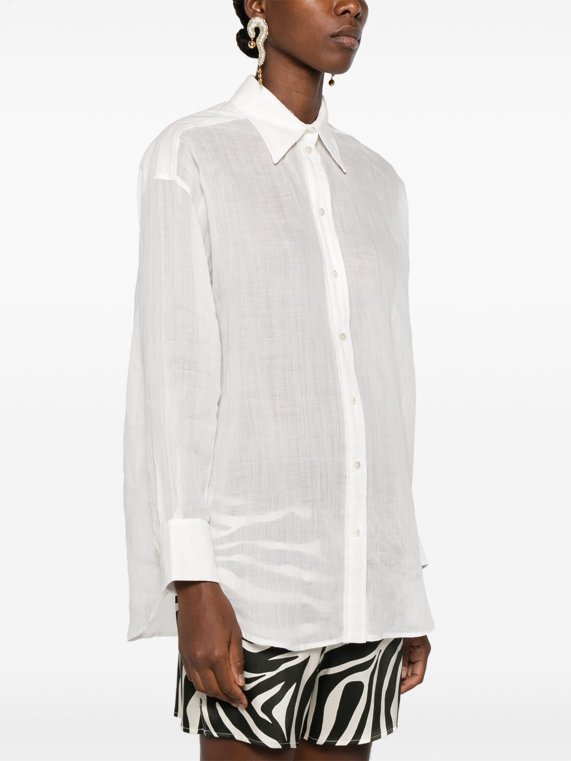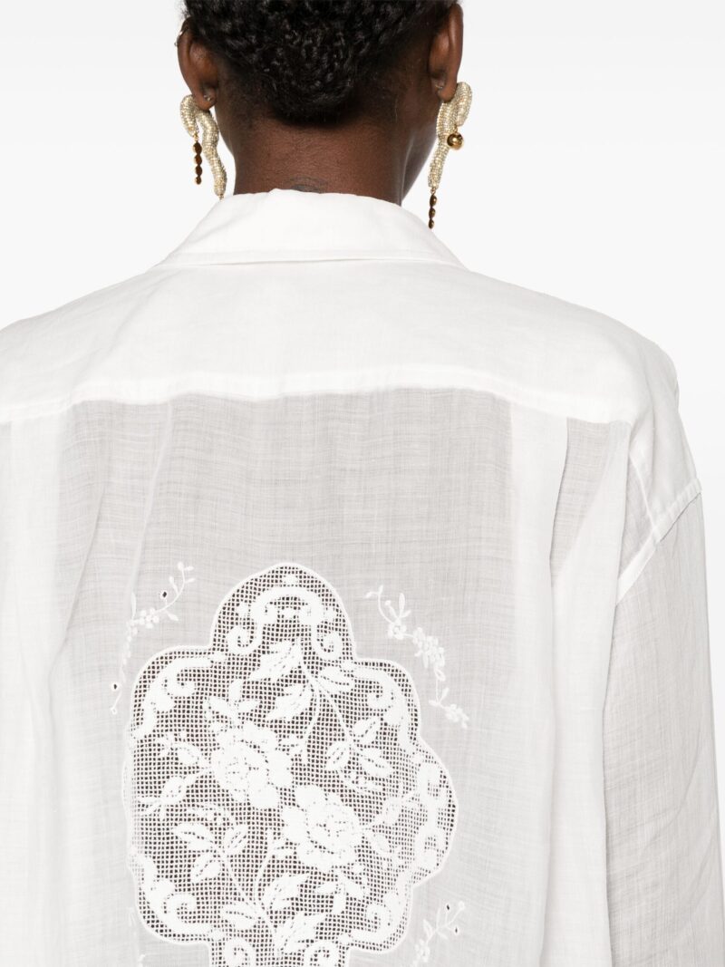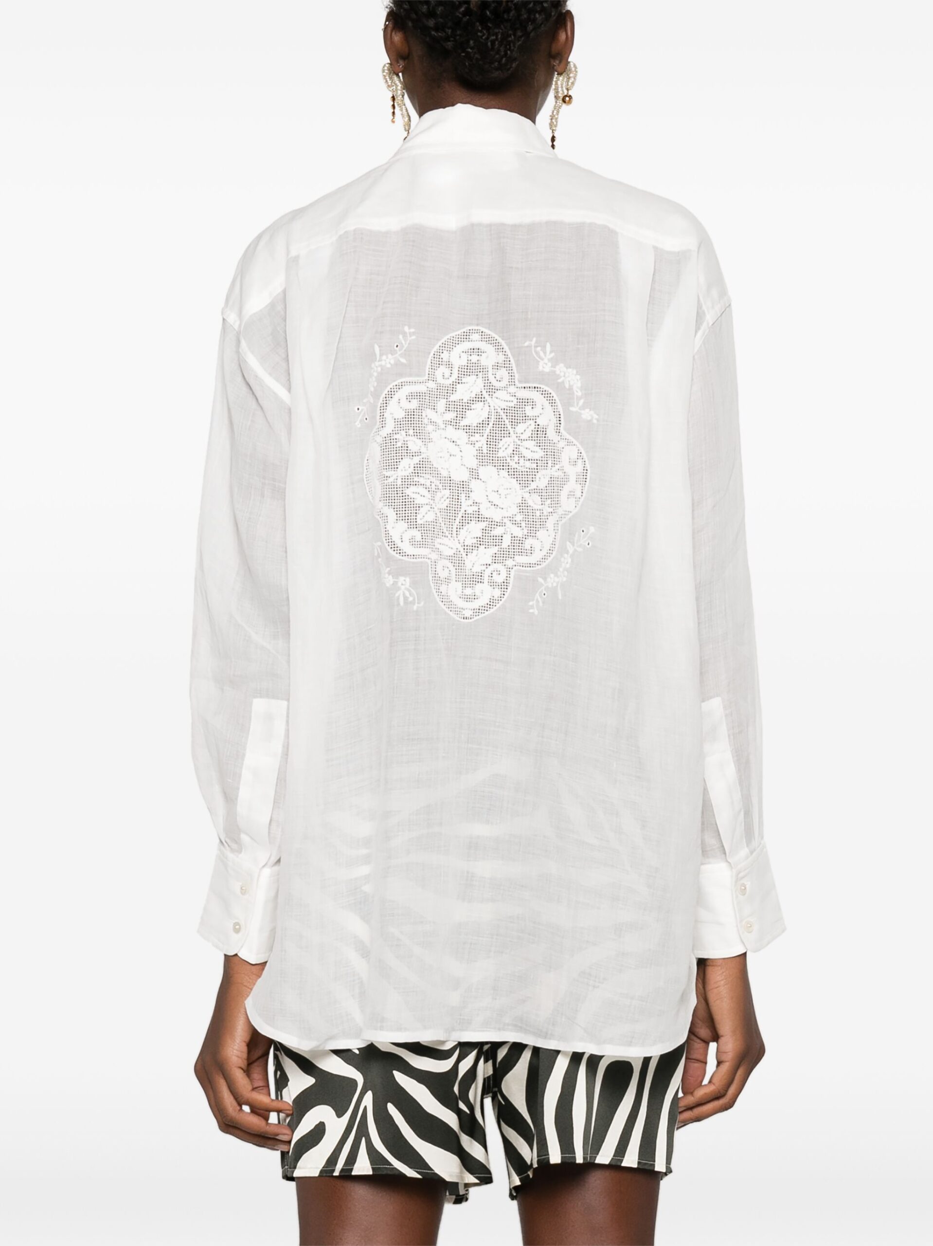 Camasa alba din bumbac, cu guler clasic, inchidere cu nasturi, umeri cazuti, maneci lungi, mansete cu nasturi, detalii brodate pe spate si tiv curbat. Potrivita pentru sezonul primavara/vara. 100% bumbac; 100% ramie; 100% bumbac.