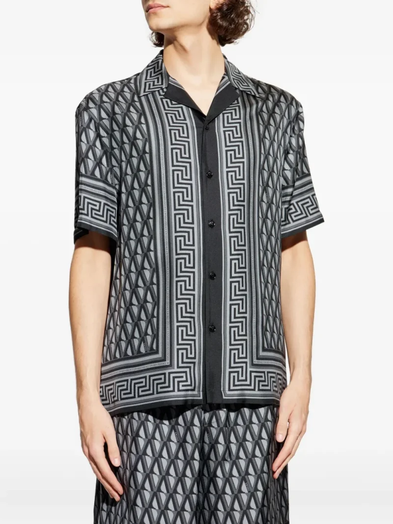 Camasa Versace Grecca-Trim gri, realizata din matase, cu guler camp, inchidere cu nasturi, maneci scurte, grafica monogram si semnatura Grecca imprimate, croiala straight-fit si tiv drept. Porivita pentru sezonul primavara/vara. 100% matase.