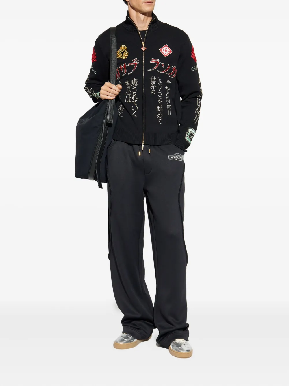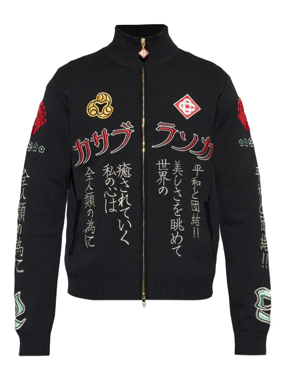 Cardigan Casablanca Zip-Up negru, cu guler inalt, inchidere cu fermoar bidirectional, maneci lungi, broderii text pe toata suprafata produsului si terminatii ribbed. Potrivit pentru sezonul toamna/iarna. 65% viscoza; 35% poliamida.