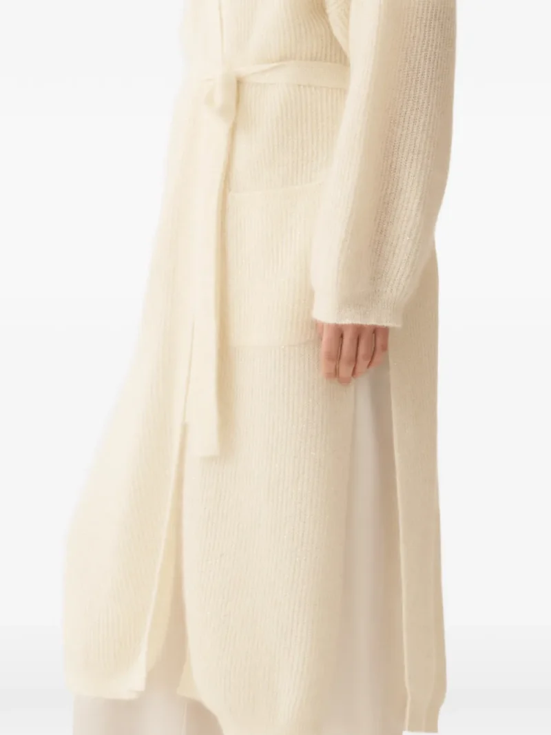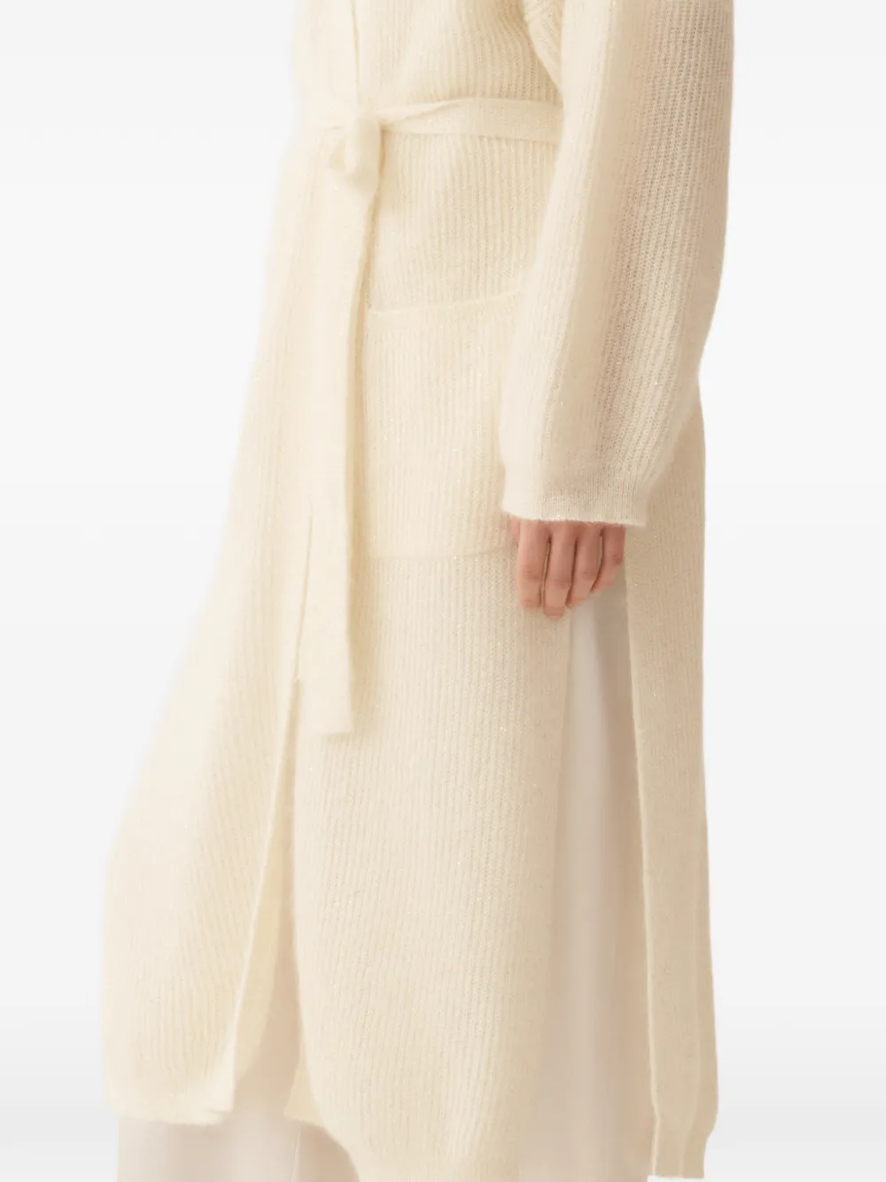 Cardigan Fabiana Filippi Belten ecru , cu decolteu in V, maneci lungii bufante, cordon in jurul taliei si tiv drept. Potrivit pentru sezonul primavara/vara. 57% poliester; 16% mohair; 16% alpaca; 11% nylon.