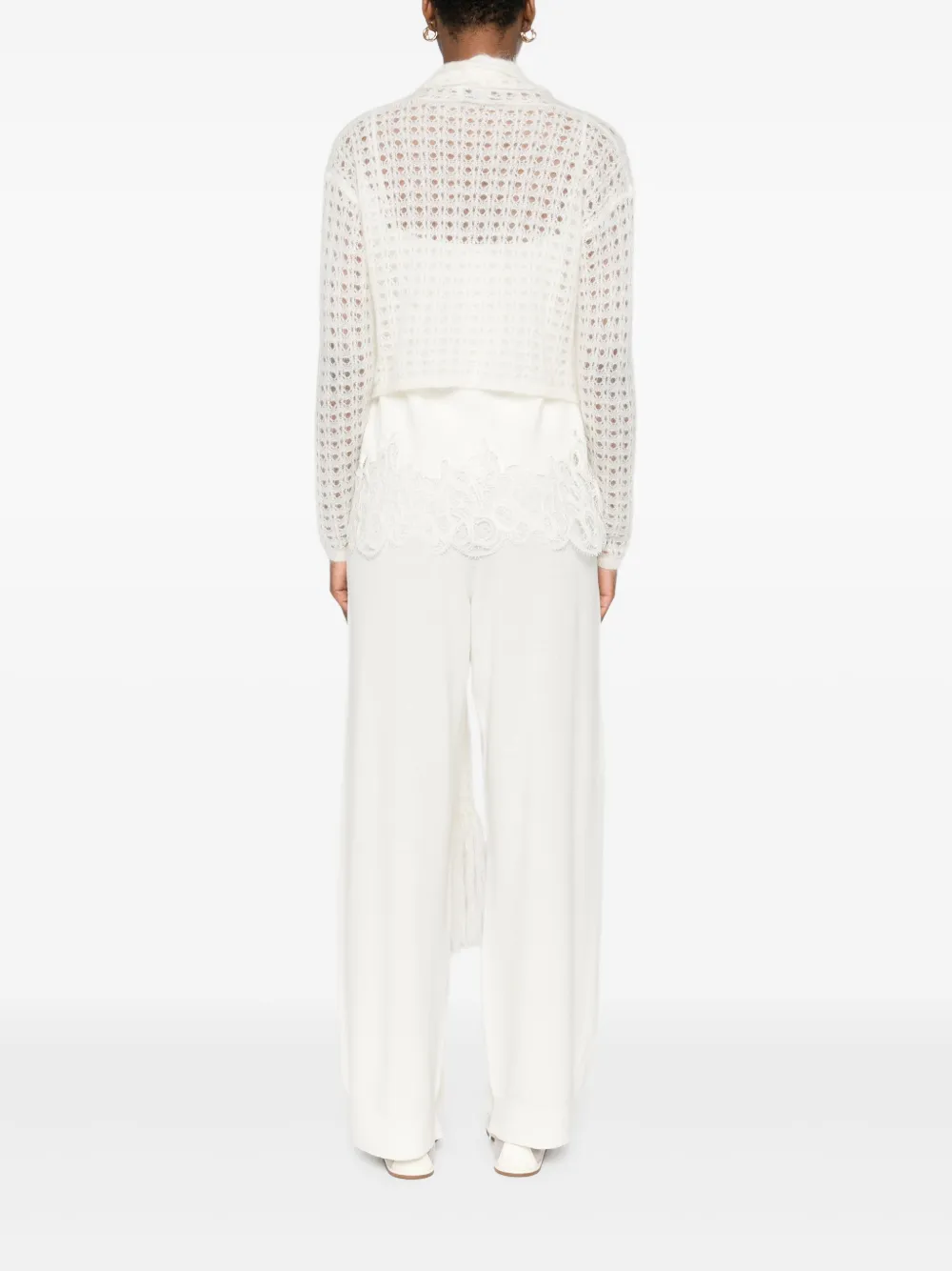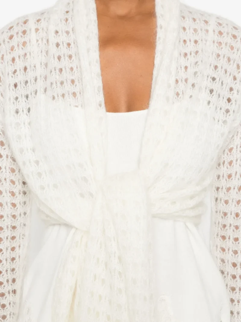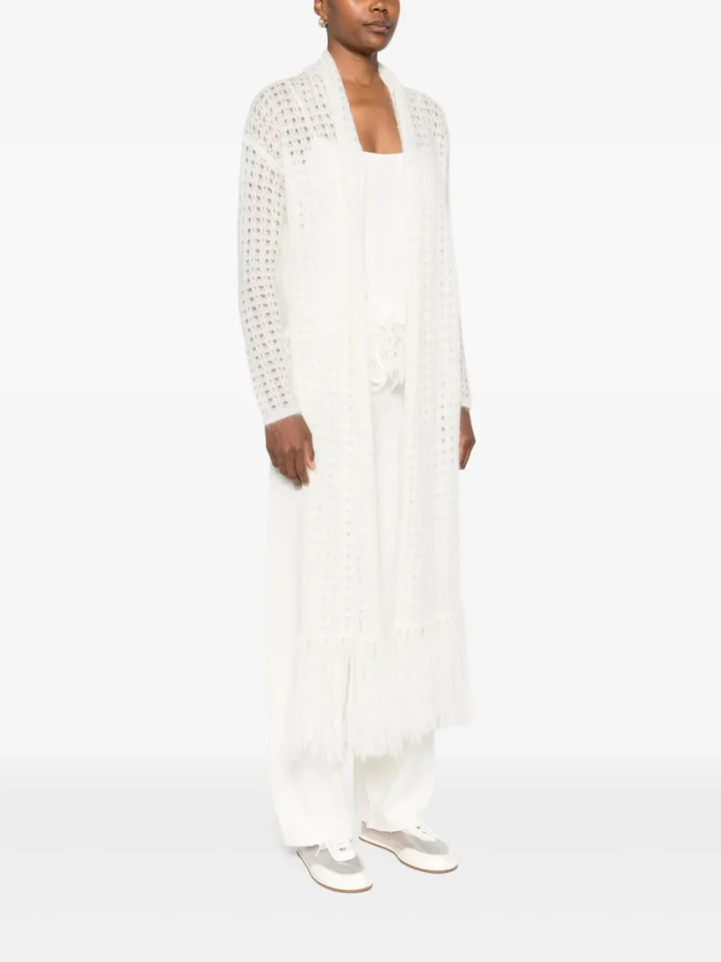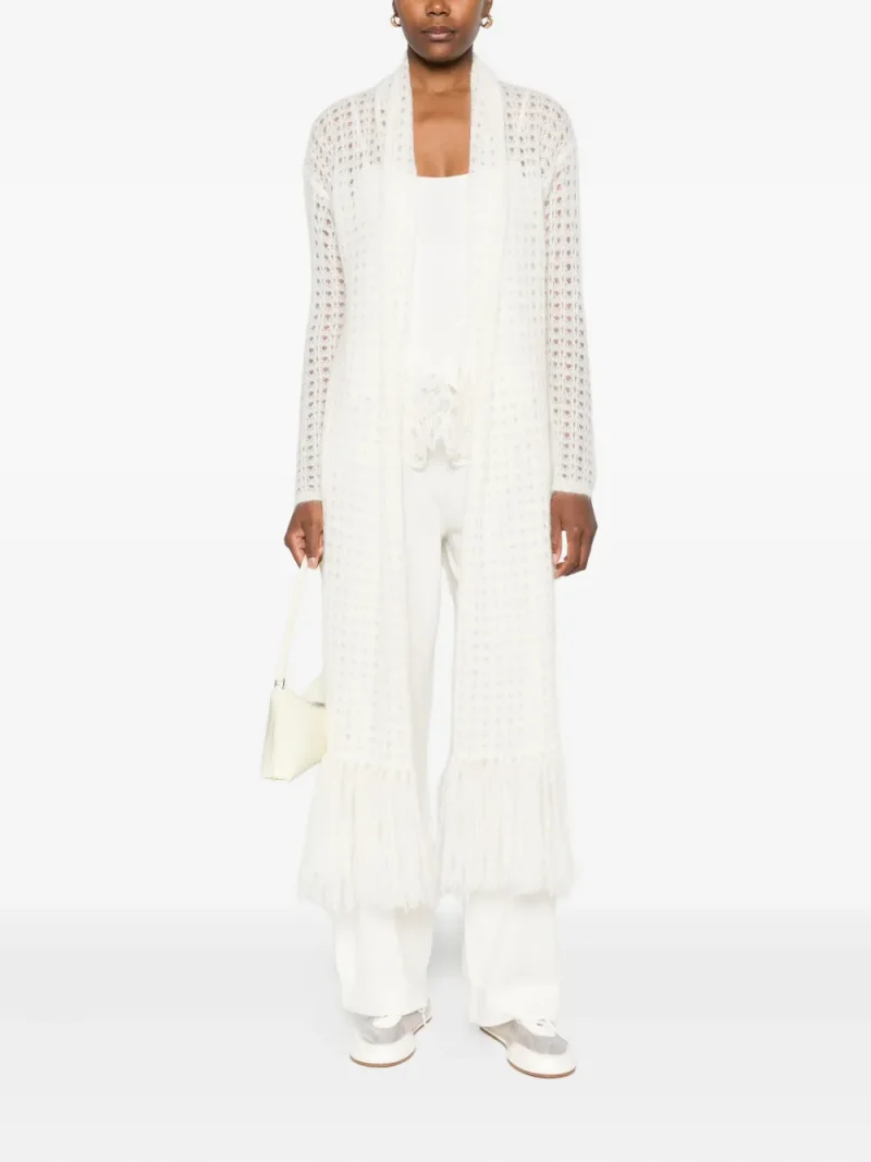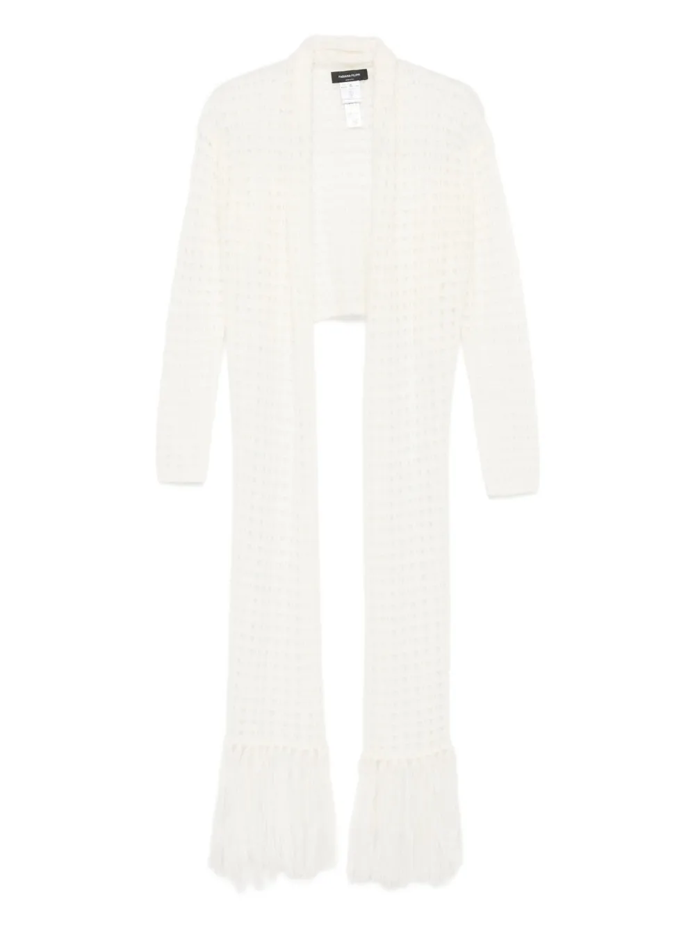 Cardigan Fabiana Filippi Fringe-Detail Open-Front alb, tricotat din mohair tip waffle, maneci lungi si inchidere nod. Potrivit pentru sezonul toamna/iarna. 65% mohair; 33% nylon; 2% lana.