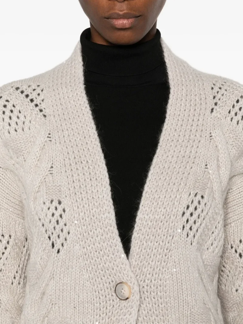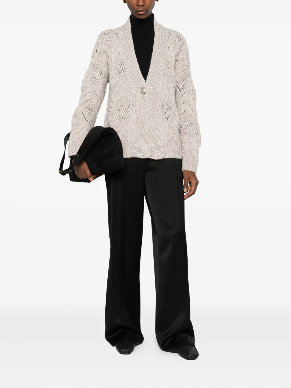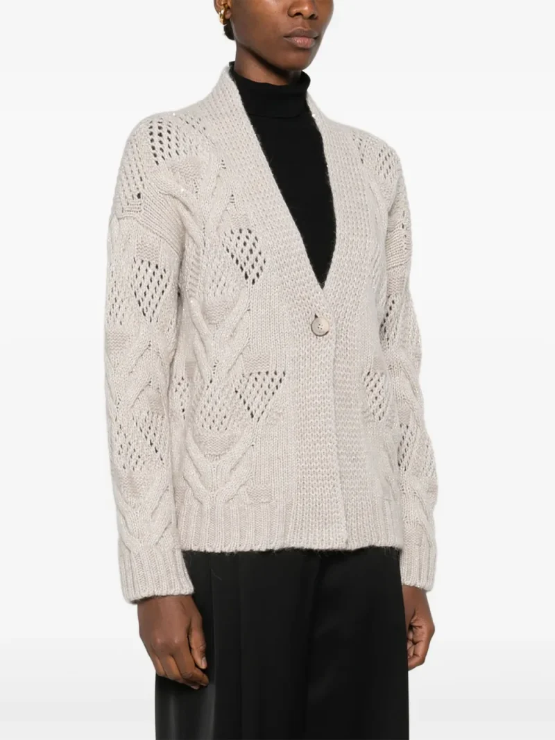 Cardigan Gran Sasso Cable-Knit Button-Fastening bej, cu decolteu in V, inchidere cu nasturi, maneci lungi tricotate si terminatii ribbed. Potrivit pentru sezonul toamna/iarna. 45% alpaca; 20% casmir; 22% lana; 10% nylon; 3% fibre metalice.