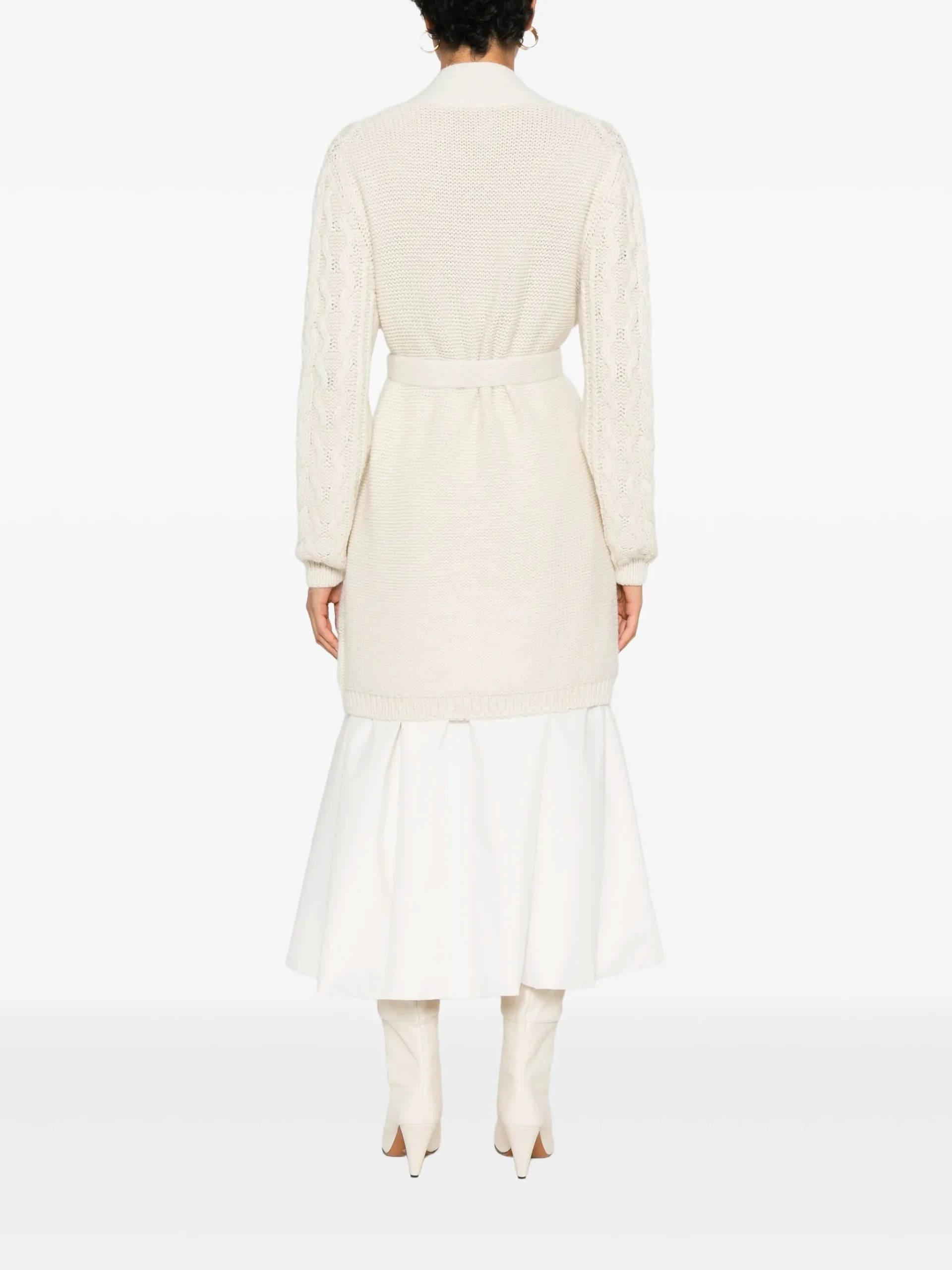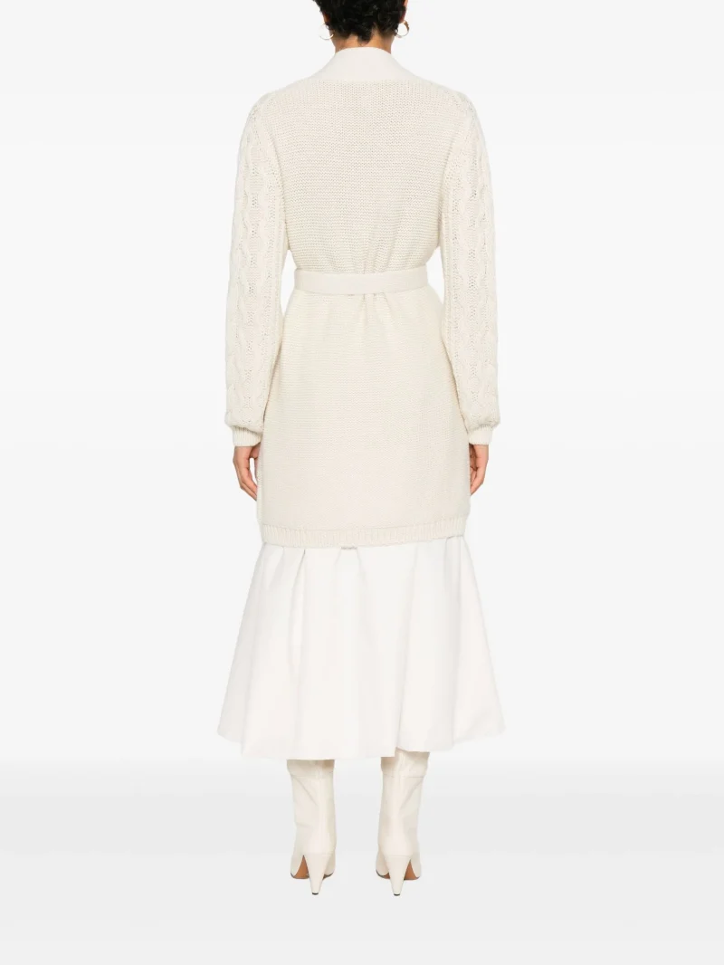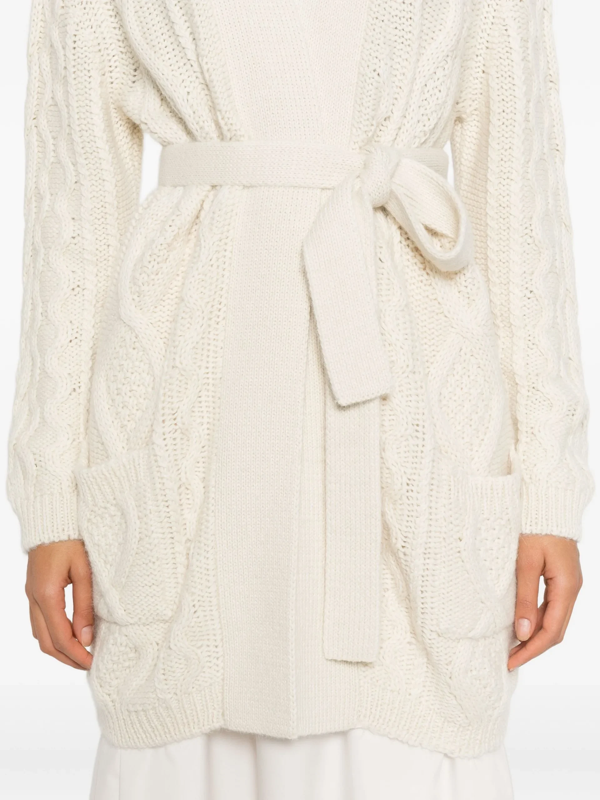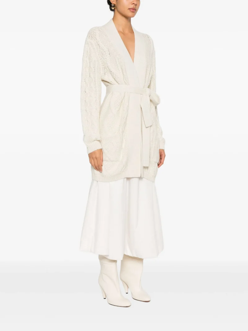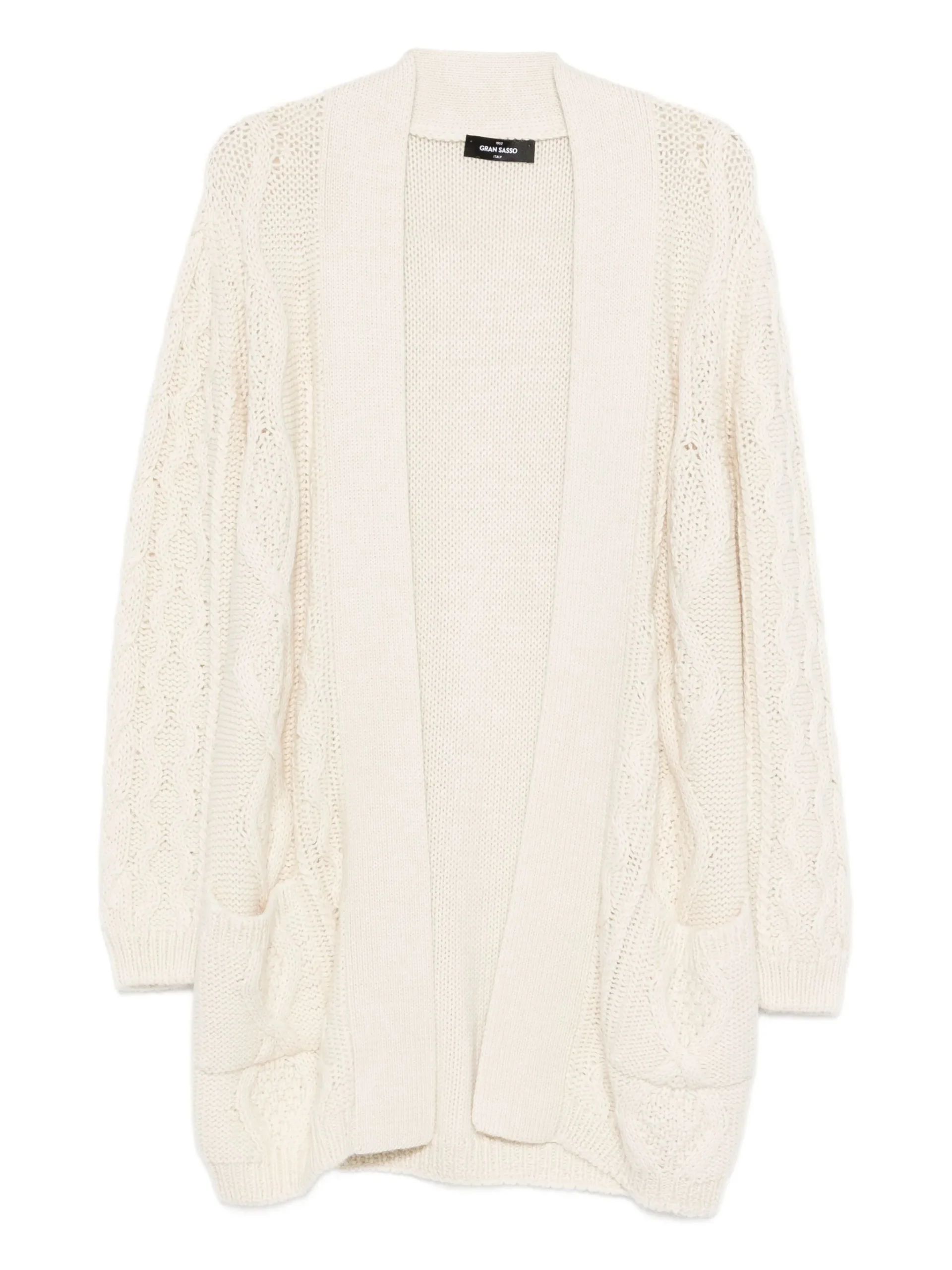 Cardigan Gran Sasso alb, realizat din tricot cable-knit pentru un aspect clasic si texturat. Model cu maneci lungi, tiv ribbed, buzunare frontale si design open front, ideal pentru tinute casual-elegante in sezonul toamna/iarna. 100% alpaca