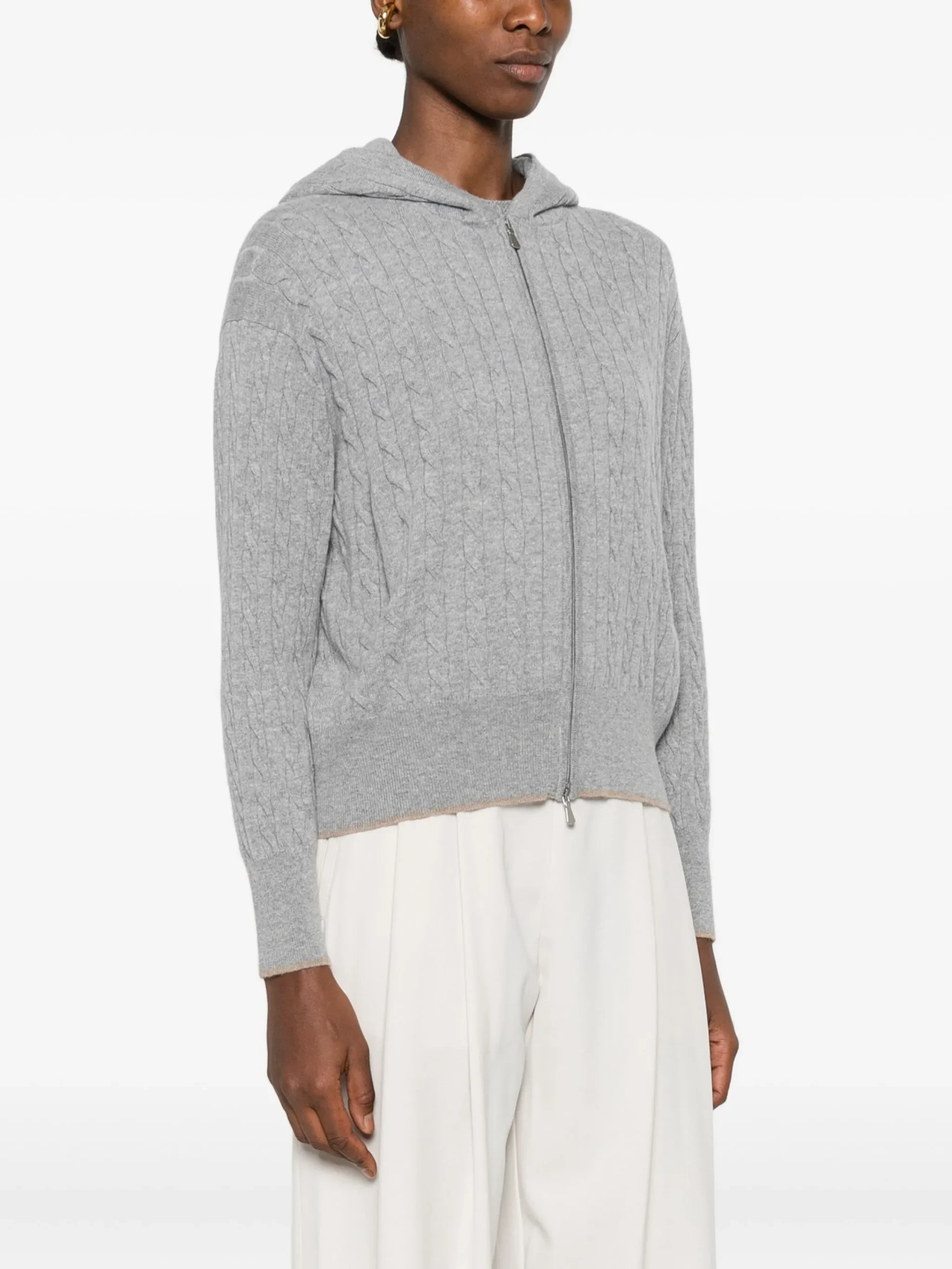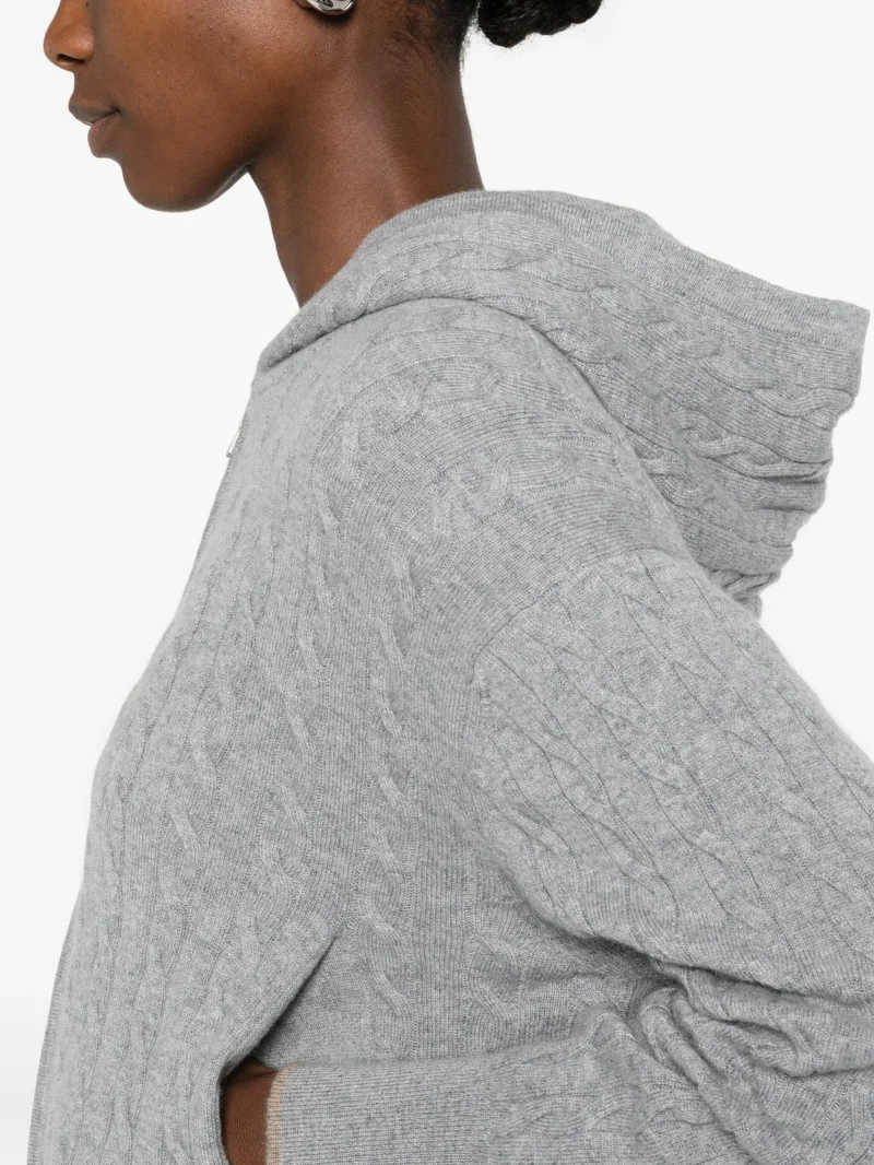 Cardigan Gran Sasso gri, realizat din tricot torsadat. Model cu gluga, maneci lungi si inchidere cu fermoar, completat de tiv nervurat pentru un aspect rafinat si confortabil. 100% casmir
