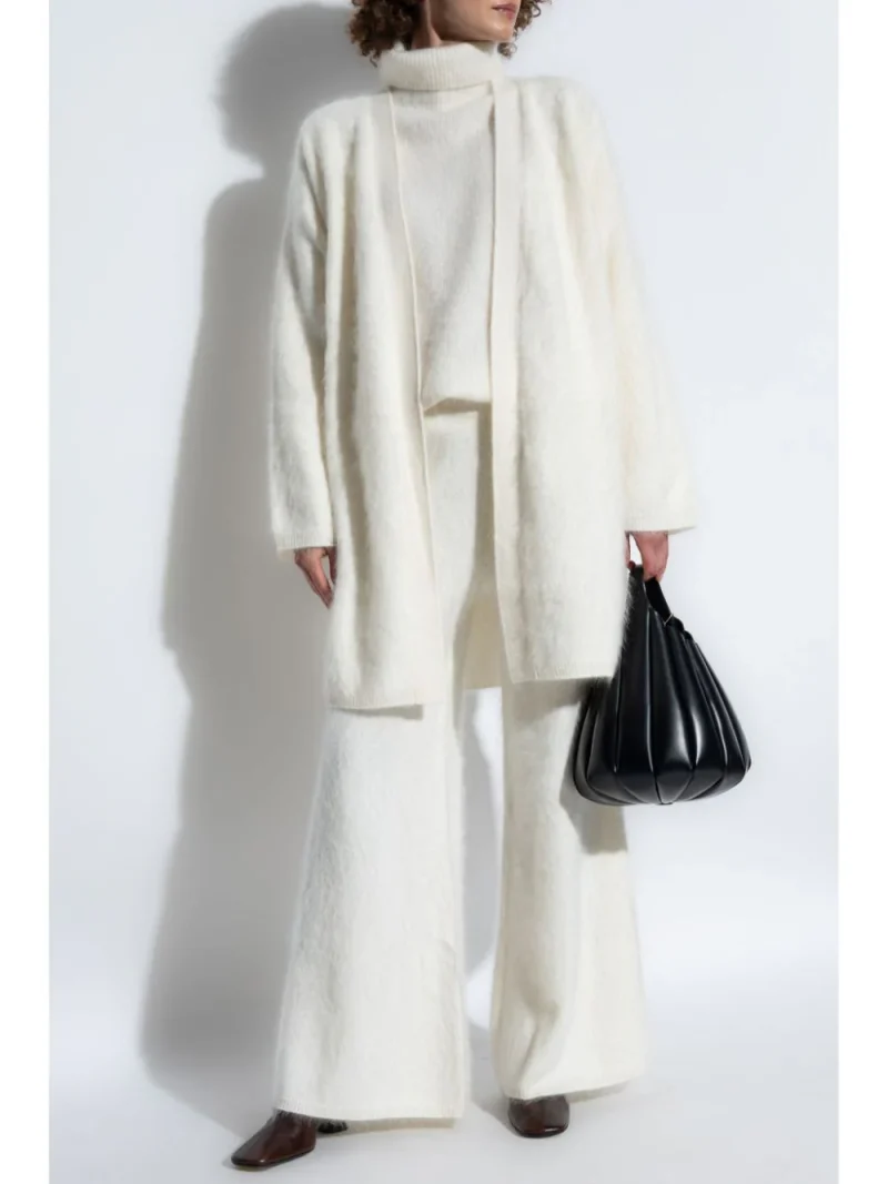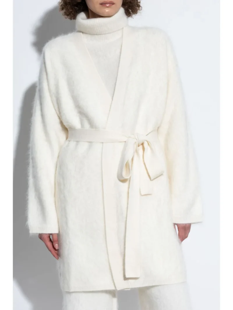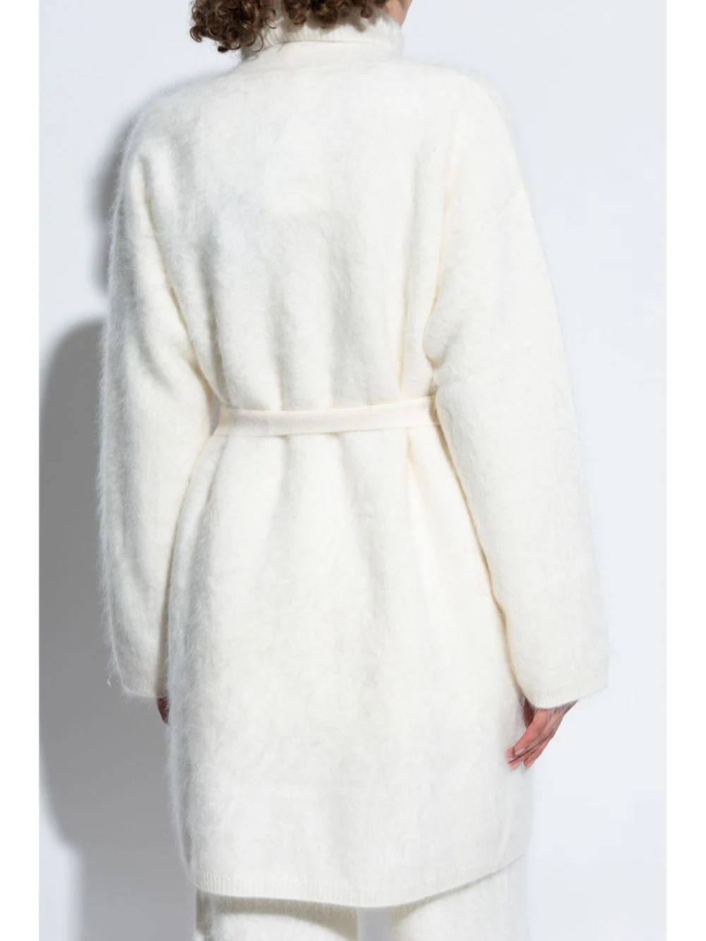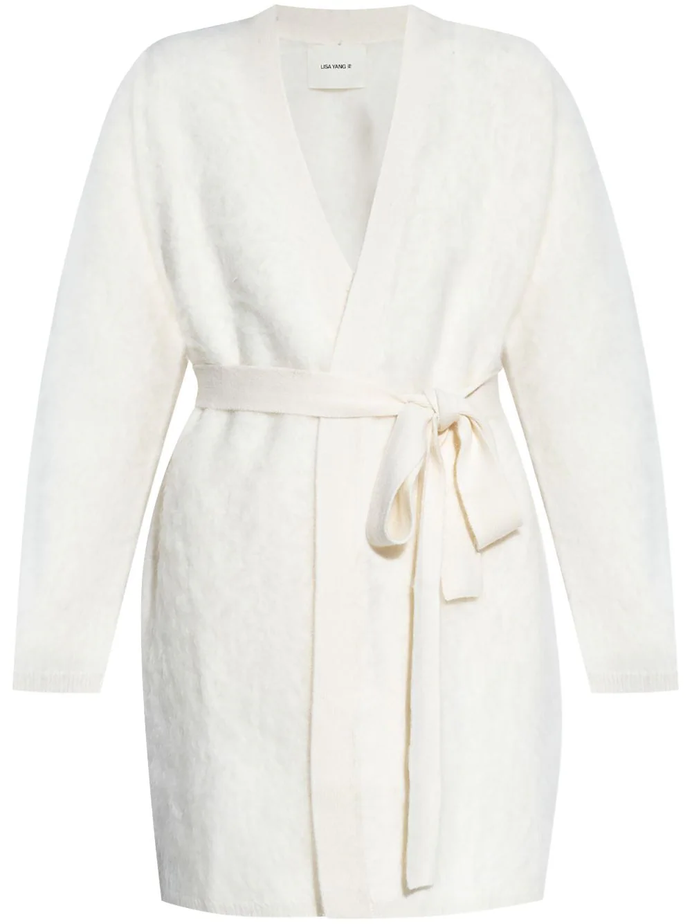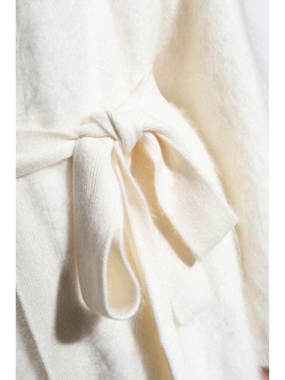 Cardigan Lisa Yang Amina bej, constructie tricotata din casmir, cu guler in V, umeri cazuti, maneci lungi, inchidere cordon in talie si tiv drept. Potrivit pentru sezonul toamna/iarna. 100% casmir.
