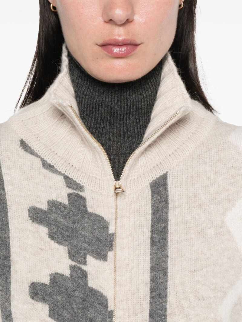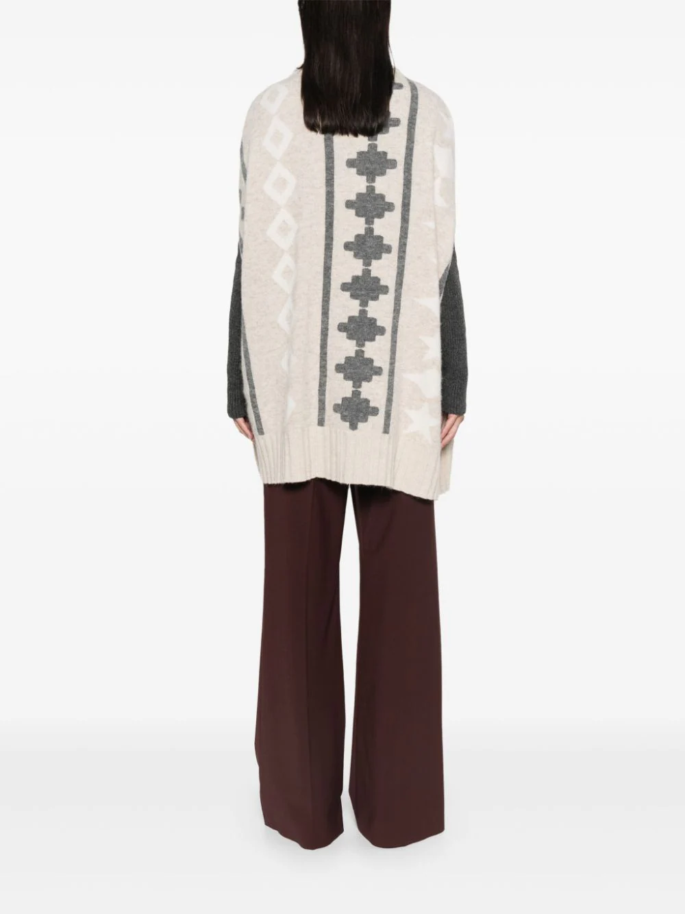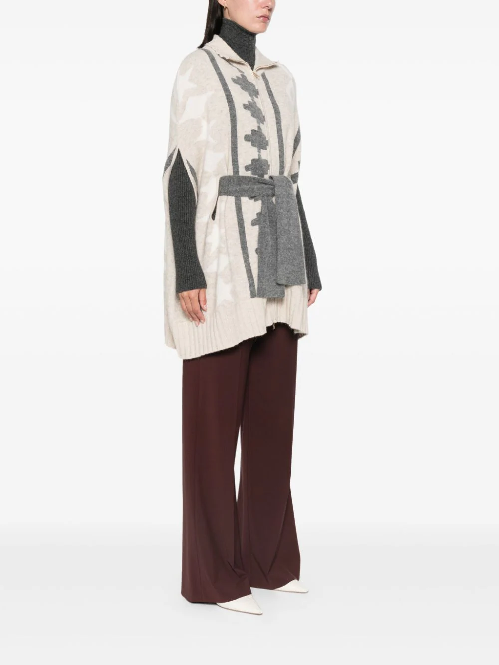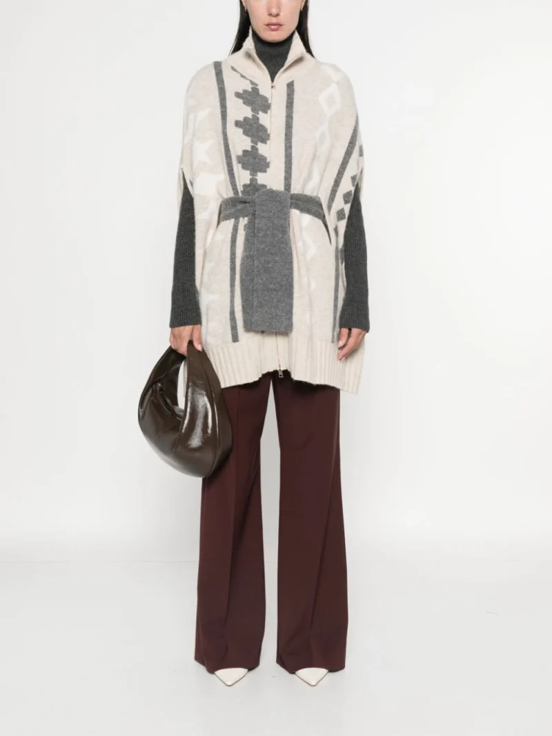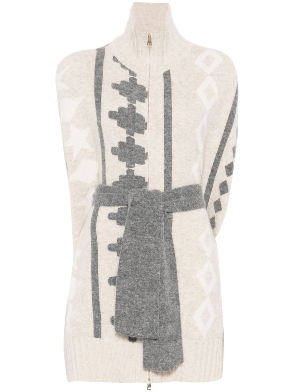Cardigan Lorena Antoniazzi Patterned Jacquard multicolor, constructie tricotata din lana, cu guler inalt, inchidere cu fermoar, maneci tip capa, cordon lat in jurul taliei, grafica in testaura pe toata suprafata si tiv drept. Potrivit pentru sezonul toamna/iarna. 48% lana; 26% alpaca; 14% nailon; 6% casmir; 65 matase.