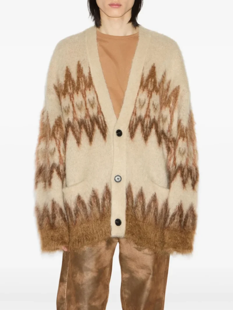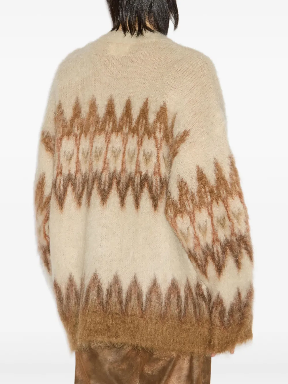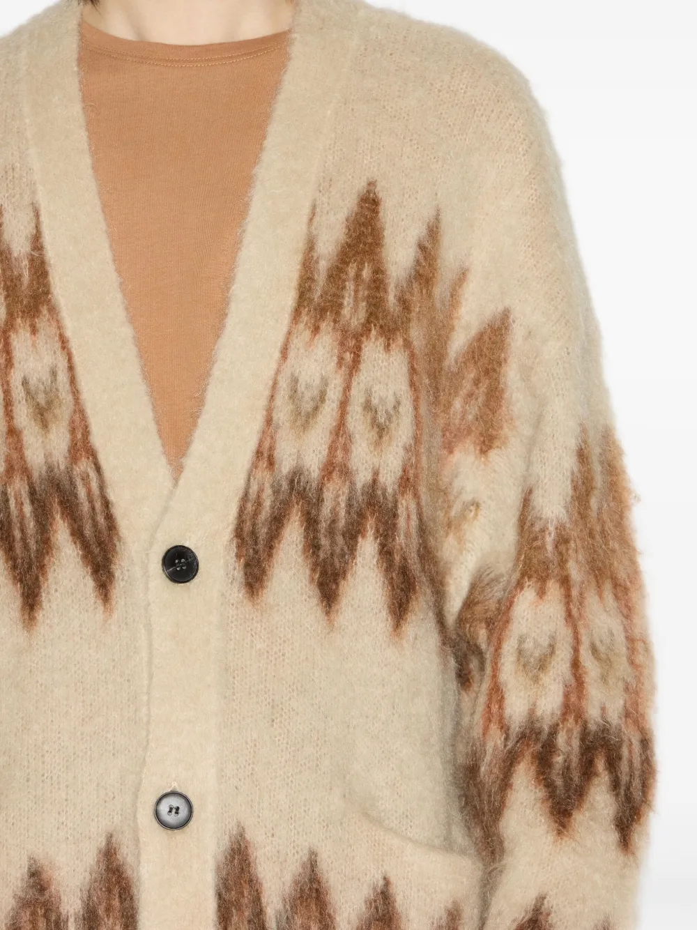 Cardigan Marant Nielson bej, cu efect brushed, cu decolteu in V, inchidere cu nasturi, maneci lungi, grafica contrastanta in tesatura si terminatii ribbed. Potrivit pentru sezonul toamna/iarna. 30% mohair, 29% lana, 23% poliamida; 18% mohair.