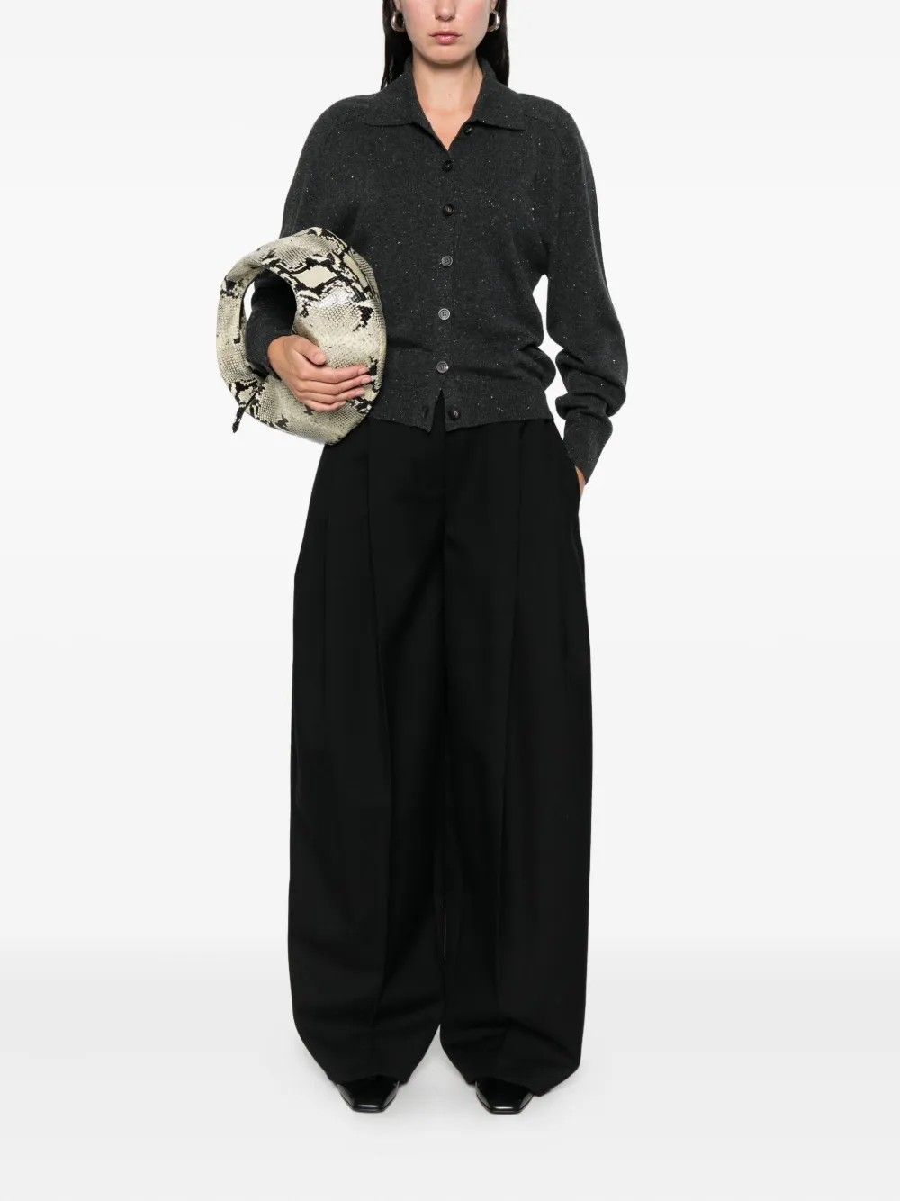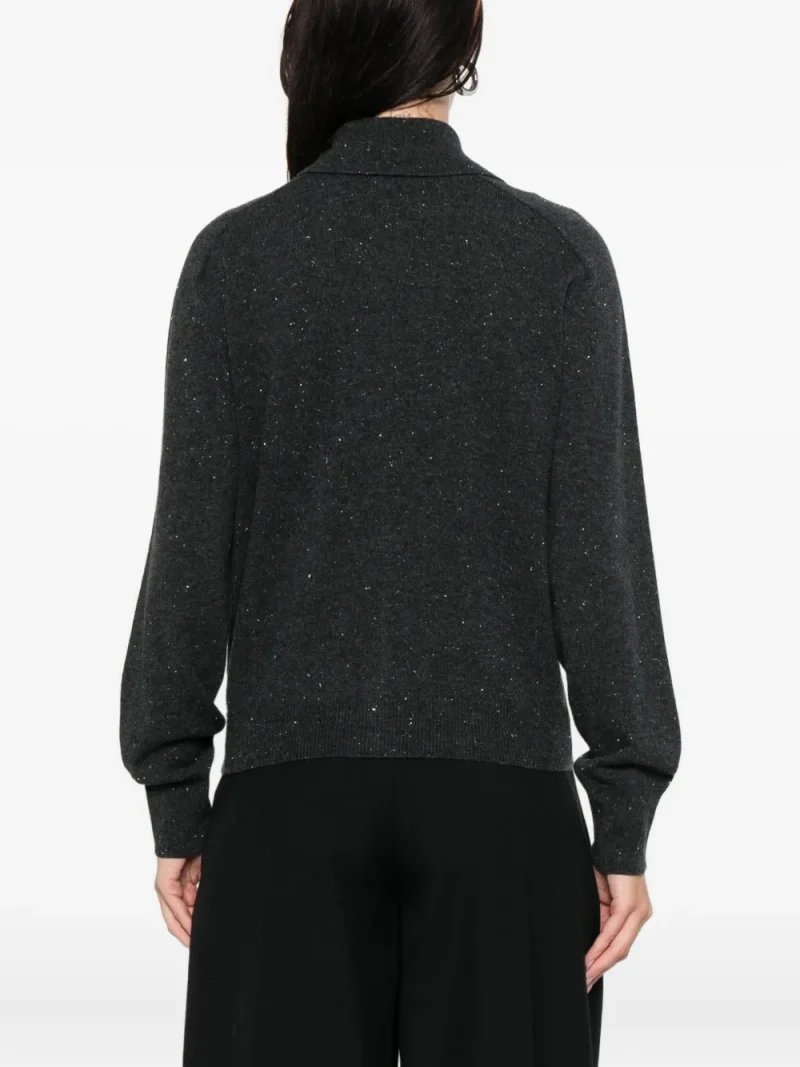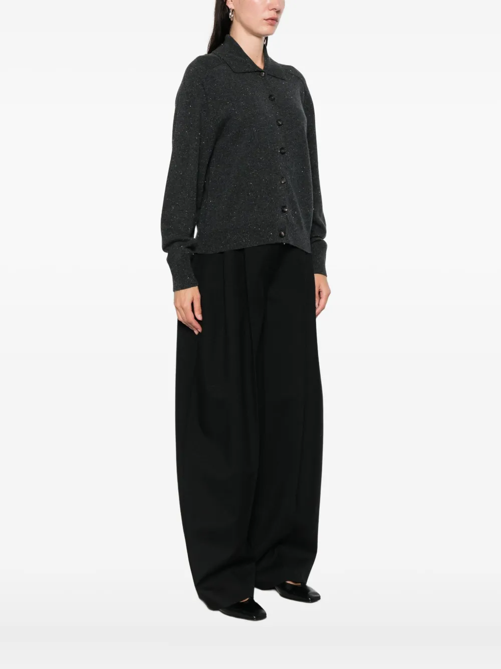 Cardigan Peserico Buttoned Collared gri, cu guler clasic, inchidere cu nasturi, maneci lungi, mansete elastice, tesatura cu fibre metalice si terminatii ribbed. Potrivit pentru sezonul toamna/iarna. 60% lana; 17% matase; 13% vascoza; 9% casmir; 1% poliester.