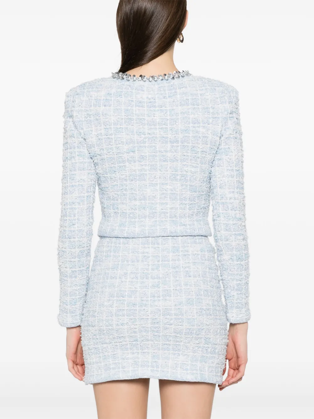 Cardigan Self-Portrait Checked albastru, din mix de materiale, cu inchidere carlig, umeri conturati, maneci lungi, buzunare aplicate la piept, tesatura tweed, detalii cu paiete sclipitoare si tiv drept. Potrivit pentru sezonul primavara/vara. 71% poliester; 26% viscoza; 3% poliamida.