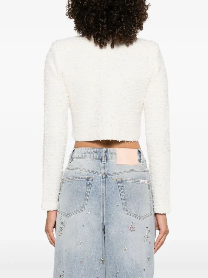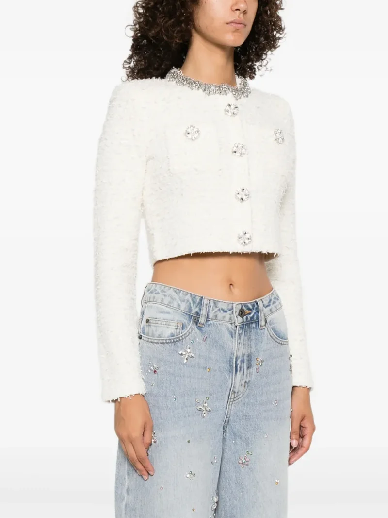 Cardigan Self Portrait embellished-buttons alb, inchidere cu nasturi, decolteu cu cristale, tricotaj texturat.41% bumbac 30% poliester 15% nylon 13% lana 1% elastan