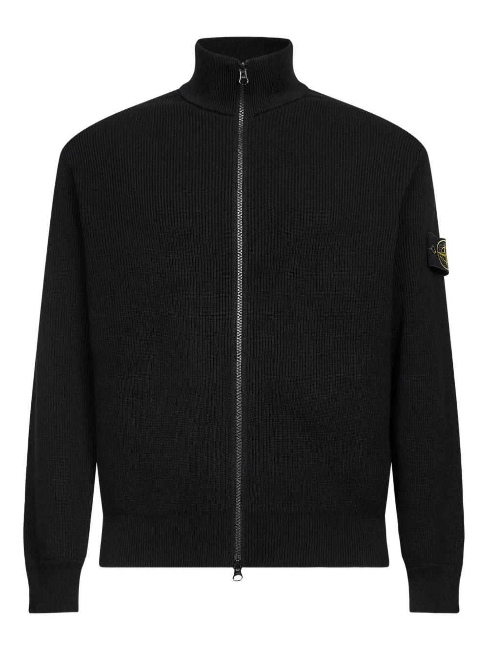 Cardigan Stone Island Ribbed negru, cu guler inalt, inchidere cu fermoar bidirectional, maneci lungi, tesatura ribbed si logo compass badge pe maneca. Potrivit pentru sezonul primavara/vara. 100% bumbac.