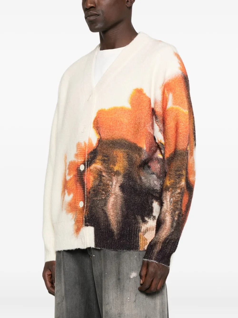 Cardigan Y-3 Grphic-Print ecru, realizat din lana, cu decolteu in V, inchidere cu nasturi, maneci lungi, grafica Y-3 in tesatura si tiv drept. Potrivit pentru sezonul toamna/iarna. 50% nylon; 50% lana.