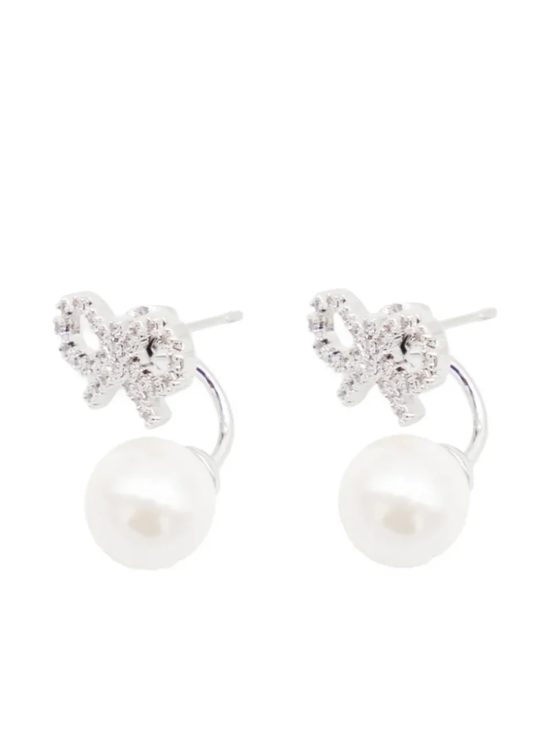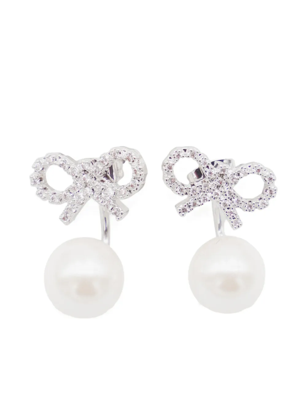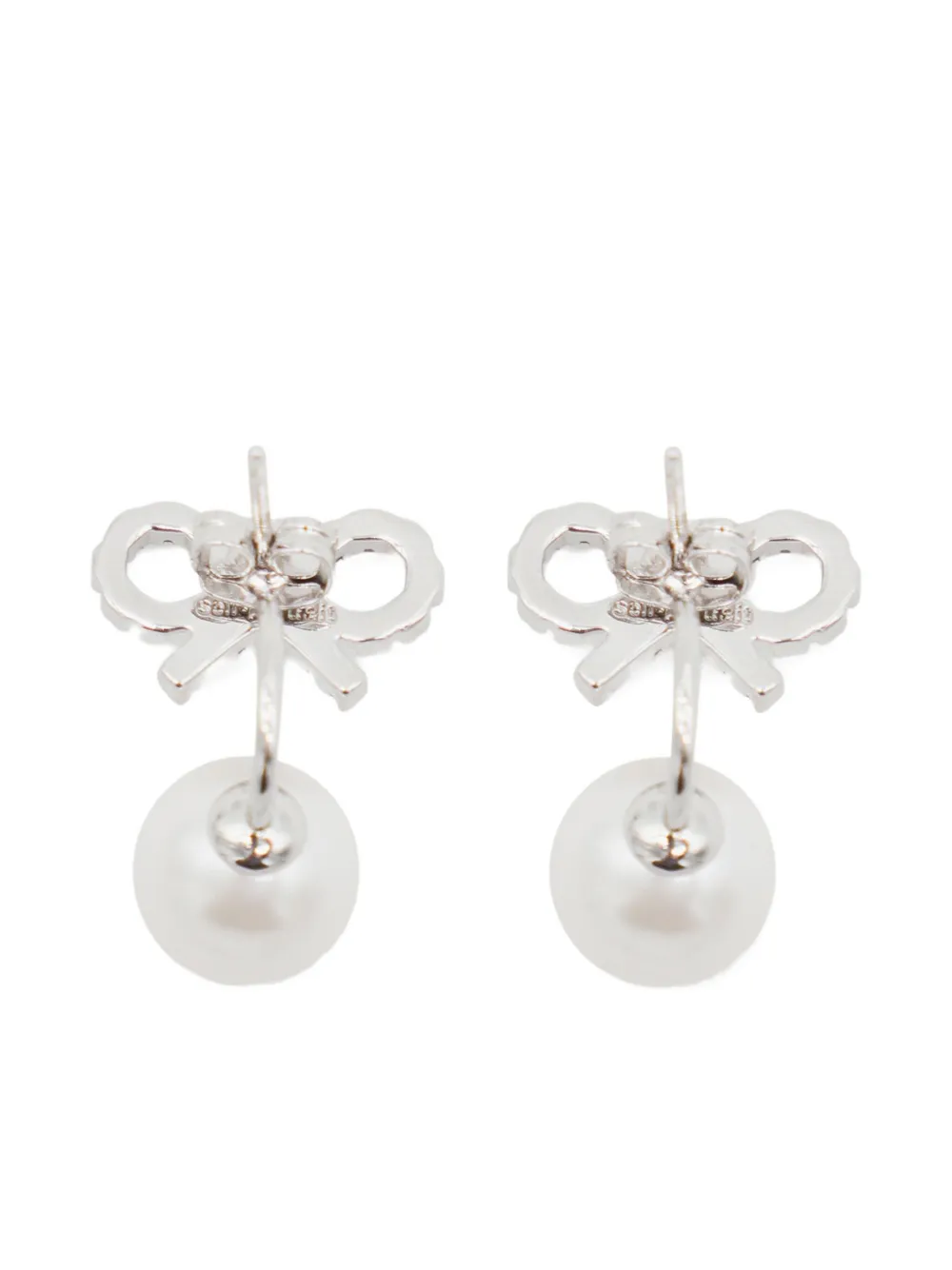 Cercei Self-Portrait Crystal Bow argintiu, din alama, design drop decorat cu funda, cristale de zirconiu incrustate si perla decorativa. 100% perla decorativa; 100% inox; 100% zirconiu; 100% alama placata cu argint.