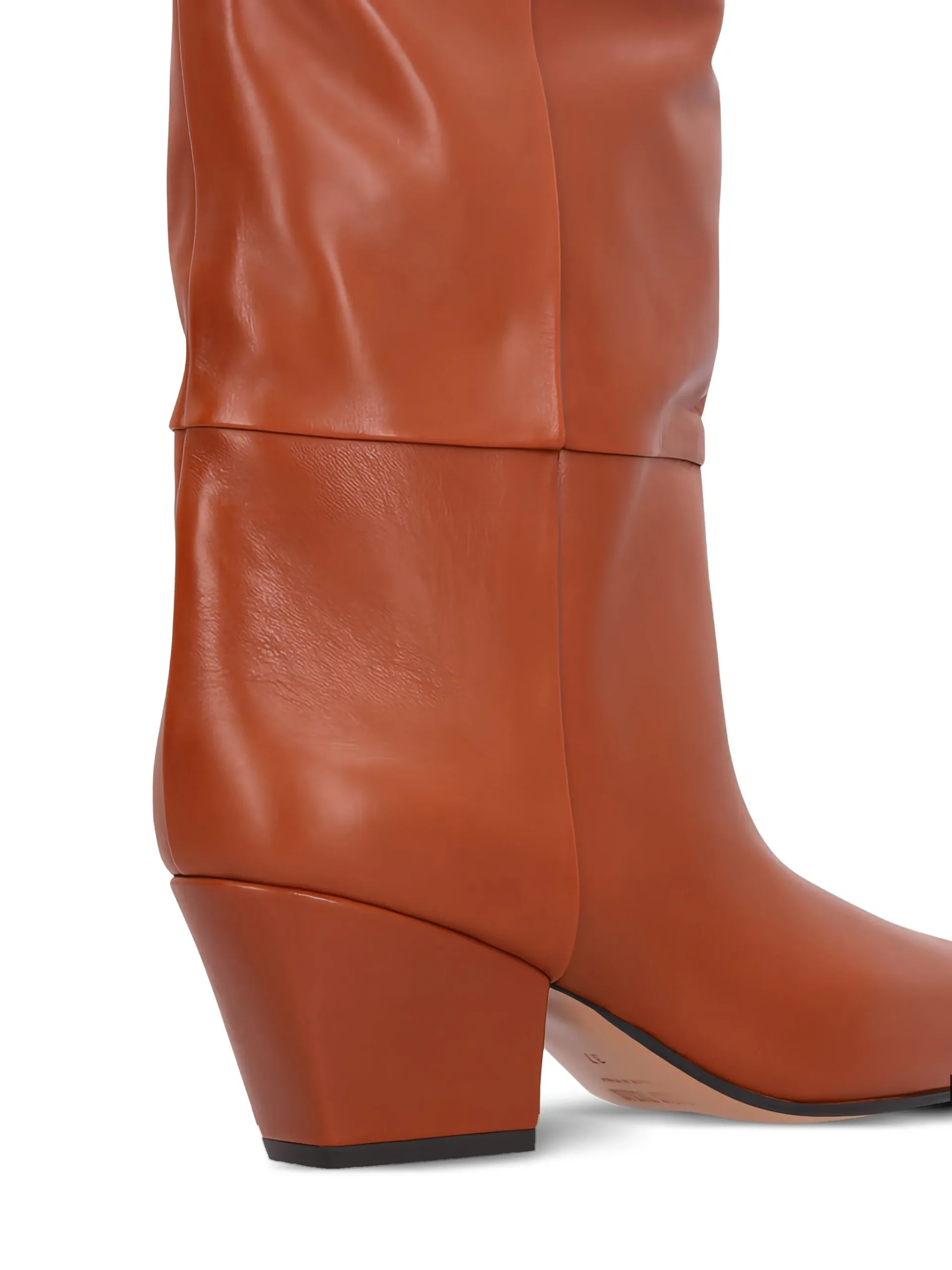 Cizme Paris Texas Jane 60mm maro, din piele, cu shaft lejer, varf ascutit, toc bloc si lungime pana la genunchi. Potrivite pentru sezonul toamna/iarna.100% piele