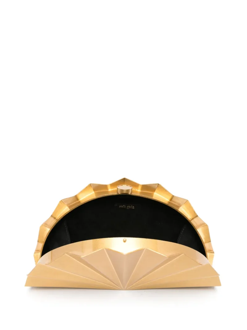Clutch Cult Gaia Esme auriu, din alama, in forma de evantai, cu inchidere magnet si comprtiment principal. 100% metal placat cu alama.