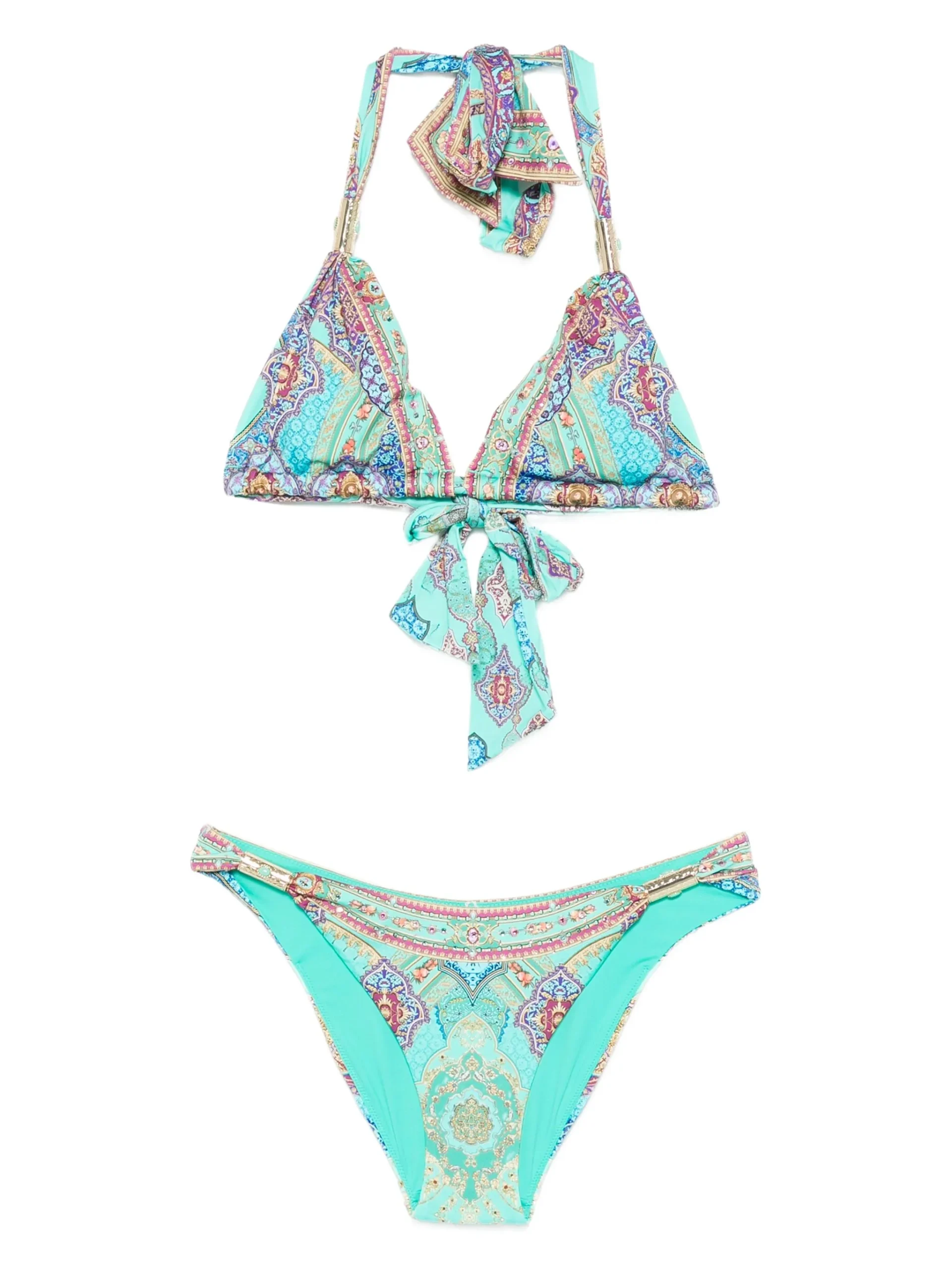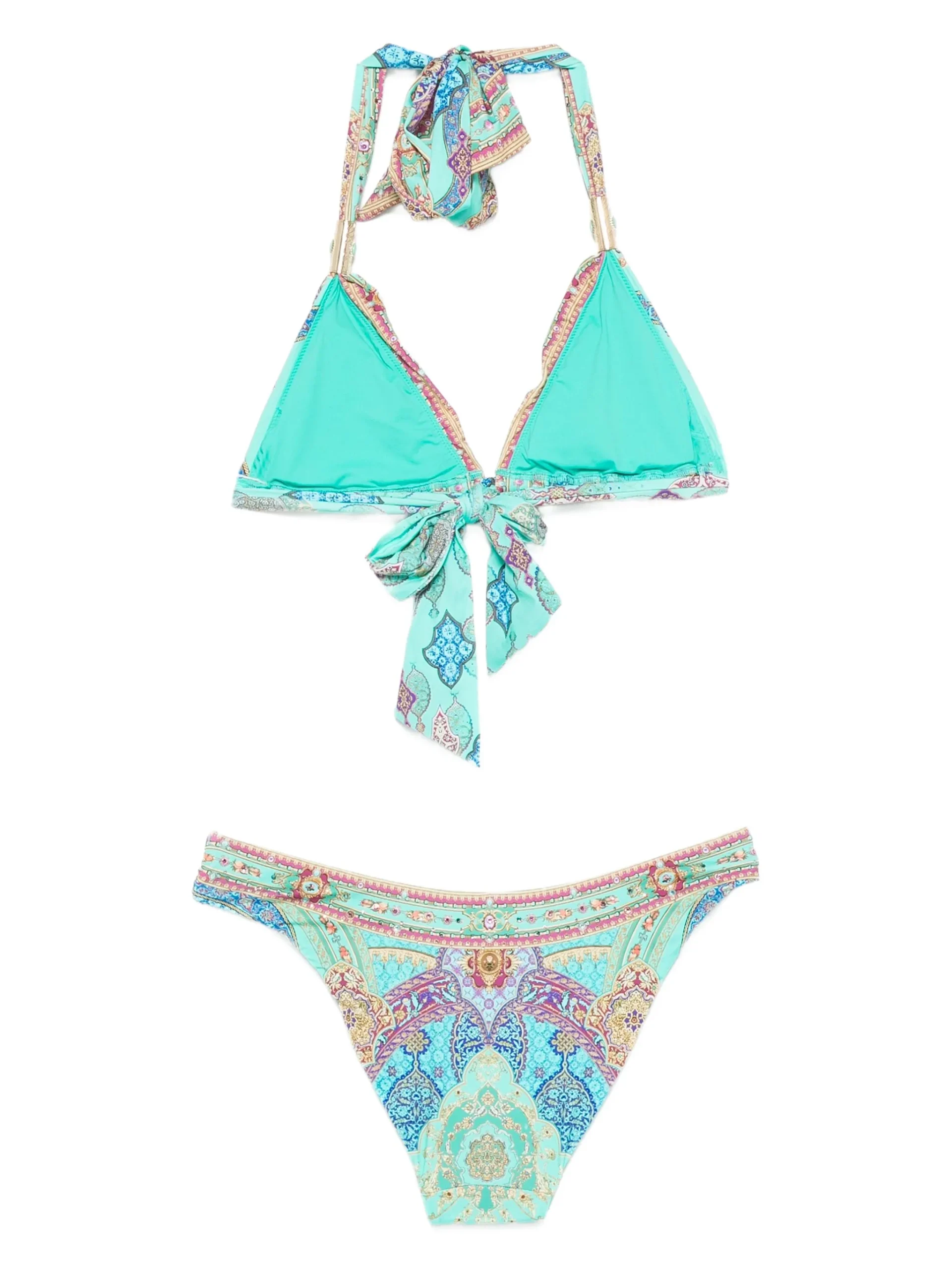 Costum de baie Camilla albastru, cu paisley print, bretele halterneck si top triunghi. Aveti grija sa probati costumele de baie deasupra propriilor articole de imbracaminte.82% poliamida 18% elastan