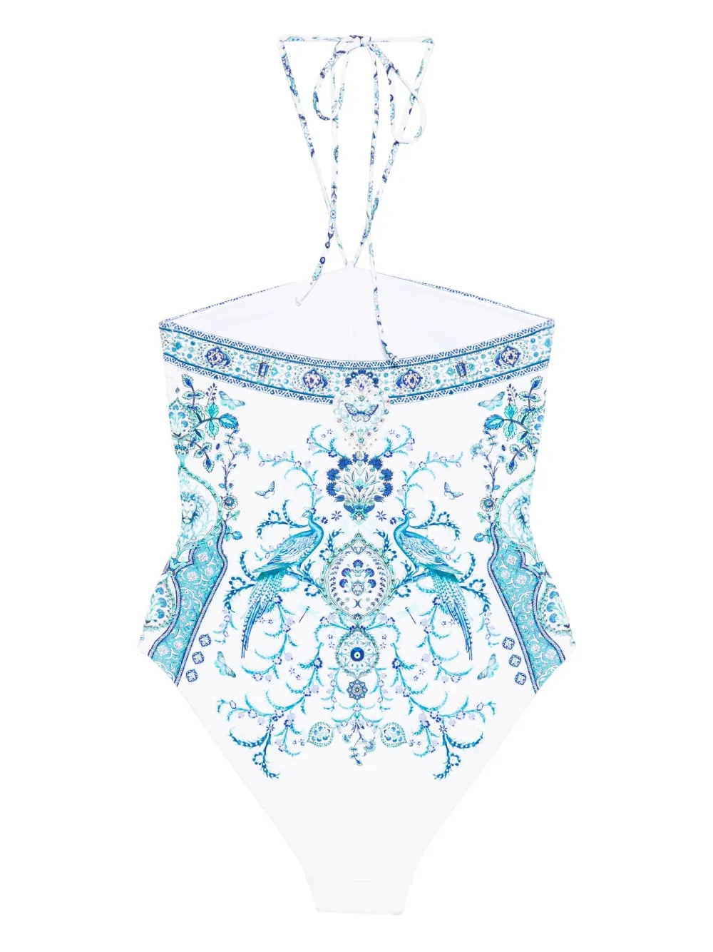 Costum de baie Camilla Halter-Neck Paisley-Print alb, cu inchidere snur, tesatura elastica si grafica Paisley imprimata. Aveti grija sa probati costumele de baie deasupra propriilor articole de imbracaminte. 82% poliamida; 18% elastan.