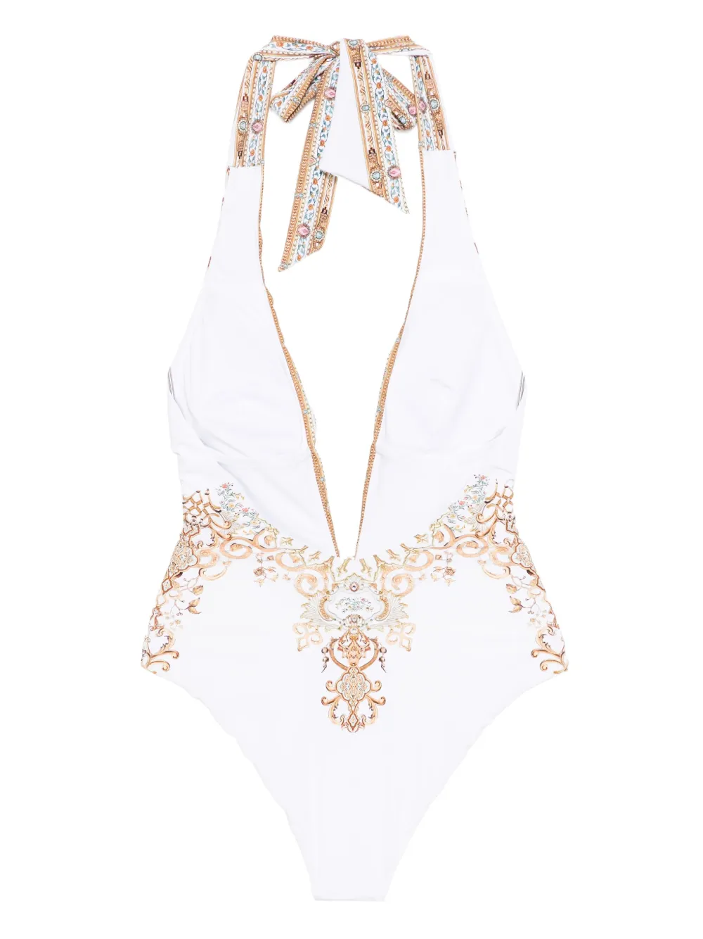 Costum de baie Camilla Halterneck Embellished alb, cu decolteu in V, inchidere cu funda la spate, spatele gol, grafica Camilla imprimata si cristale sclipitoare aplicacte. Aveti grija sa probati costumele de baie deasupra propriilor articole de imbracaminte. 79% poliamida; 21% elastan.