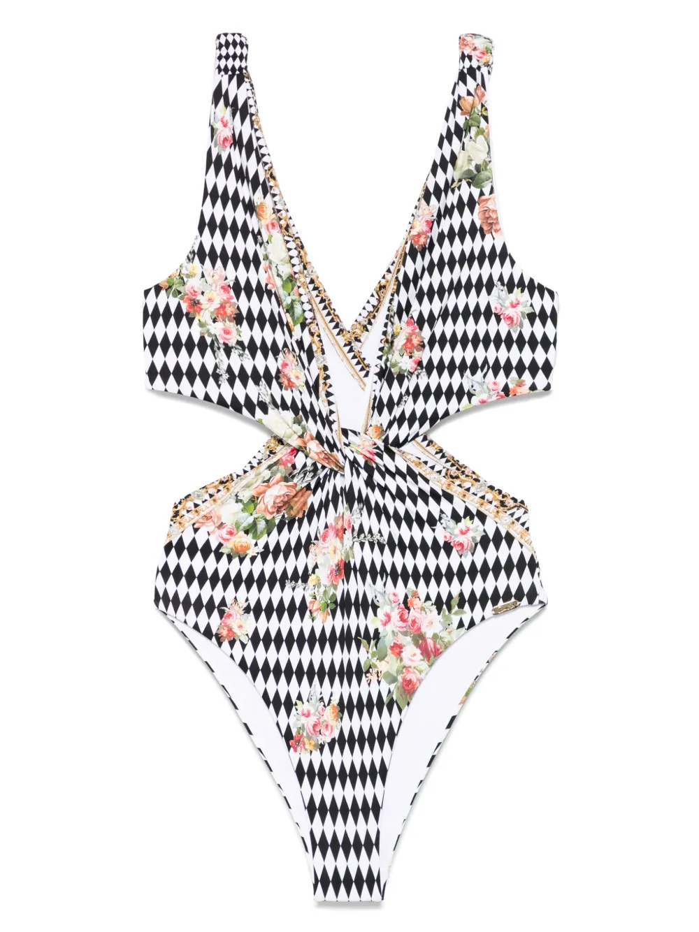 Costum de baie Camilla Rococo Glow Twist negru, format dintr-o singura piesa, cu barete pentru umeri, decolteu in V cu detaliu twist si grafica Rococo imprimata. Aveti grija sa probati costumele de baie deasupra propriilor articole de imbracaminte. 82% ECONYL; 18% Elastan; 90% poliamida reciclata; 10% elastan.