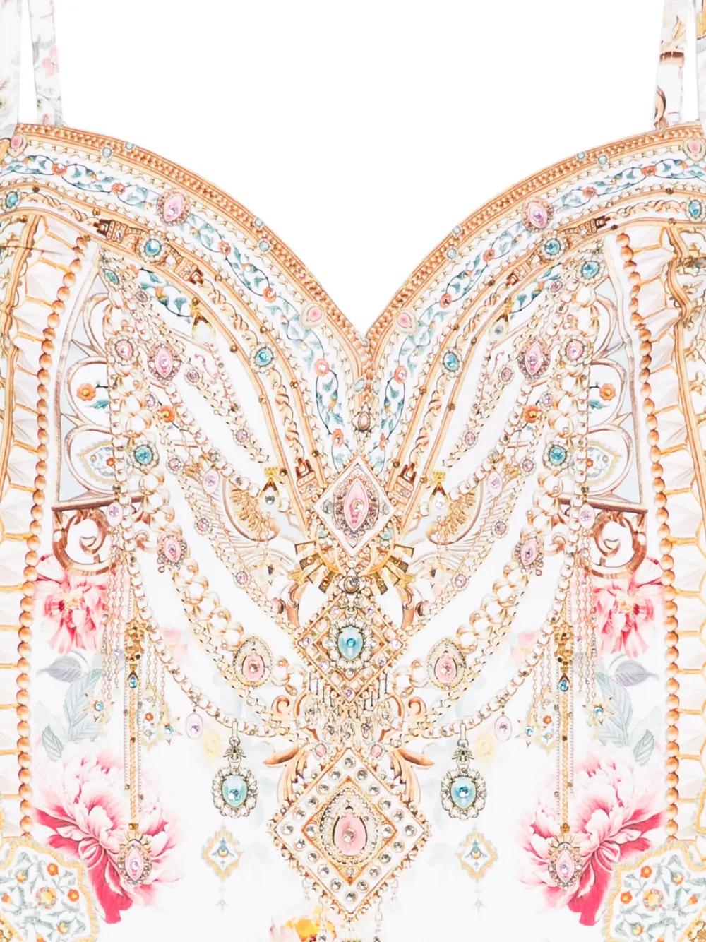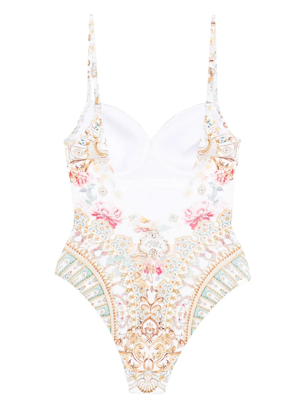 Costum de baie Camilla Sweetheart-Neck Embellished alb, format dintr o singura piesa, cu decokteu sweetheart, barete ajustabile pentru umeri, grafica imprimata si cristale sclipitoare aplicate. Aveti grija sa probati costumele de baie deasupra propriilor articole de imbracaminte. 82% poliamida; 18% elastan.