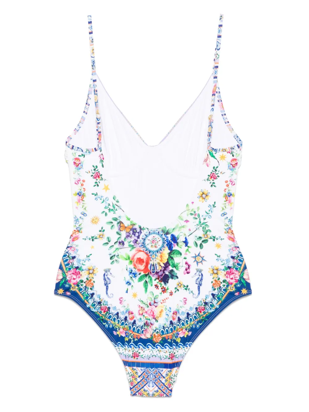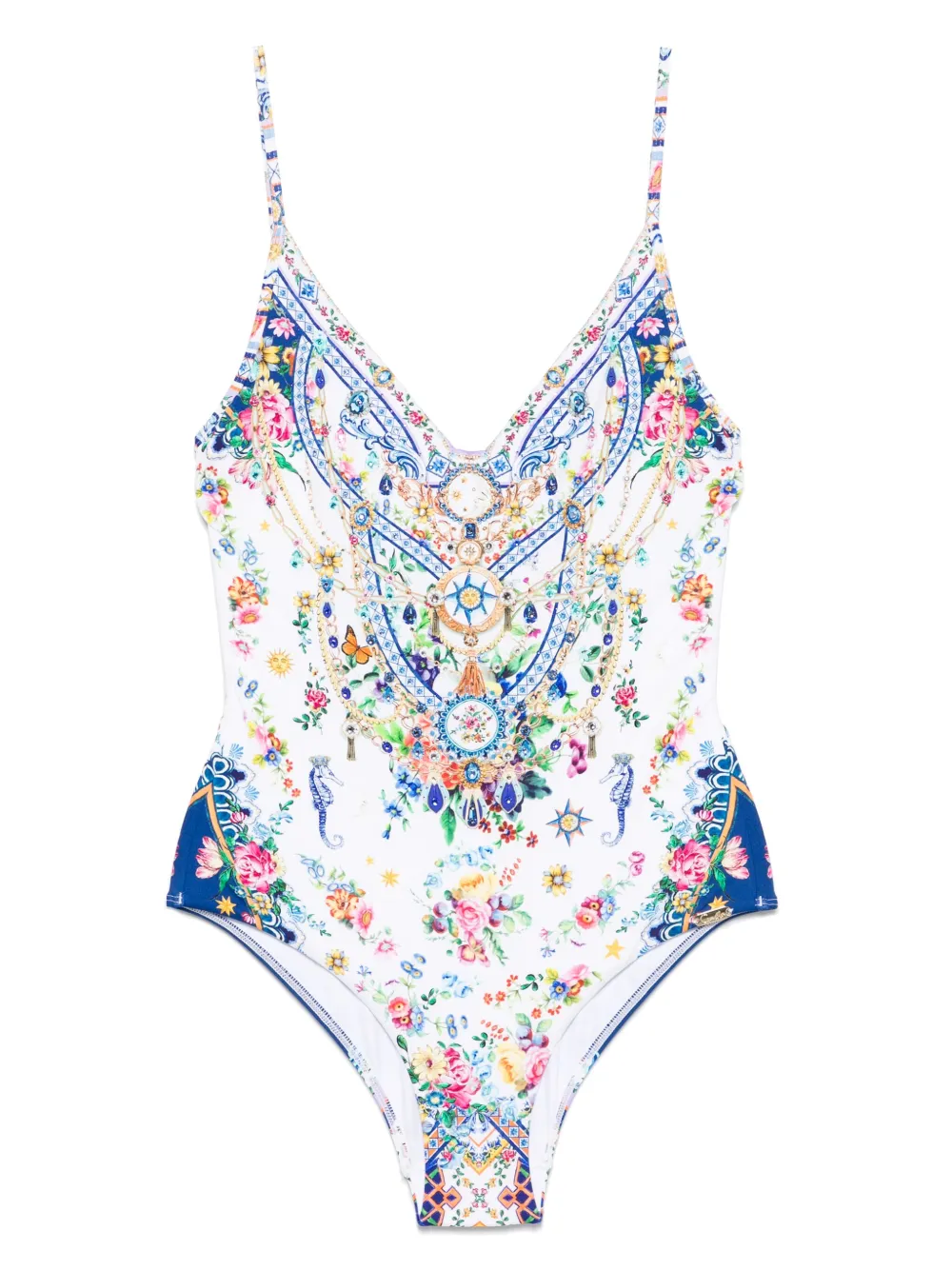 Costum de baie Camilla Tiles Darls multicolor, din poliamida, format dintr-o singura piesa, cu barete subtiri pentru umeri, decolteu in V, grafica Tiles imprimata si spatele gol. 82% poliamida reciclata; 90% polimida reciclata; 18% elastan; 10% elastan. Aveti grija sa probati costumele de baie deasupra propriilor articole de imbracaminte.