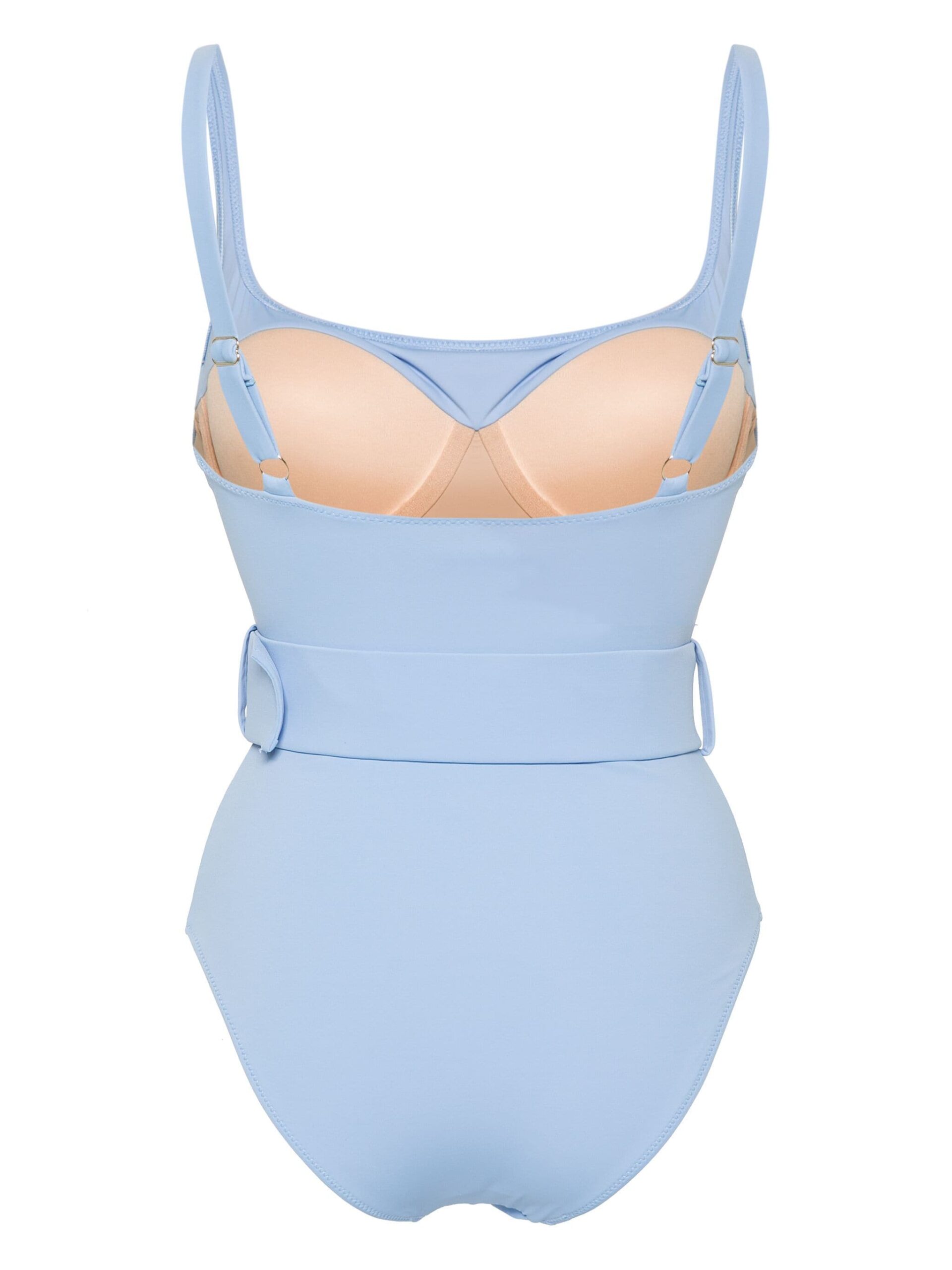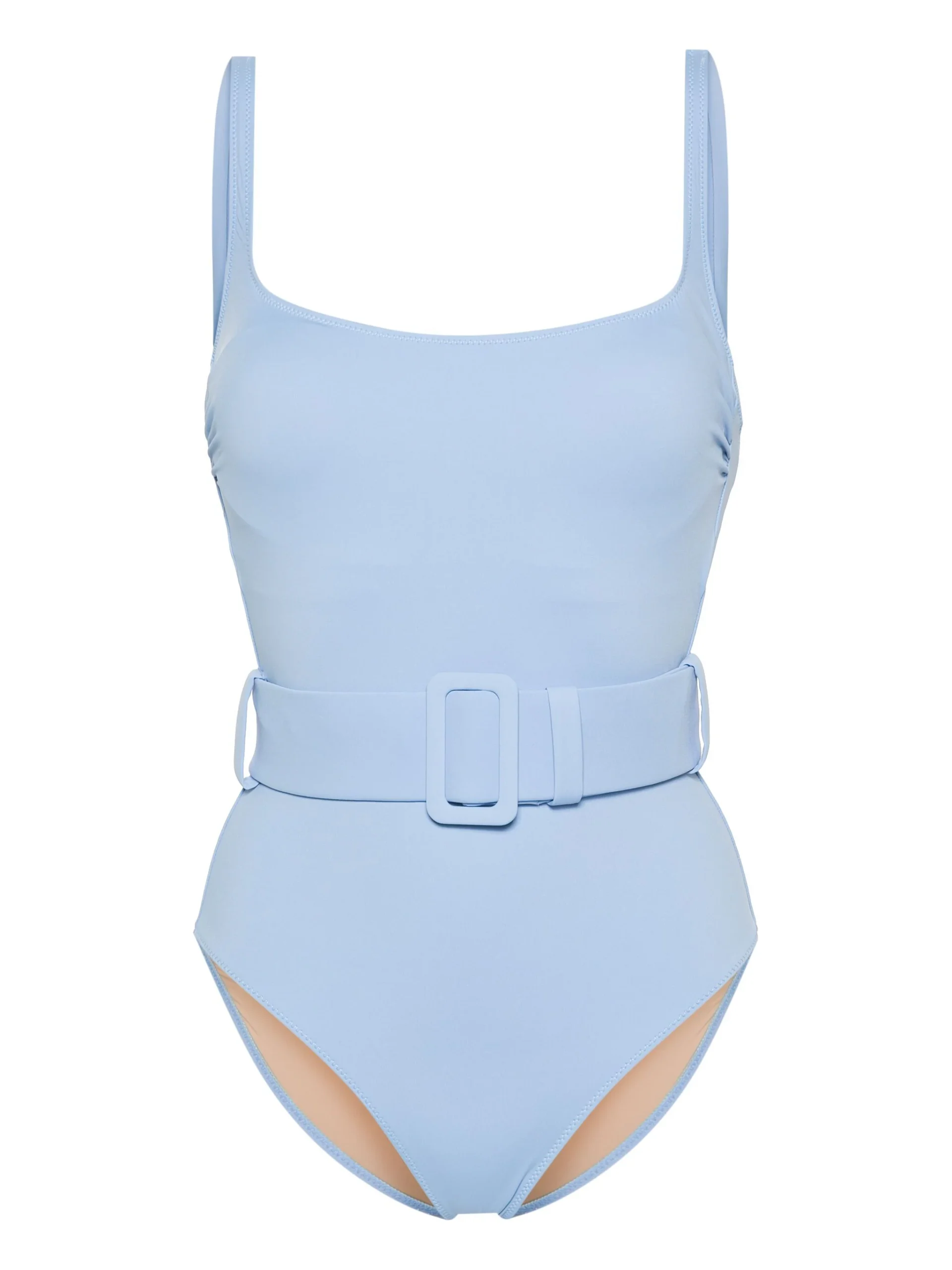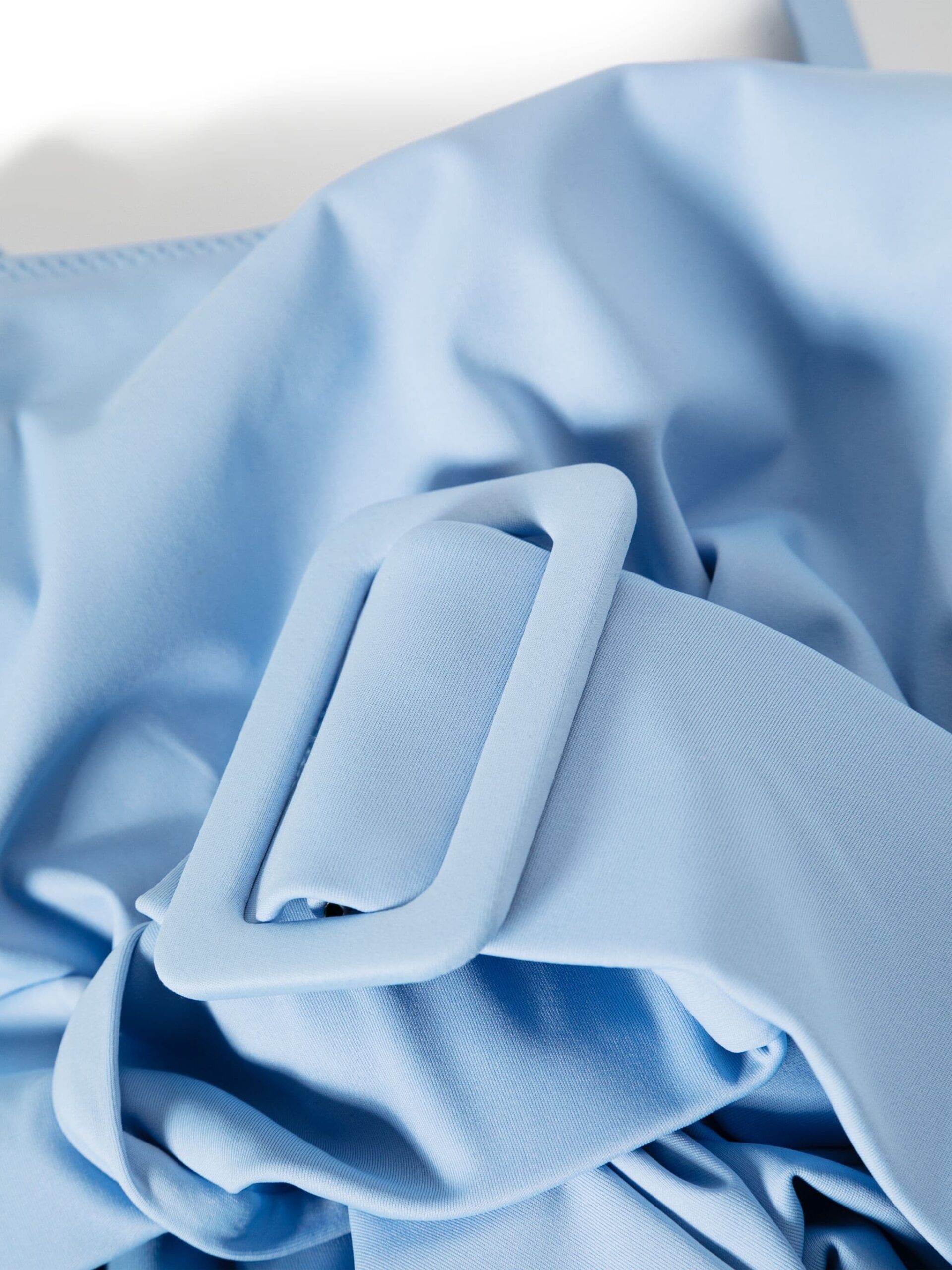 Costum de baie albastru din poliamida reciclata, de plaja, cu barete ajustabile si decolteu, cupe rotunde, spatele gol, centura in jurul taliei si tesatura elastica. 65% poliamida reciclata; 35% elastan. Aveti grija sa probati costumele de baie deasupra propriilor articole de imbracaminte.