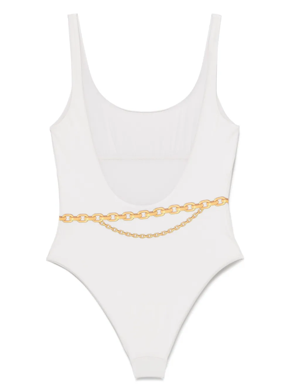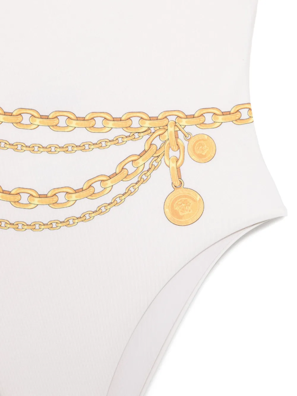 Costum de baie Versace Treasure-Print alb, din poliester, cu barete si decolteu, spatele gol, grafica Chain Link in jurul taliei si tesatura elastica. 88% poliester; 22% elastan; 78% poliester; 12% elastan. Aveti grija sa probati costumele de baie deasupra propriilor articole de imbracaminte.