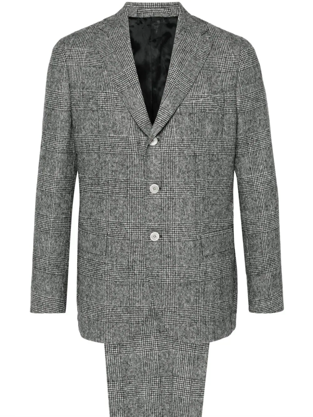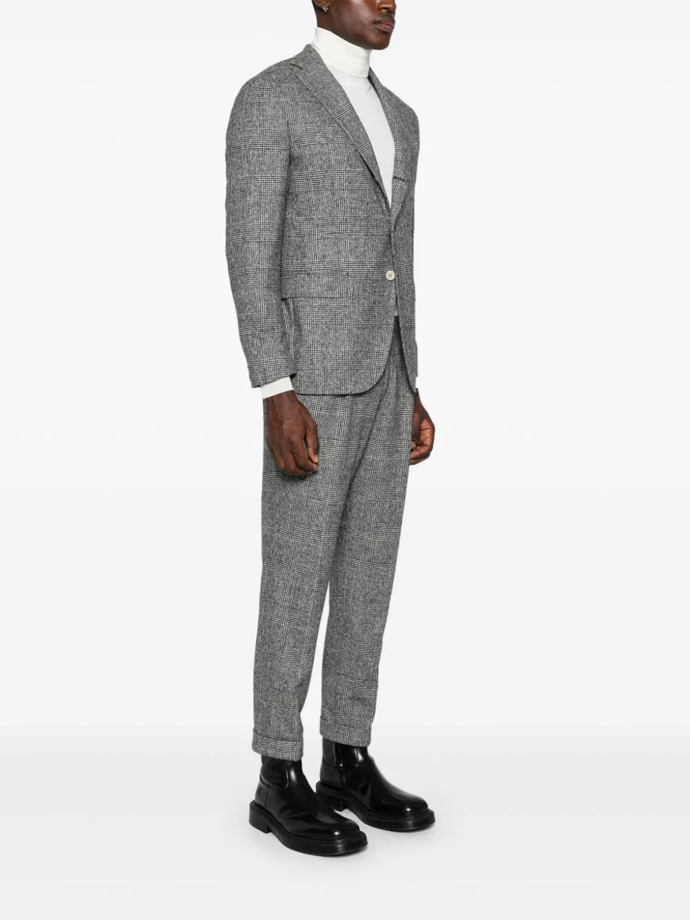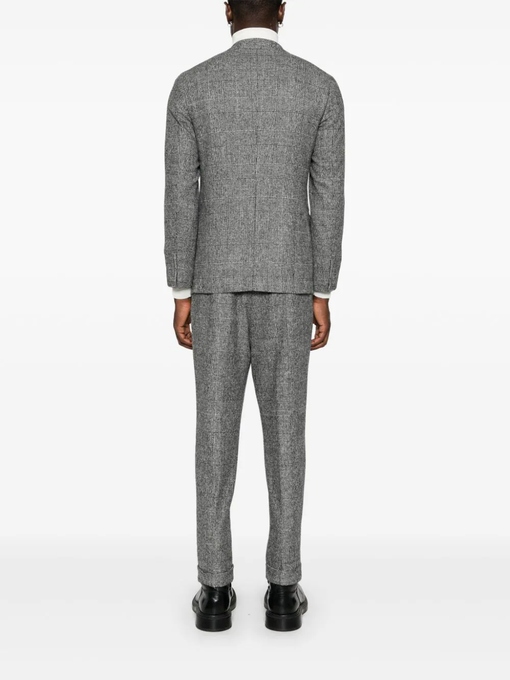 Costum Eleventy Checkered, din lana, format din sacou cu rever ascutit, inchidere cu nasturi, maneci lungi, mansete cu nasturi, buzunar welt la piept, buzunare cu clapa pe partea din fata, captuseala din viscoza cu tiv curbat, si pantaloni cu forma conica, inchidere cu nasture si fermoar, buzunare oblice si buzunare tip welt la spate. Potrivit pentru sezonul toamna/iarna. 100% viscoza; 58% alpaca; 27% lana.