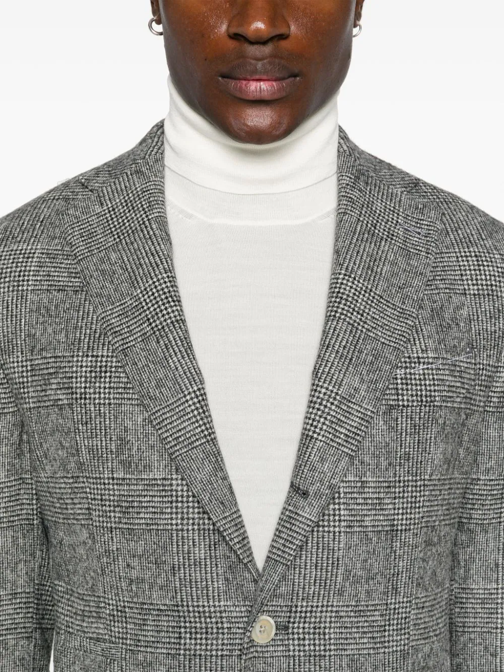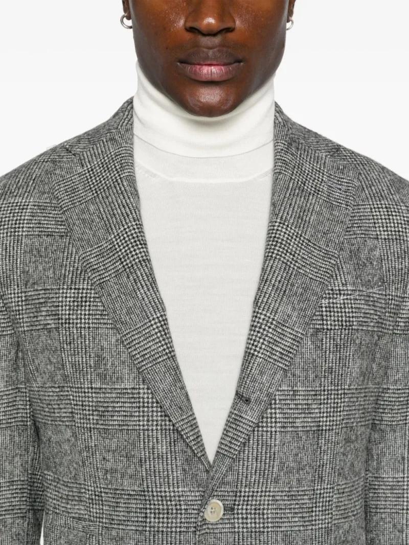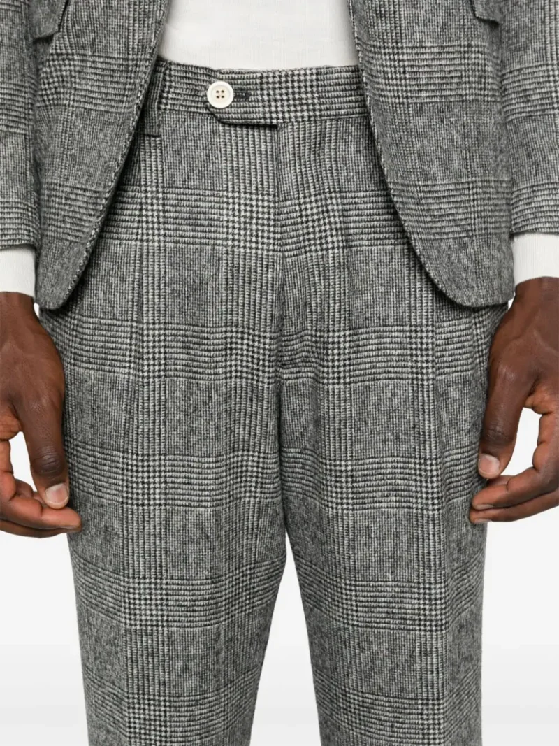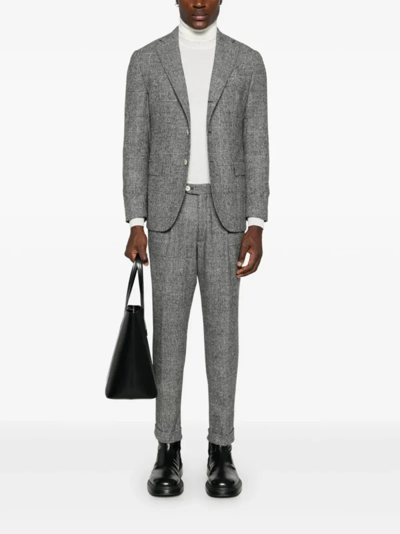 Costum Eleventy Checkered, din lana, format din sacou cu rever ascutit, inchidere cu nasturi, maneci lungi, mansete cu nasturi, buzunar welt la piept, buzunare cu clapa pe partea din fata, captuseala din viscoza cu tiv curbat, si pantaloni cu forma conica, inchidere cu nasture si fermoar, buzunare oblice si buzunare tip welt la spate. Potrivit pentru sezonul toamna/iarna. 100% viscoza; 58% alpaca; 27% lana.