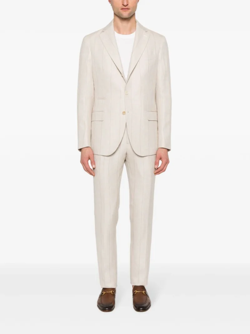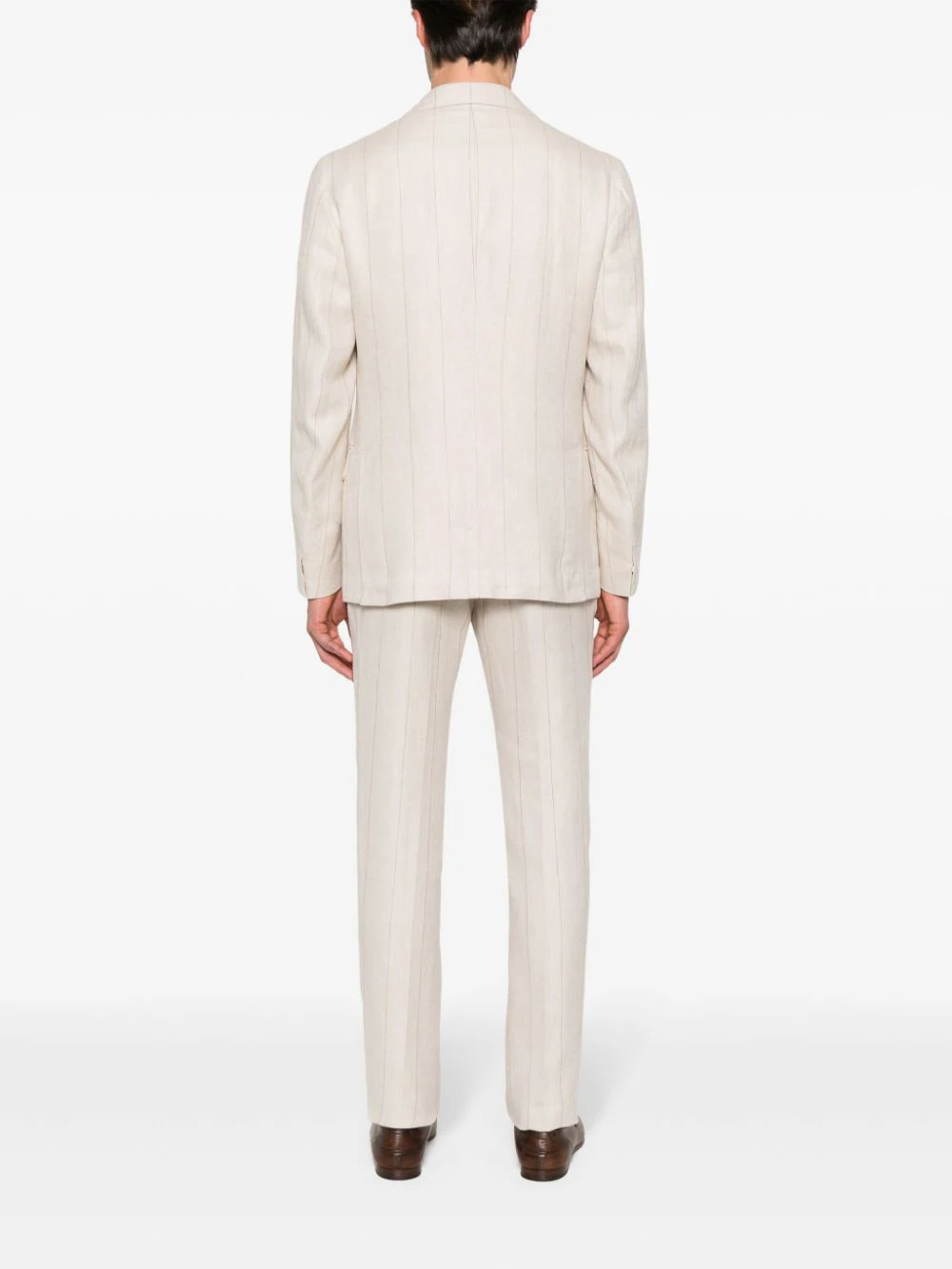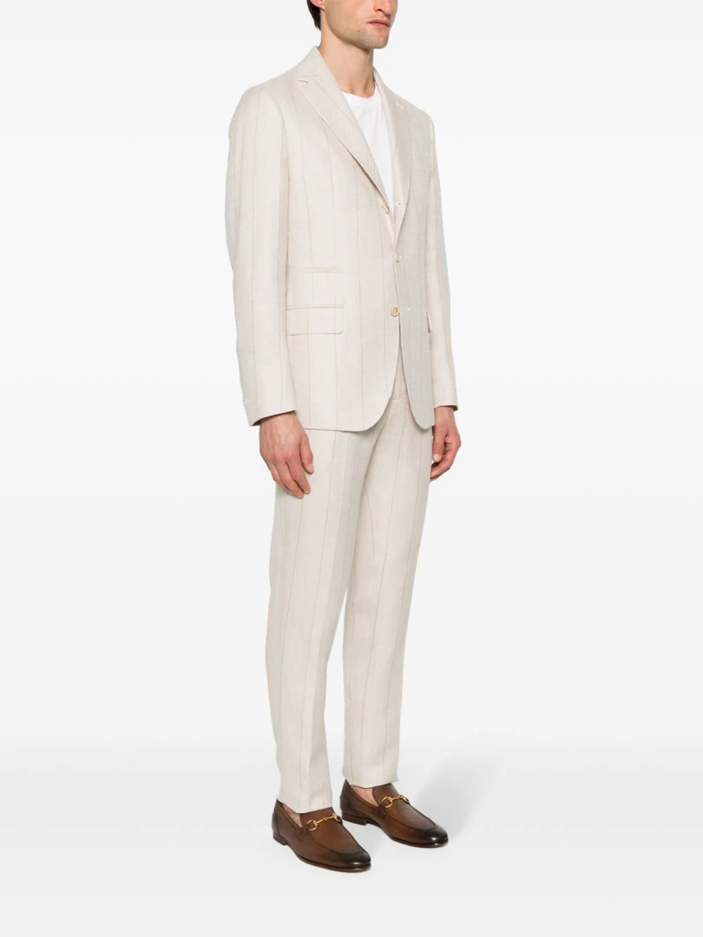 Costum bej din in, format din sacou cu rever crestat, inchidere cu nasturi, maneci lungi, mansete cu nasturi, buzunar tip welt la piept, captuseala din viscoza si pantaloni slim fit, cu buzunare laterale si buzunare la spate tip welt. Potrivit pentru sezonul primavara/vara. 74% in; 24% lana; 2% matase; 100% viscoza.