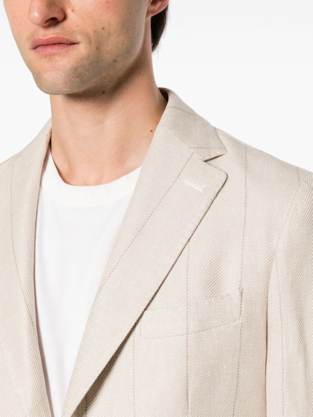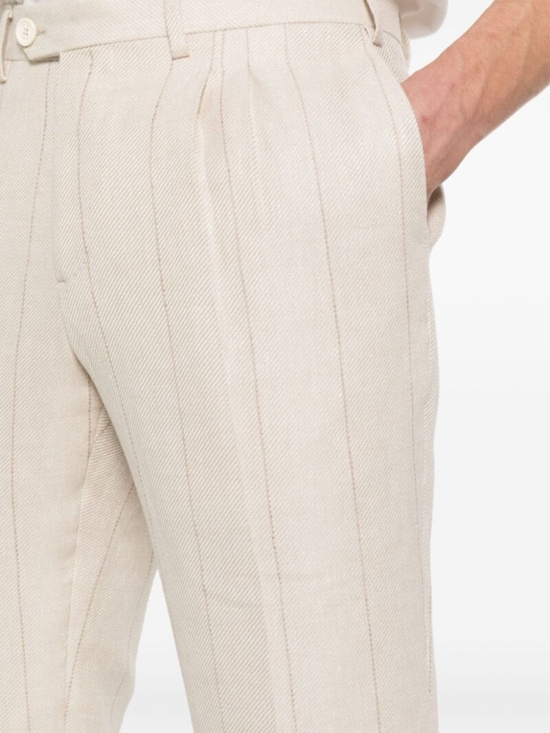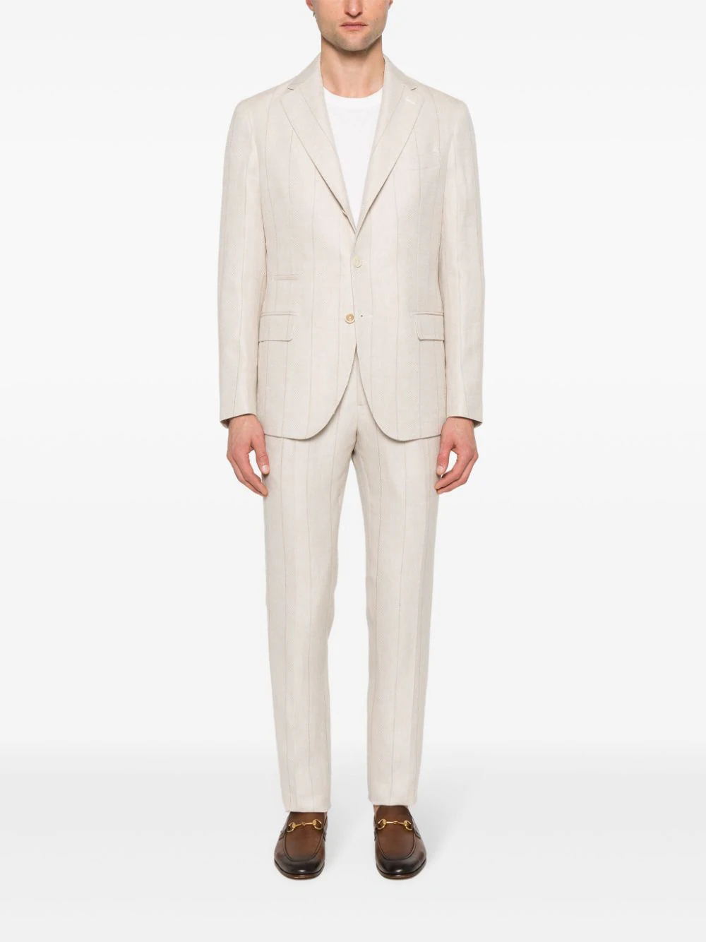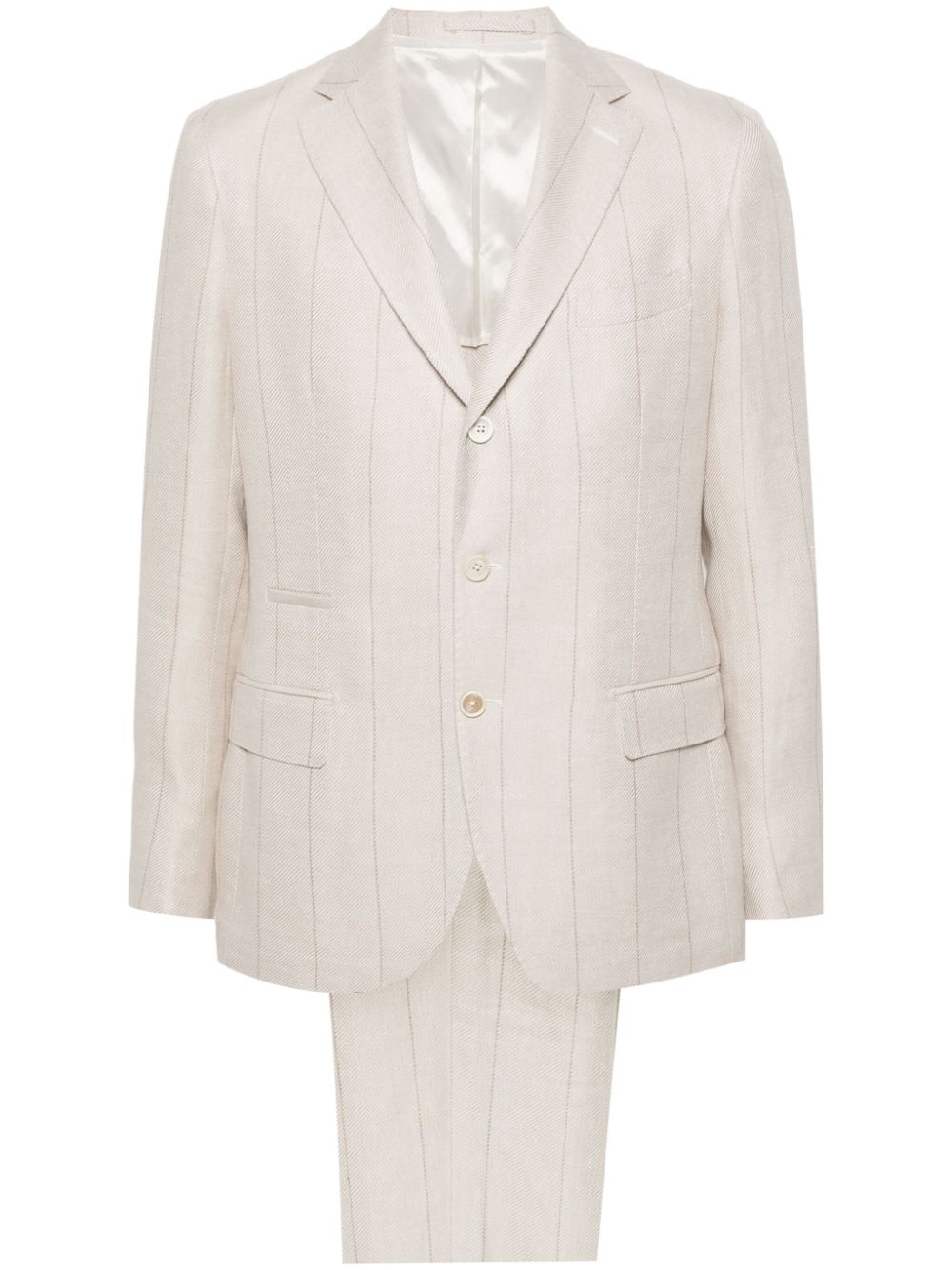 Costum bej din in, format din sacou cu rever crestat, inchidere cu nasturi, maneci lungi, mansete cu nasturi, buzunar tip welt la piept, captuseala din viscoza si pantaloni slim fit, cu buzunare laterale si buzunare la spate tip welt. Potrivit pentru sezonul primavara/vara. 74% in; 24% lana; 2% matase; 100% viscoza.