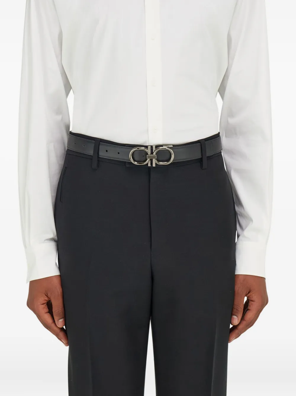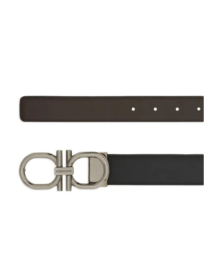 Curea Ferragamo Gancini Reversible maro, din piele, reversibila maro-negru, cu inchidere ajustabila si catarama Gancini cu logo gravat. 100% piele de vitel.